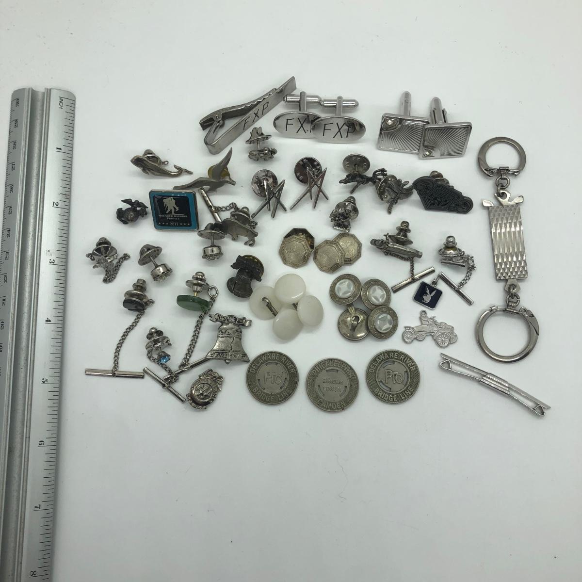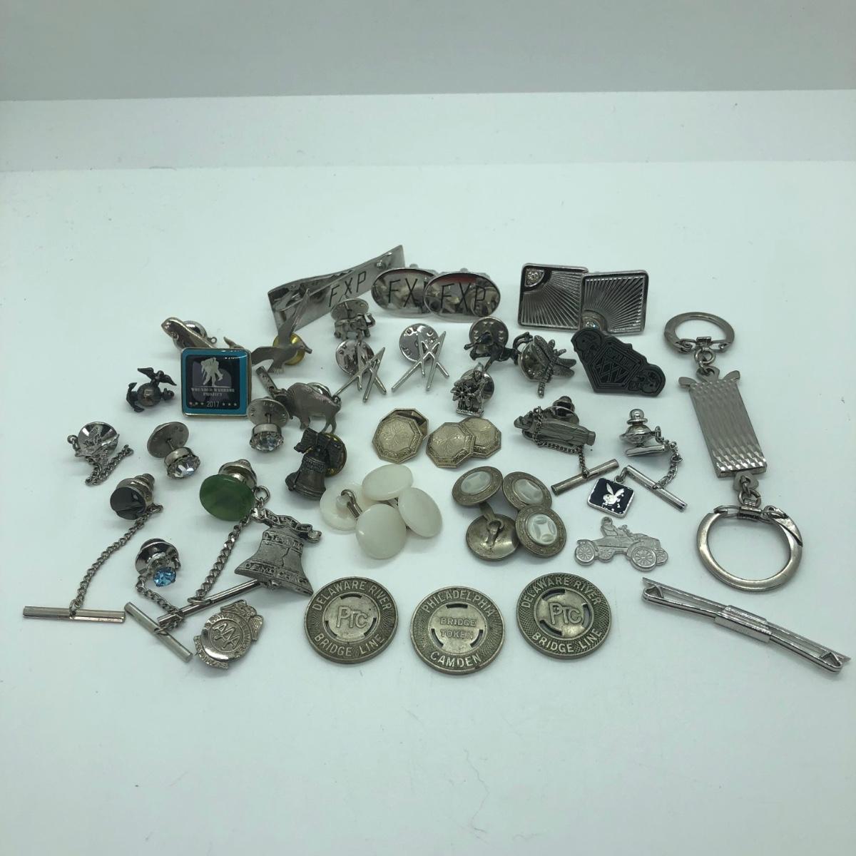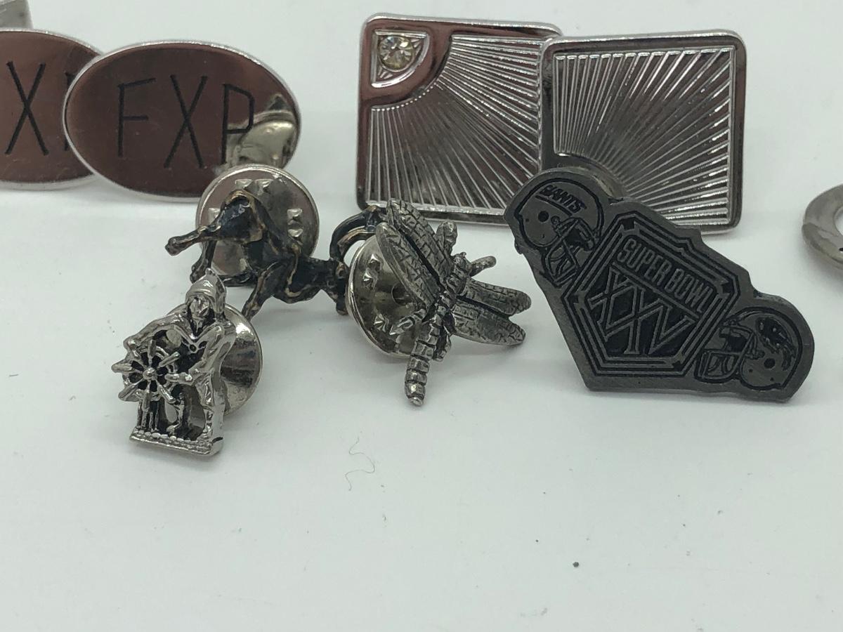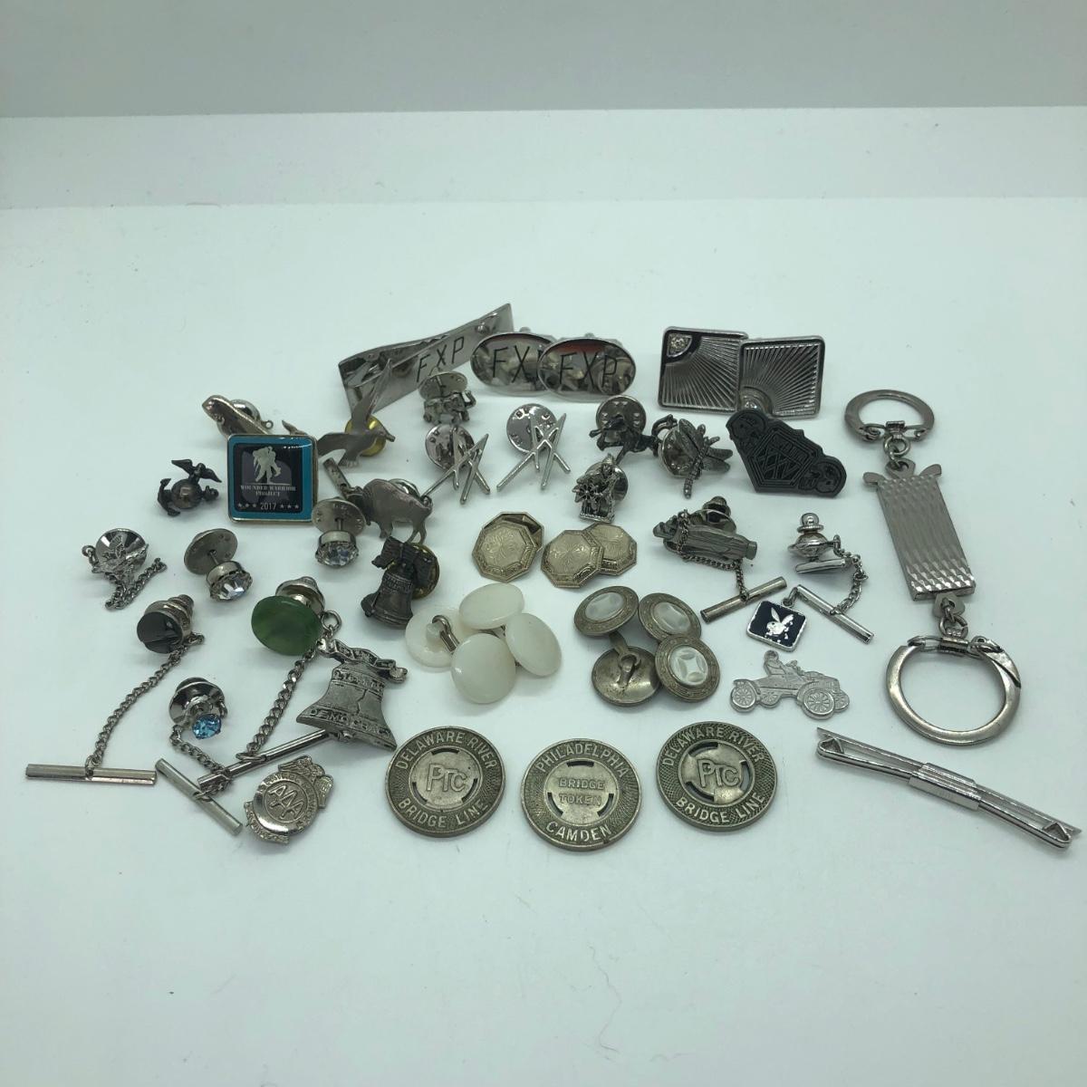 LOT 41J: Silver Tone Collection of Pins, Cufflinks, Tie Tacks & More