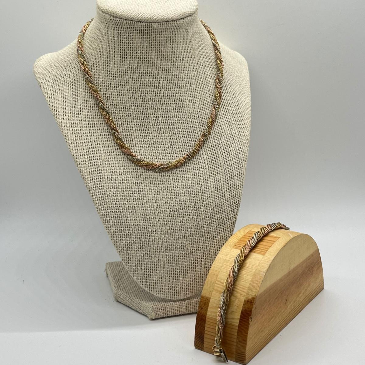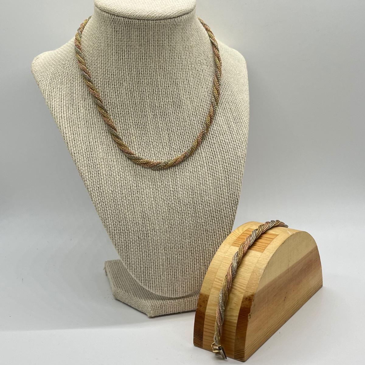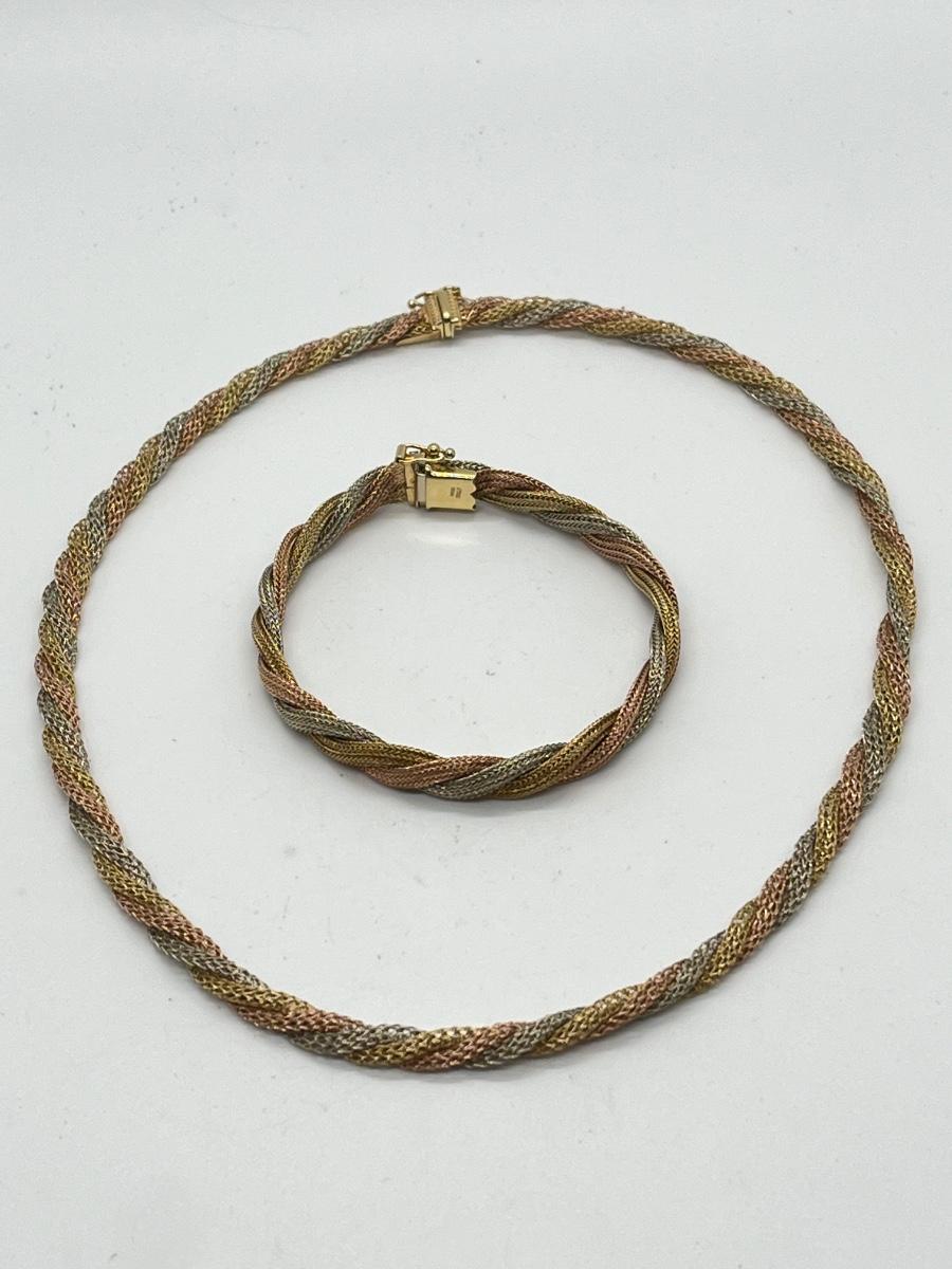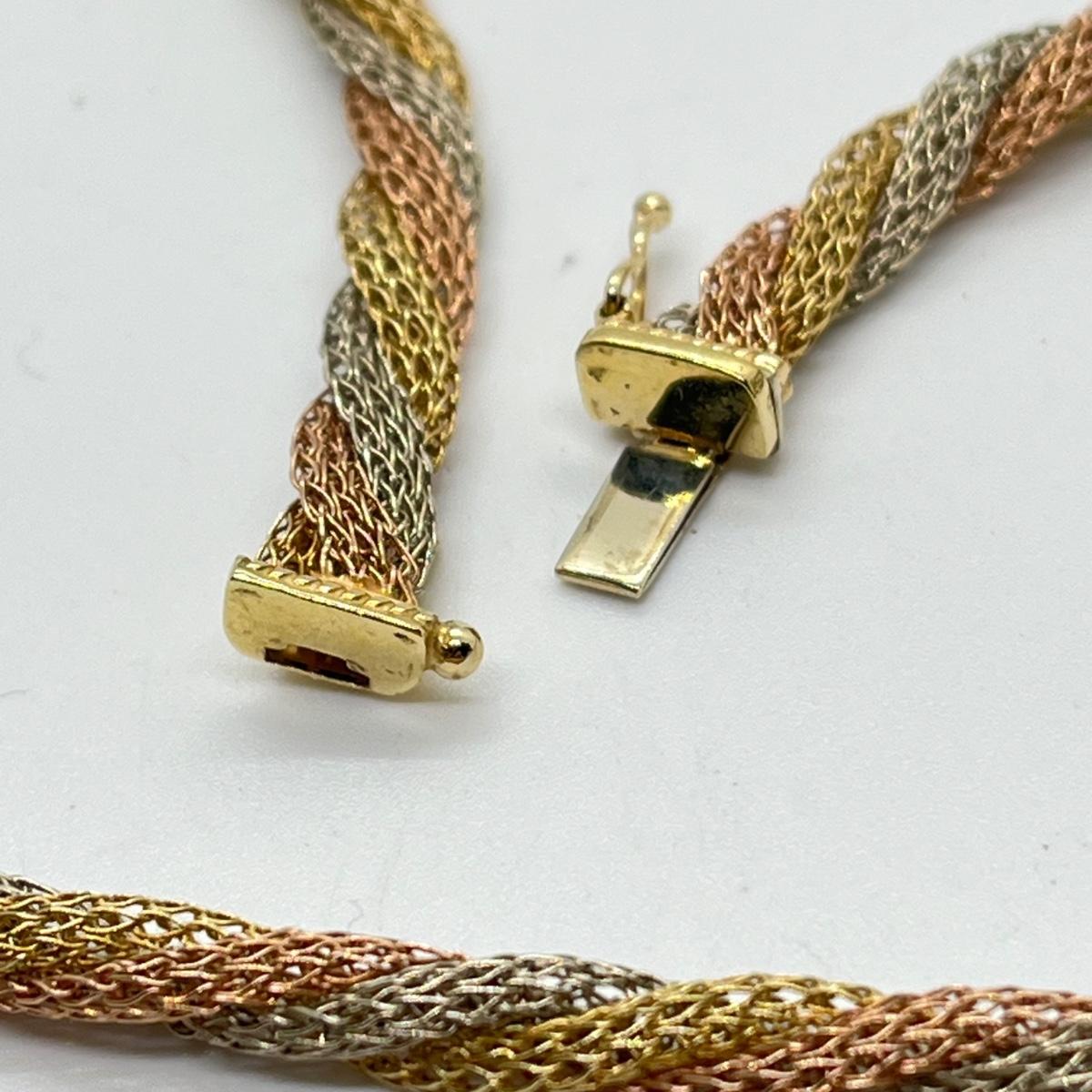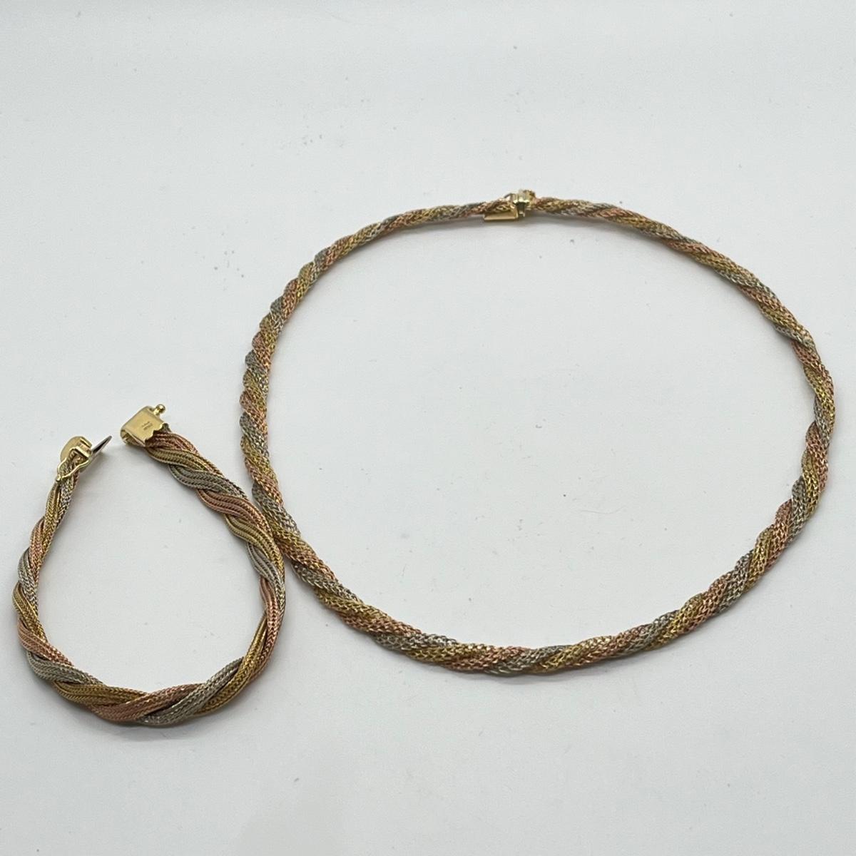 LOT 87J: 14K Italian Yellow, Rose and White Gold Woven Braided Wheat Link Mesh Bracelet and Necklace