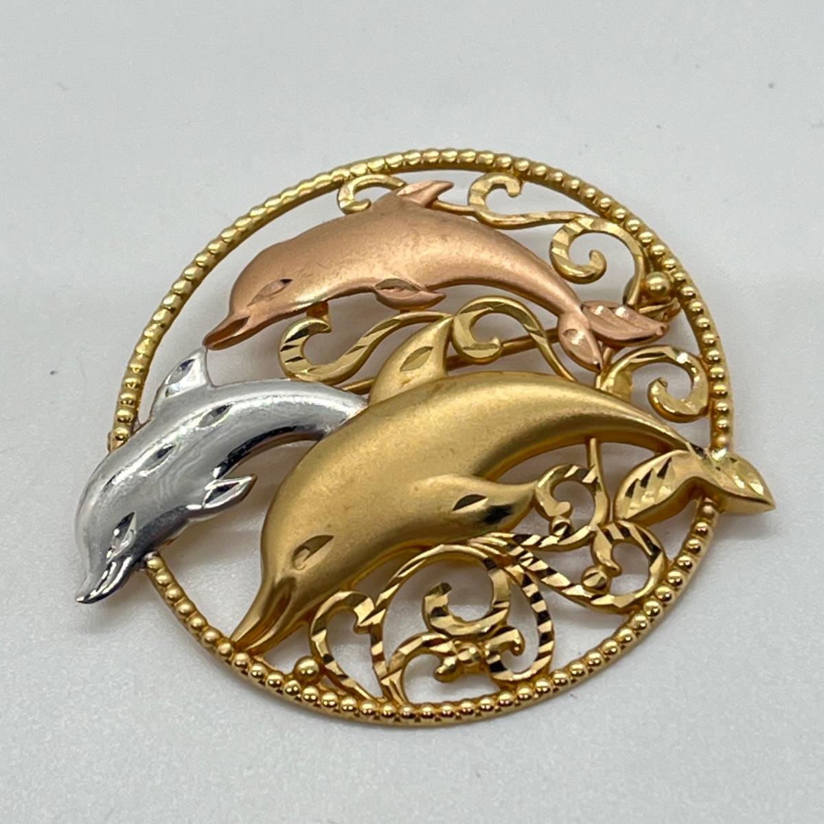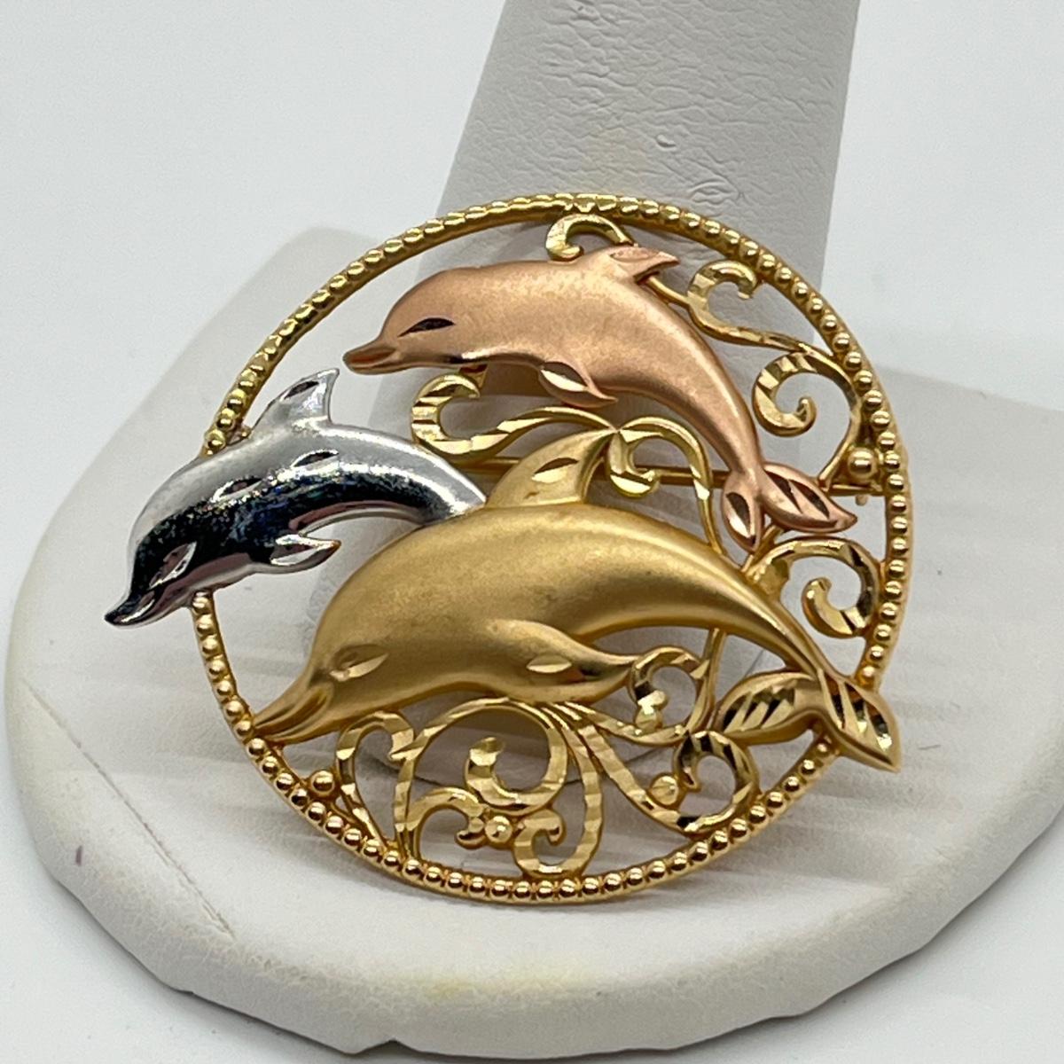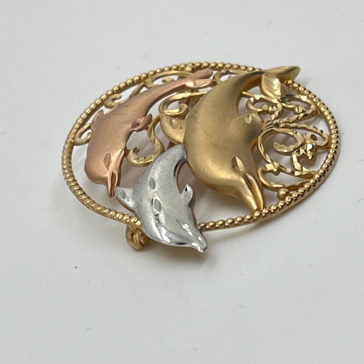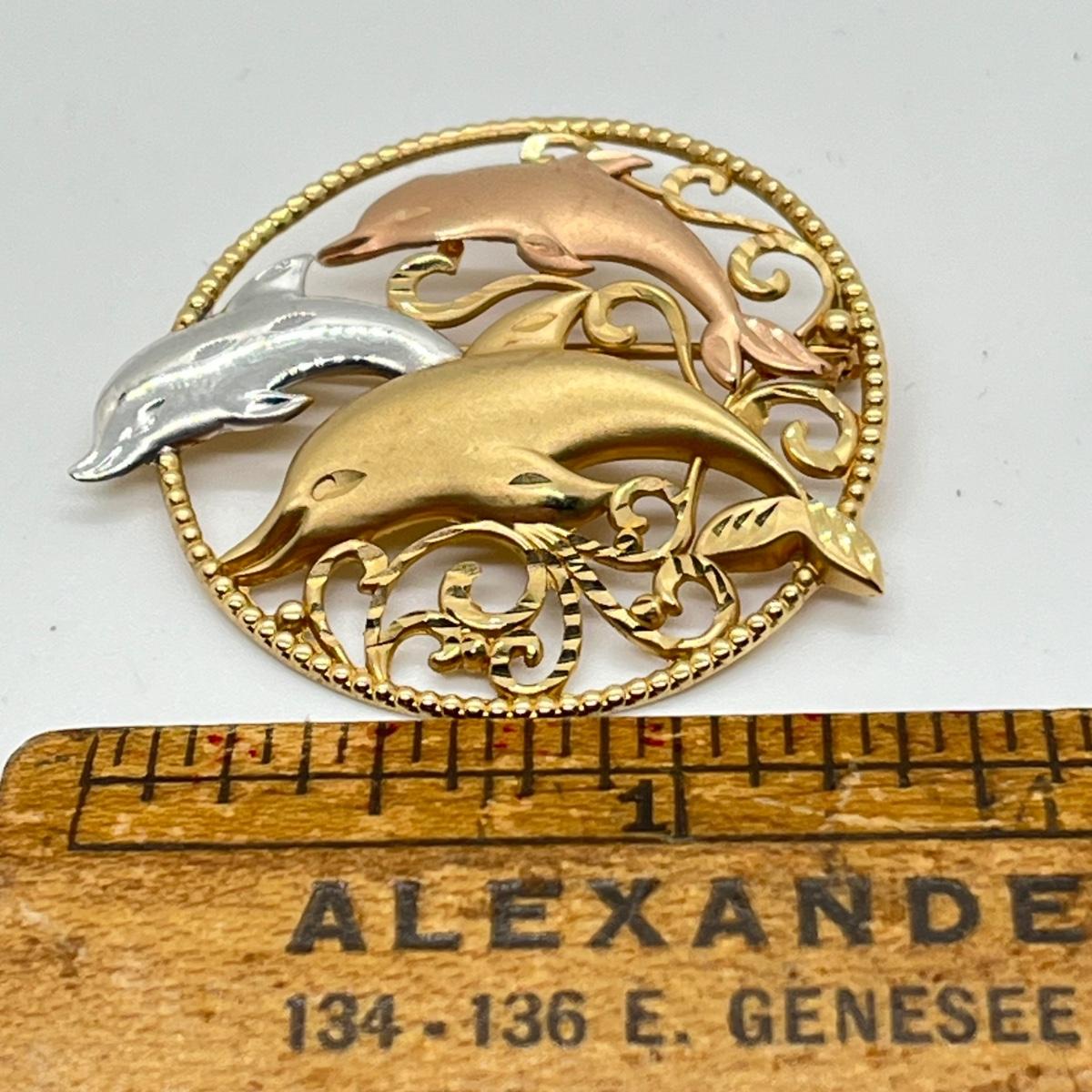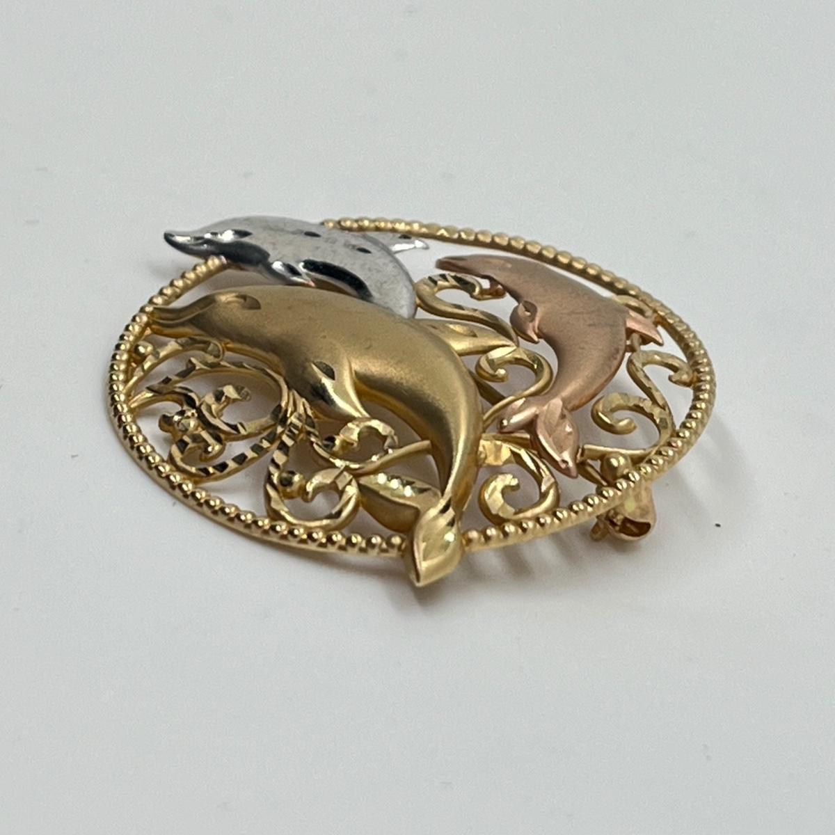 LOT 98J: Michael Anthony's Vintage 14K Tri-Color Yellow, Rose and White Gold Circular Filigree Three Dolphin Brooch - 4.5 grams