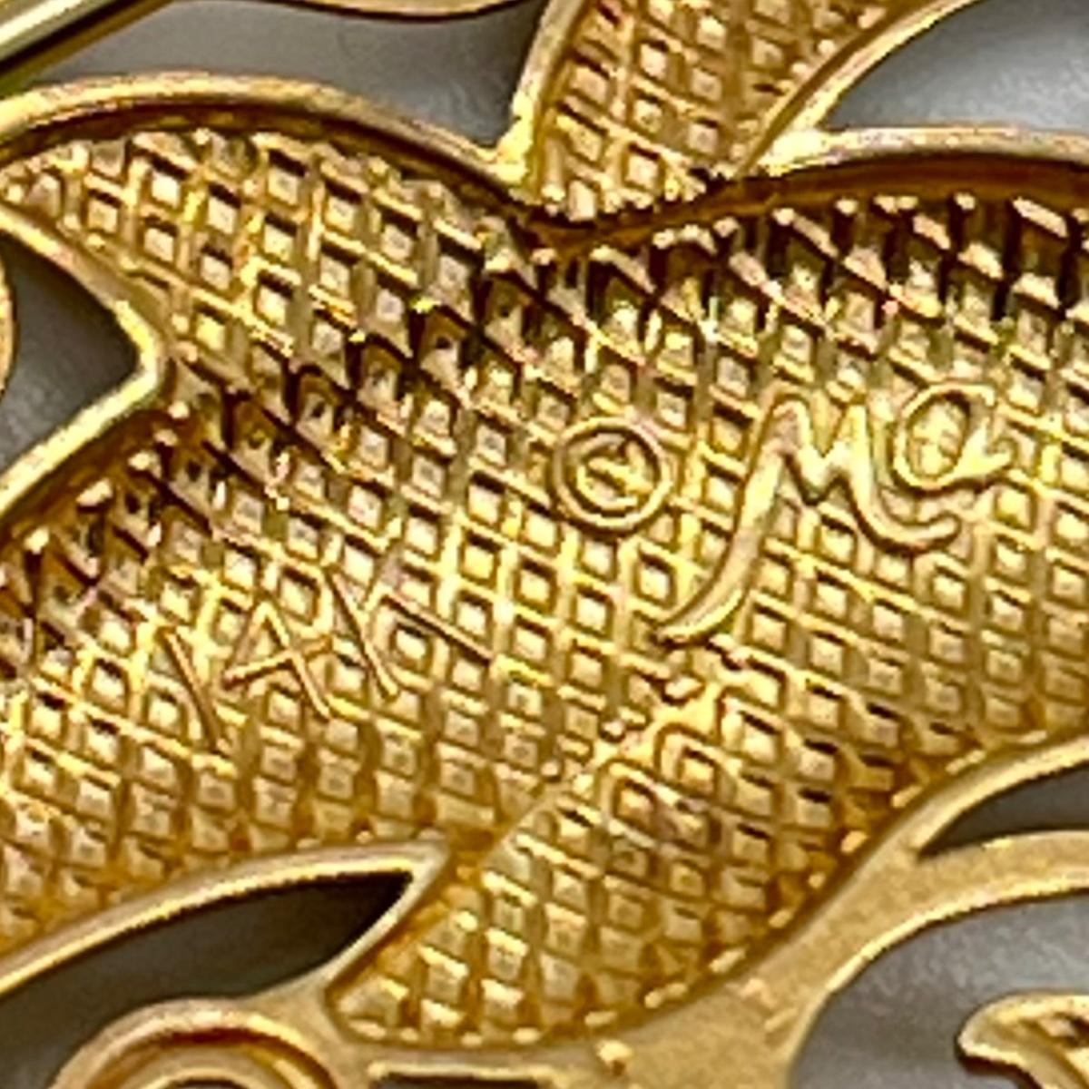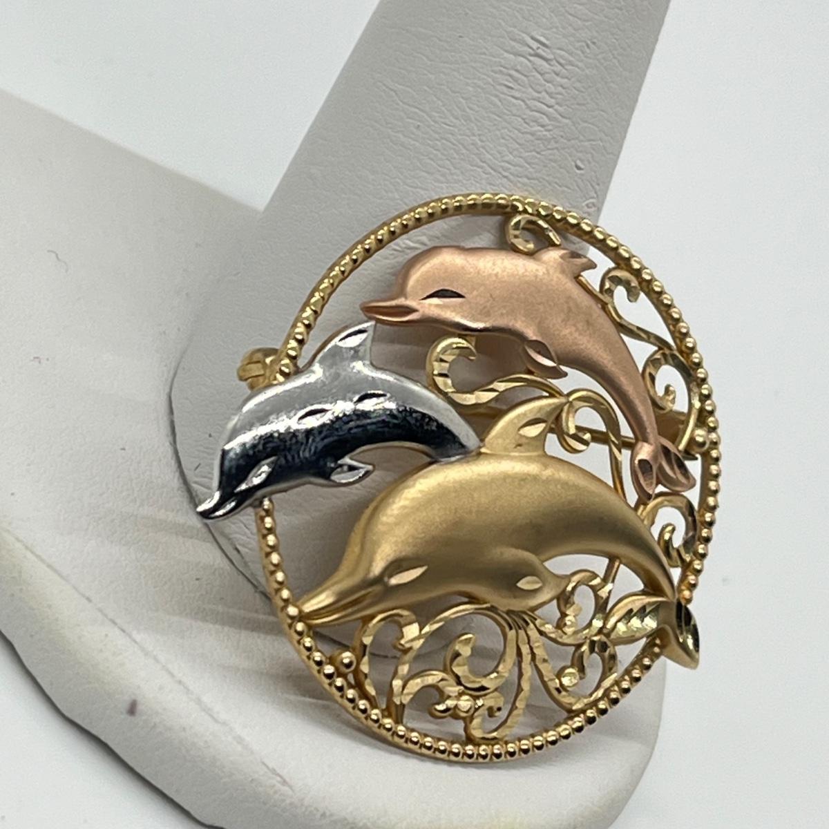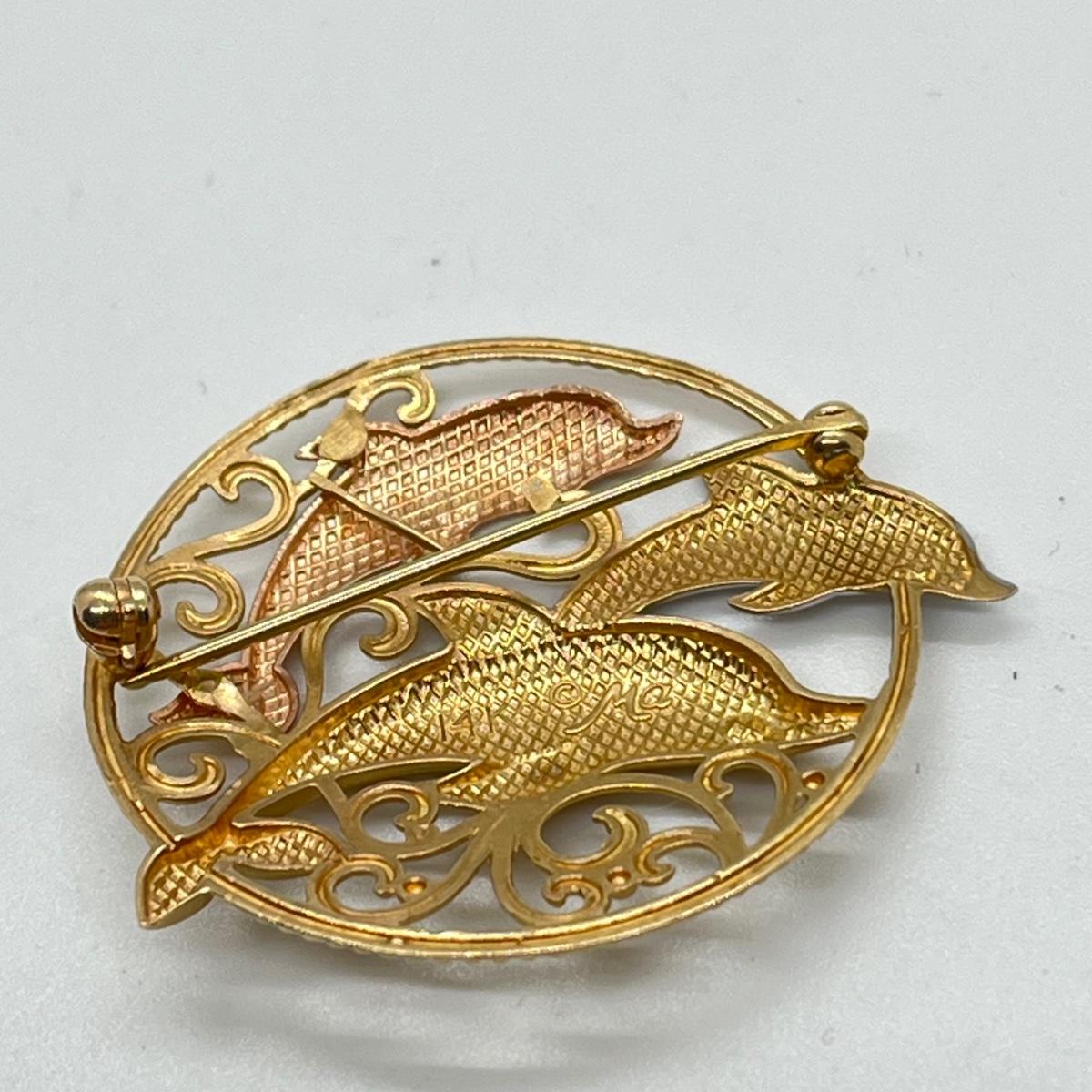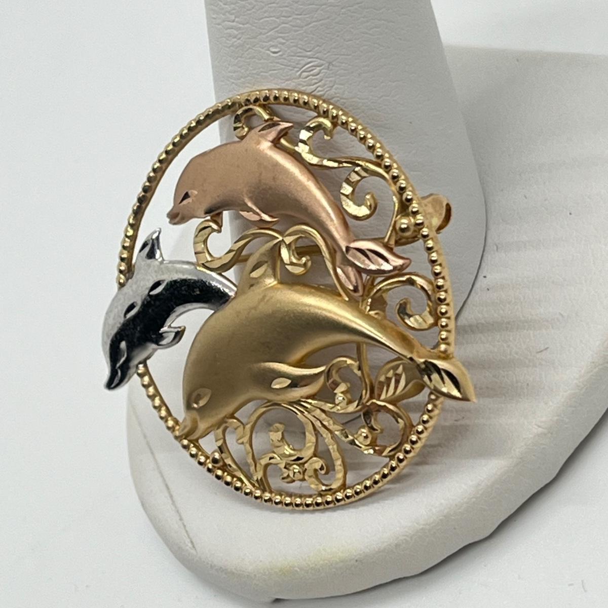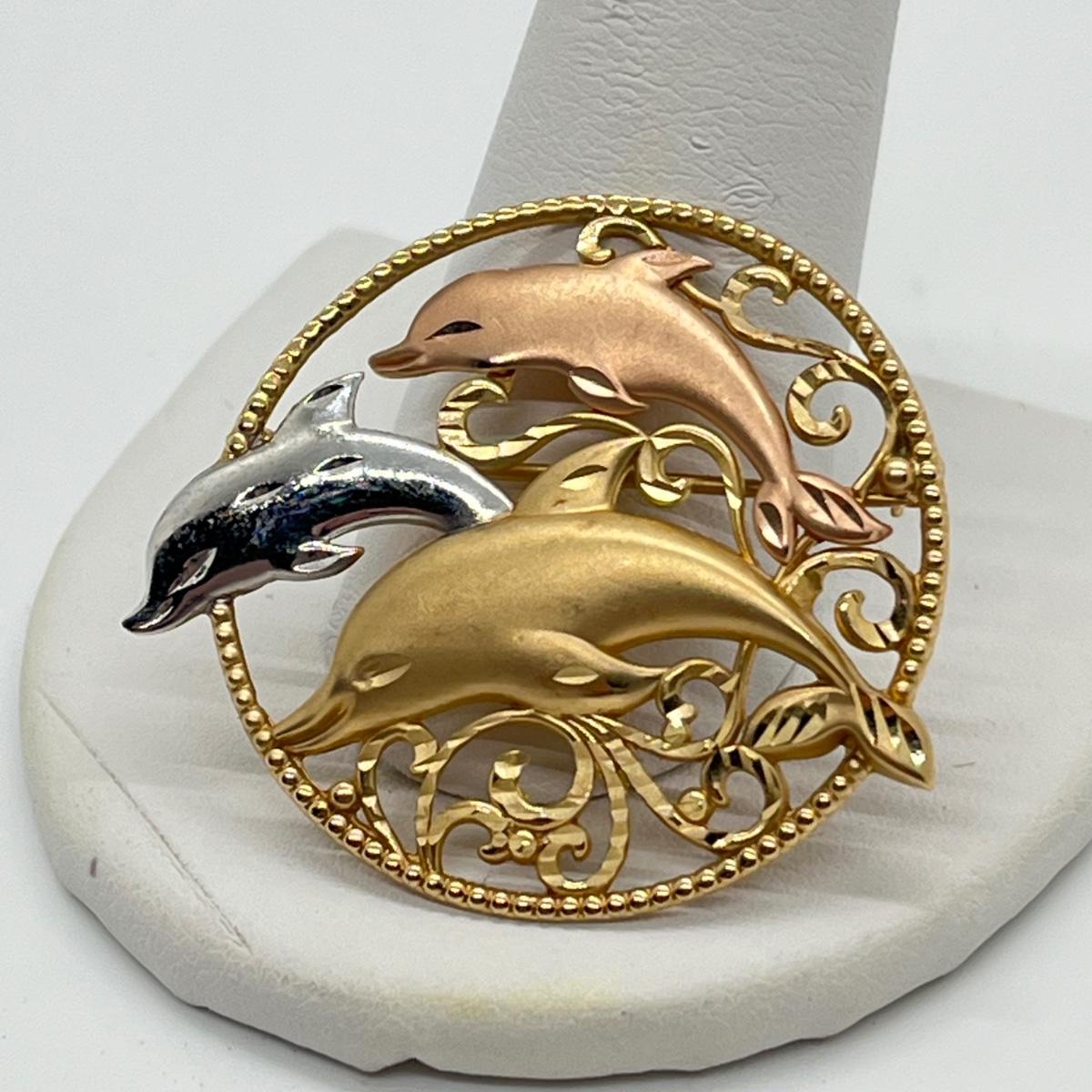 LOT 98J: Michael Anthony's Vintage 14K Tri-Color Yellow, Rose and White Gold Circular Filigree Three Dolphin Brooch - 4.5 grams