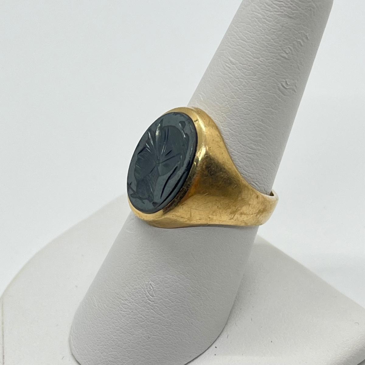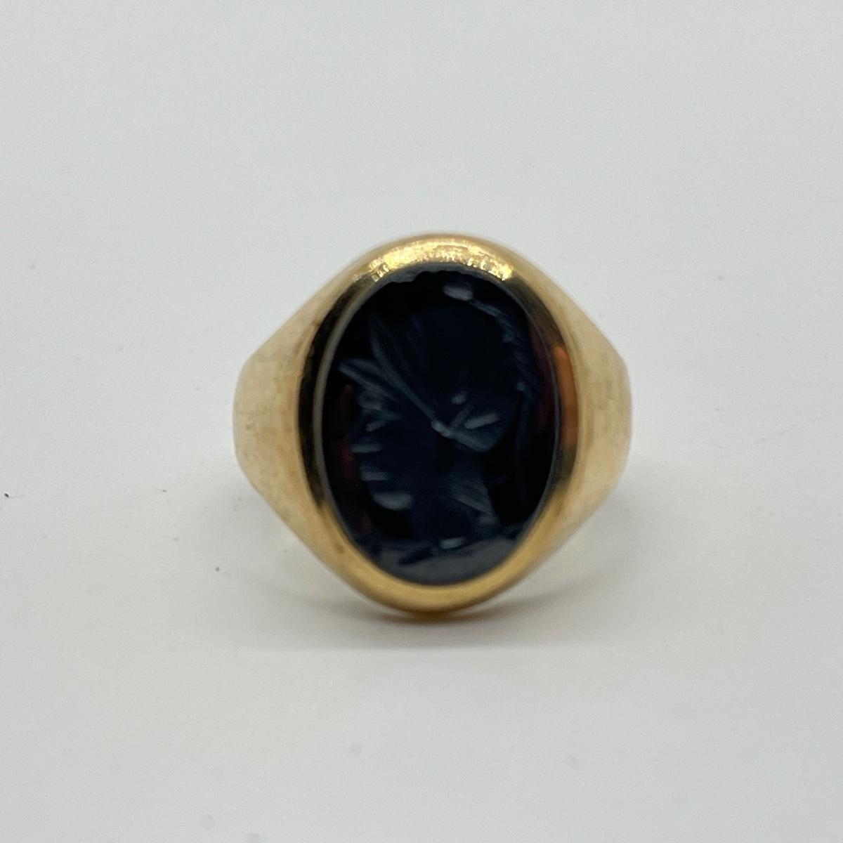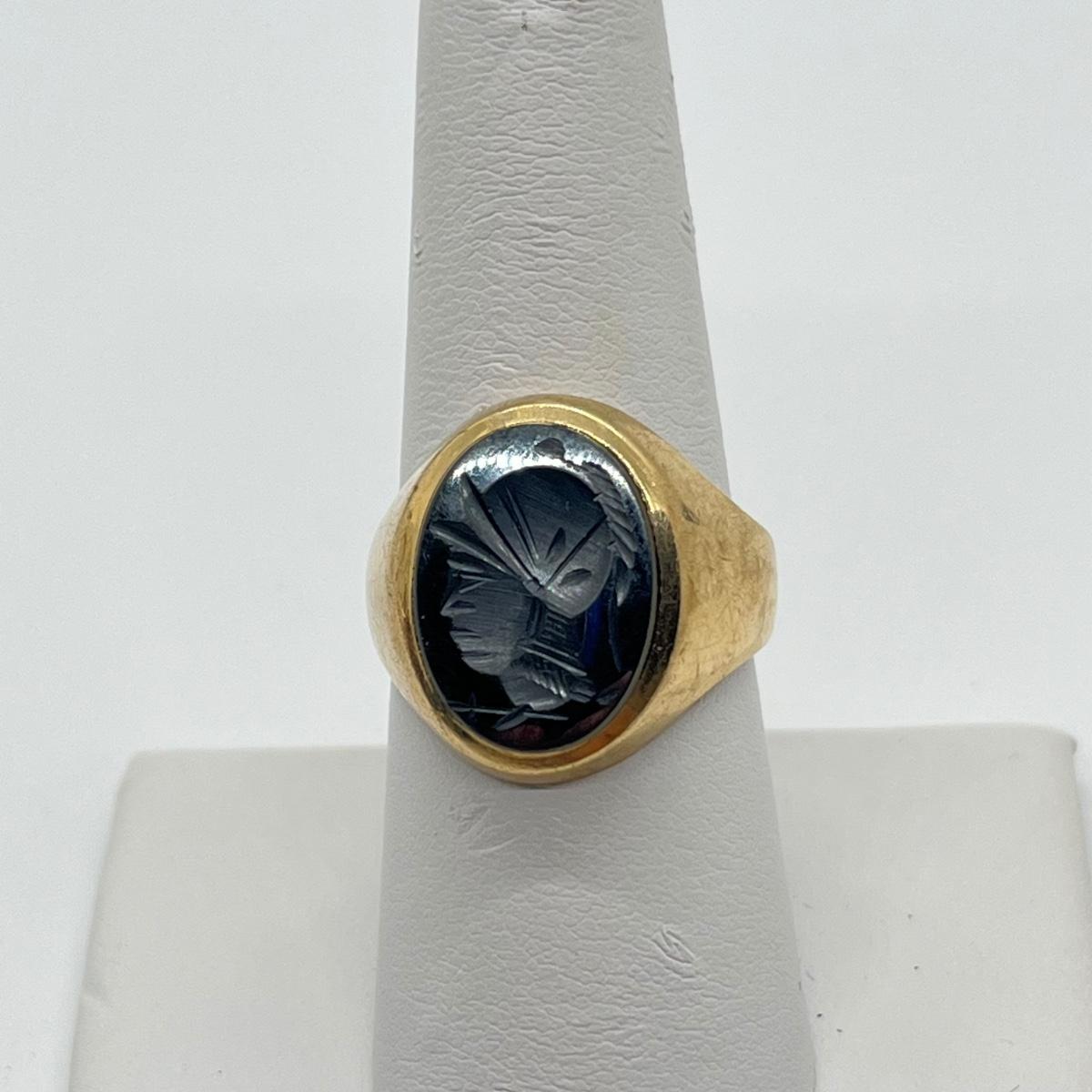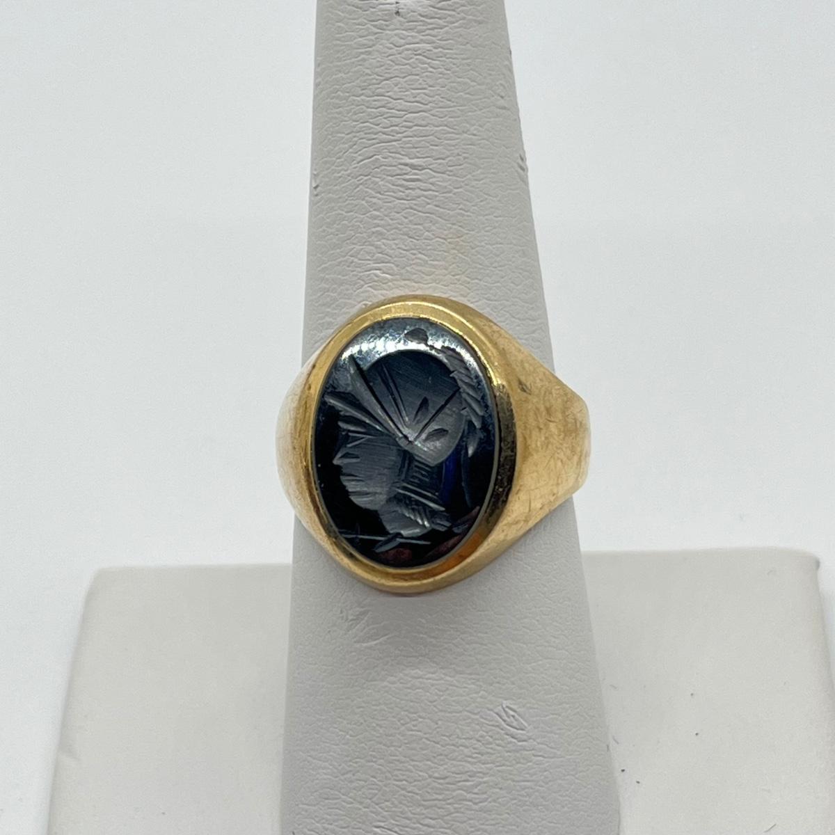LOT 99J: Vintage 8.3g 10K Yellow Gold Hematite Intaglio Trojan Ring sz 7.5