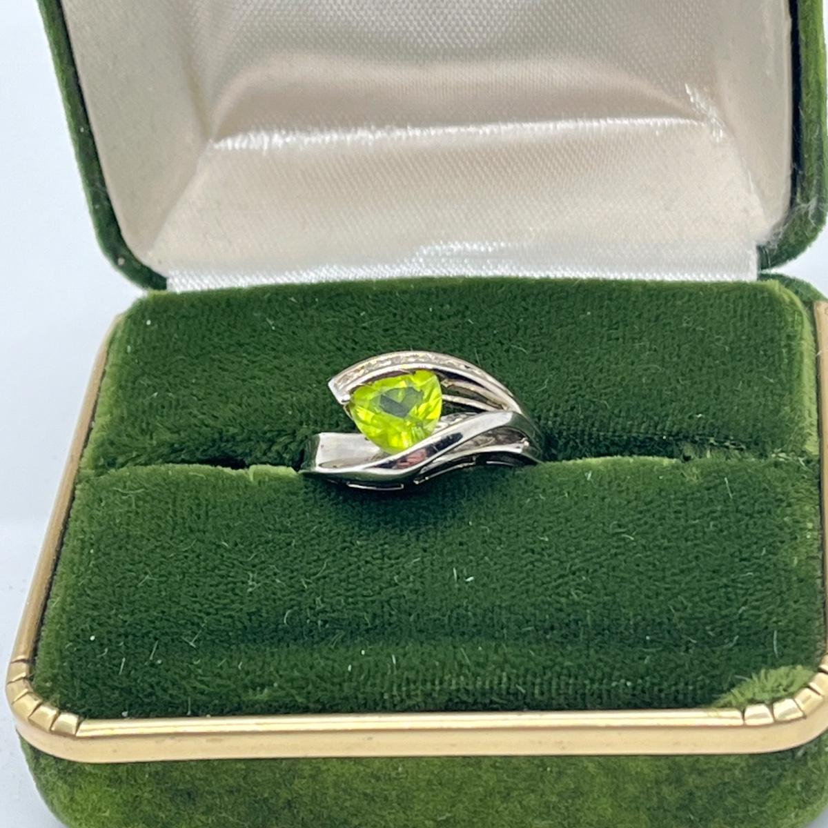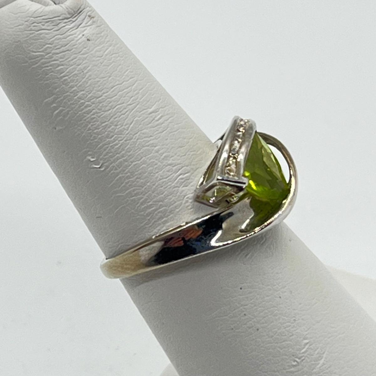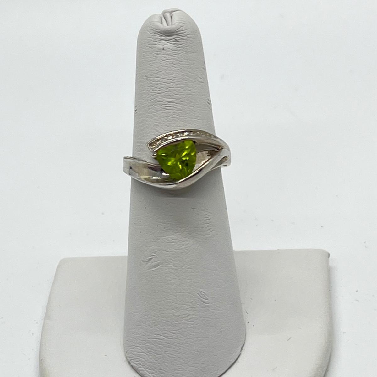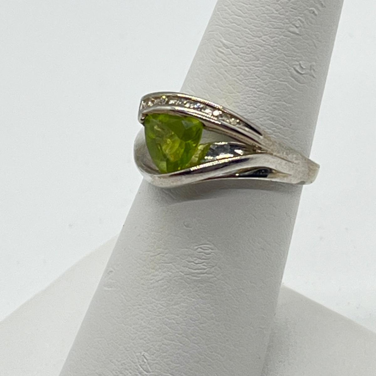LOT 101J: 10K White Gold Ring with Trillion Cut Peridot with Accents. Sz 6