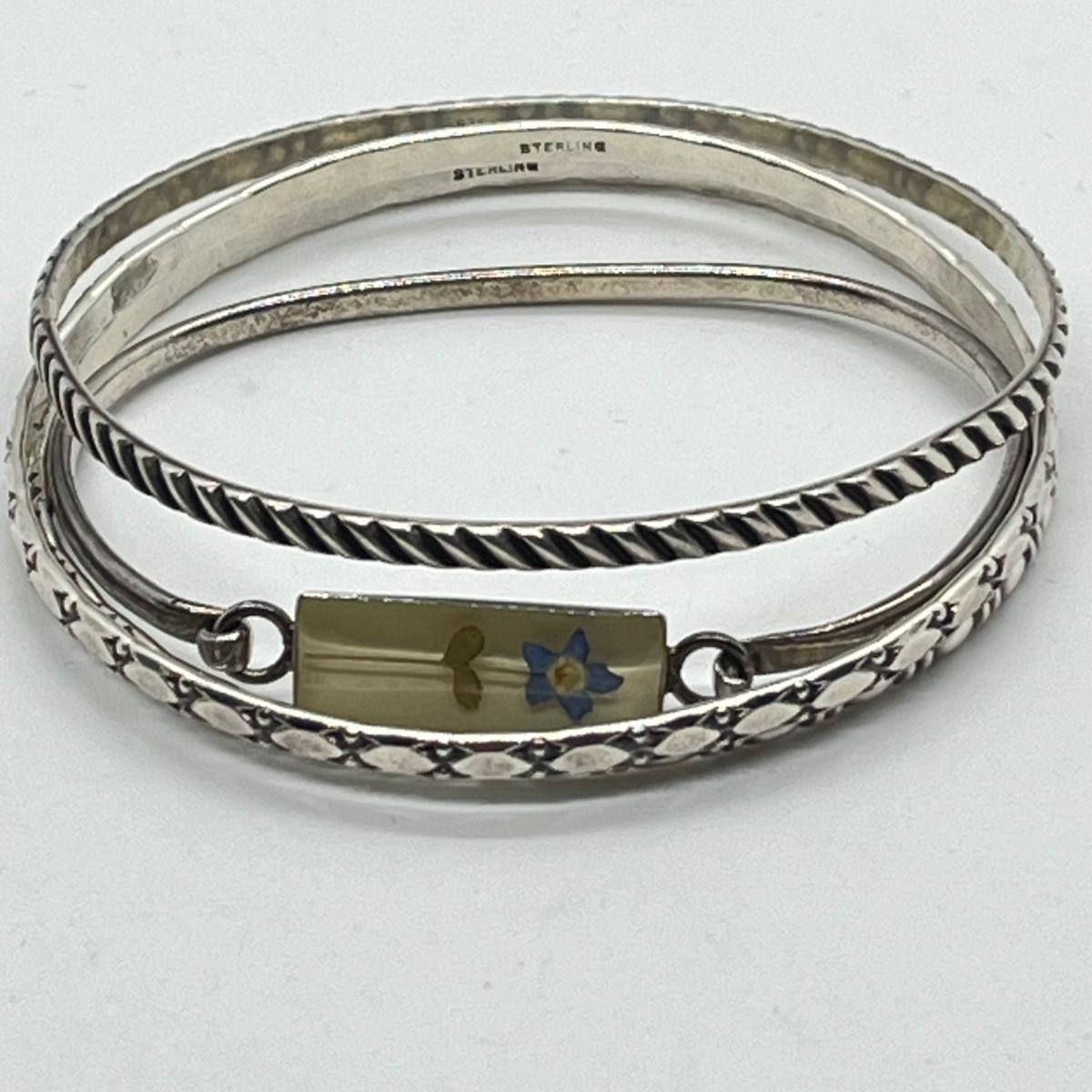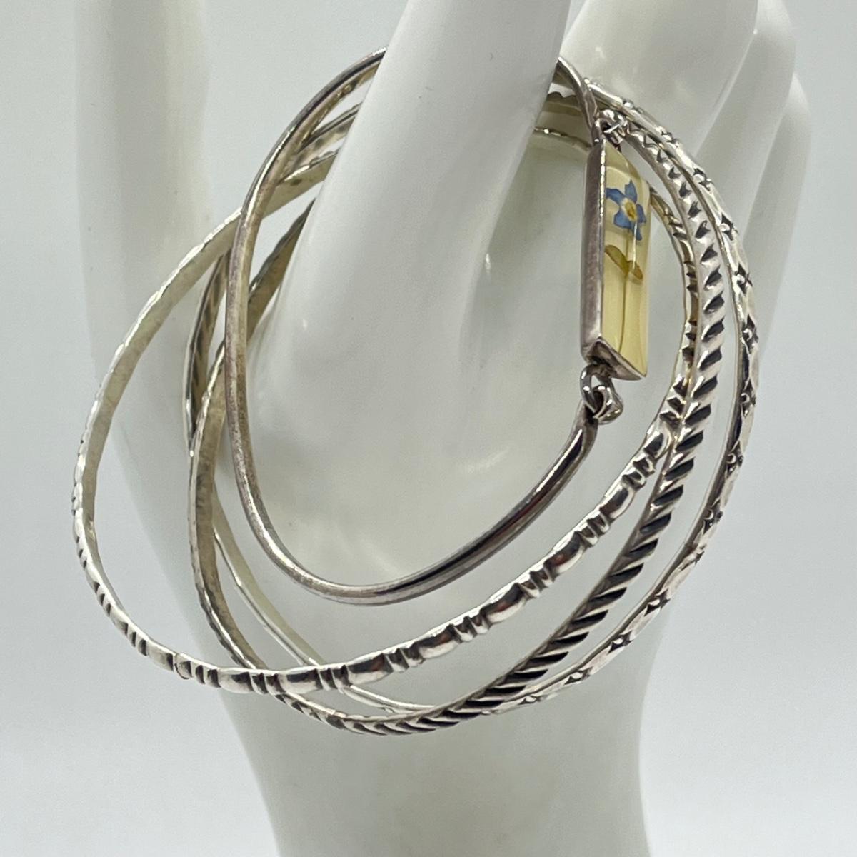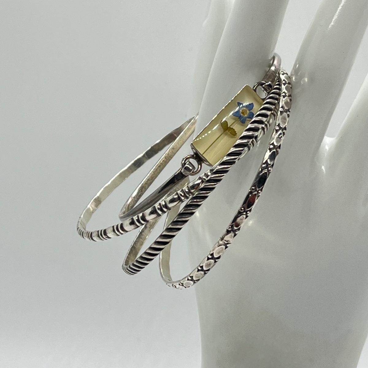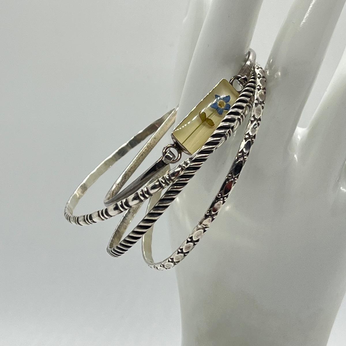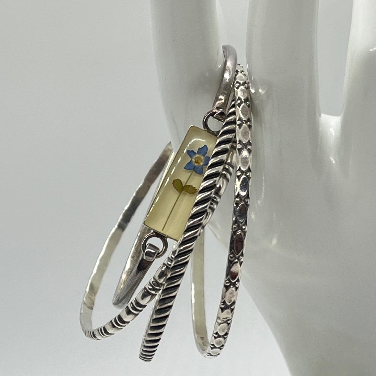 LOT 114J: Vintage 925 Sterling Silver "Forget Me Not" Flower Hinged Bangle Bracelet plus Three Sterling Silver Bangles