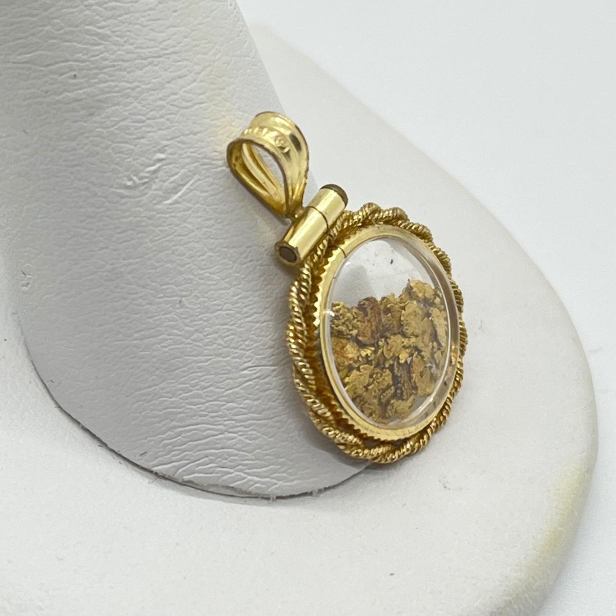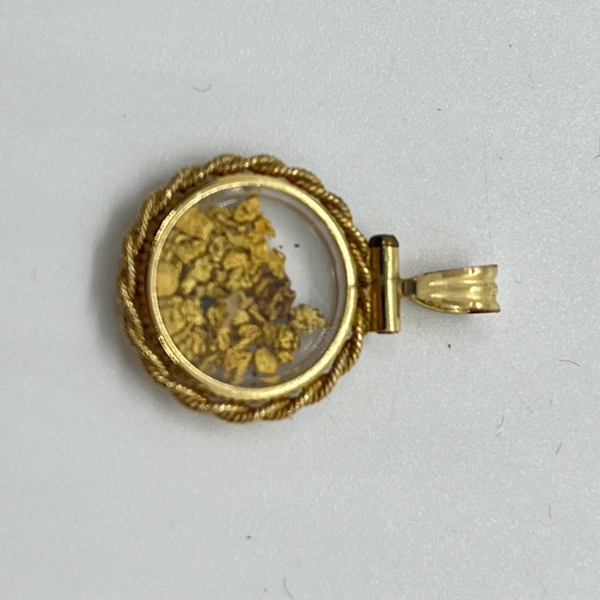 This darling bubble locket pendant is filled full of genuine gold nuggets. The bubble locket is clear on both sides. It has a faceted edge crystal and a rope frame. Please see all pictures as they are the best representation of the items. The pictures show condition, measurements if taken, and what is included in the lot. Due to the large amount that we photograph and the time frame, we are not always able to take measurements. All items unless noted, are pre-owned and have been used. If you purchased furniture, you must bring help. We do not allow one person to carry large furniture out on their own. Bring help, tools and a truck for the safety of our client’s homes, and your personal safety. Any damages that result to the property including walls, and floors due to moving of the furniture will be charged to the buyer. Company policy. Thank you.