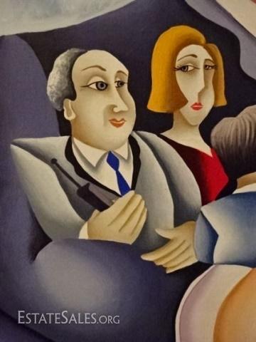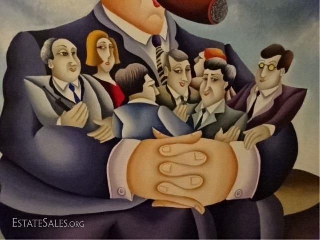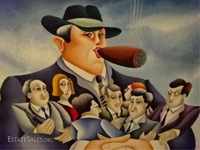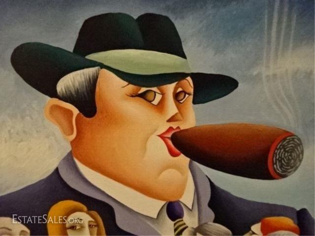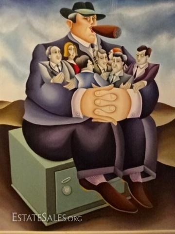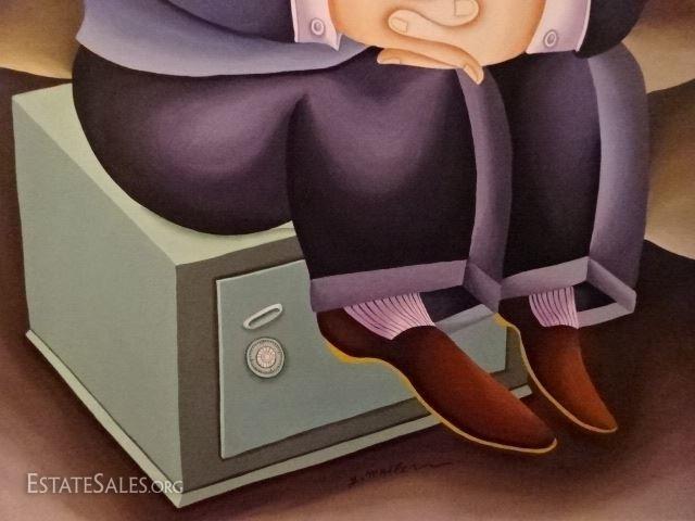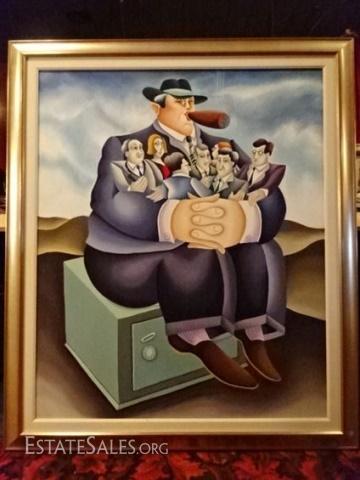 LOT 101A: HUGE YUVAL MAHLER OIL ON CANVAS PAINTING, MAN WITH CIGAR ON SAFE, SIGNED LOWER CENTER, VERY GOOD CONDITION, FRAMED SIZE 59"H X 50"W, SKU365.42