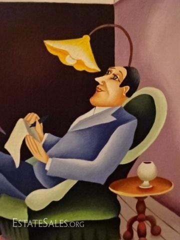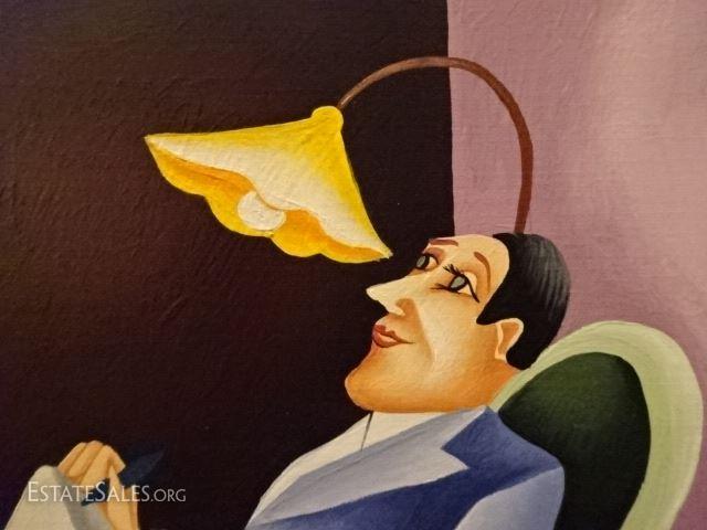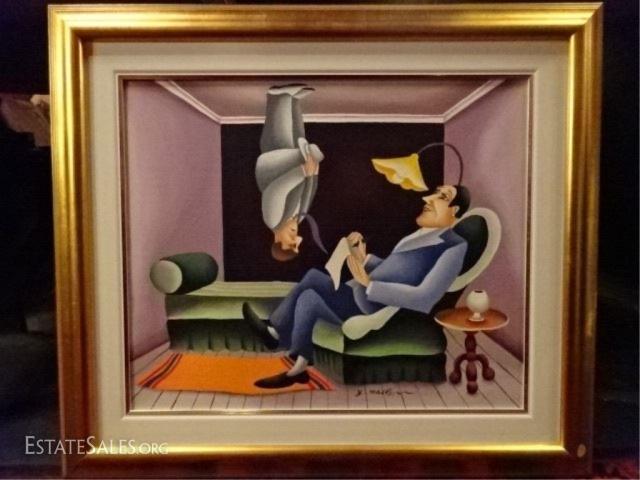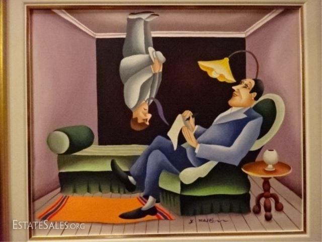 LOT 101C: YUVAL MAHLER OIL ON CANVAS PAINTING, MAN ON CEILING WITH PSYCHIATRIST, SIGNED LOWER RIGHT, VERY GOOD CONDITION, FRAMED SIZE 31.5"W X 28"H, SKU365.42