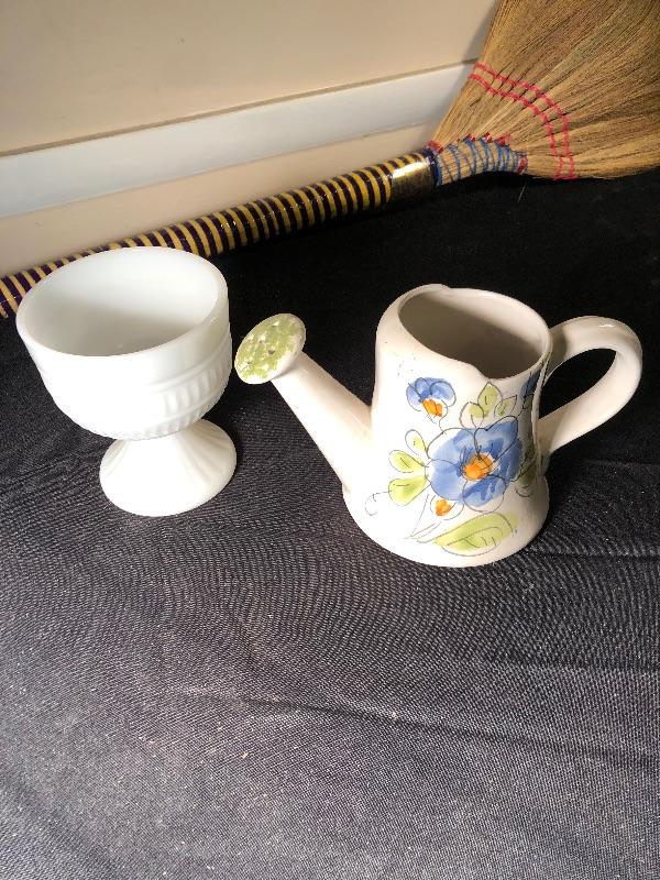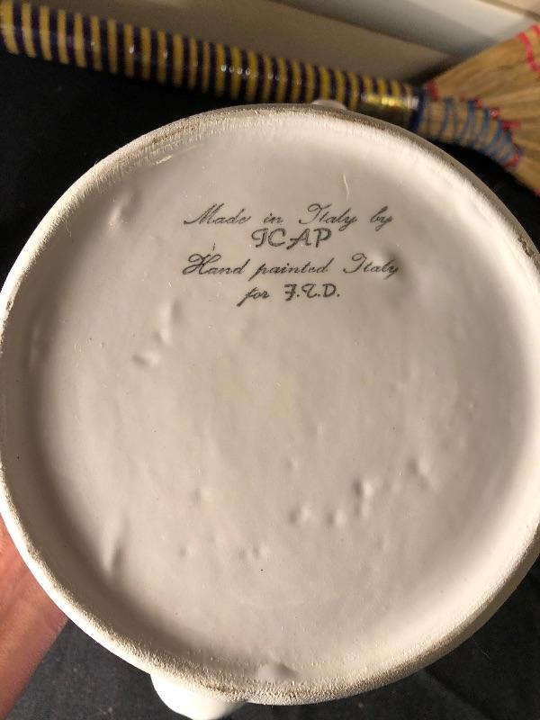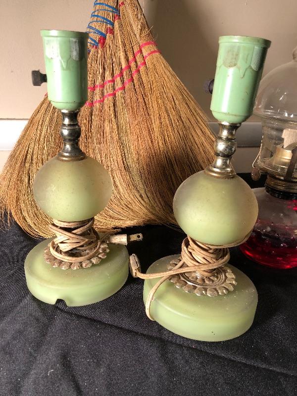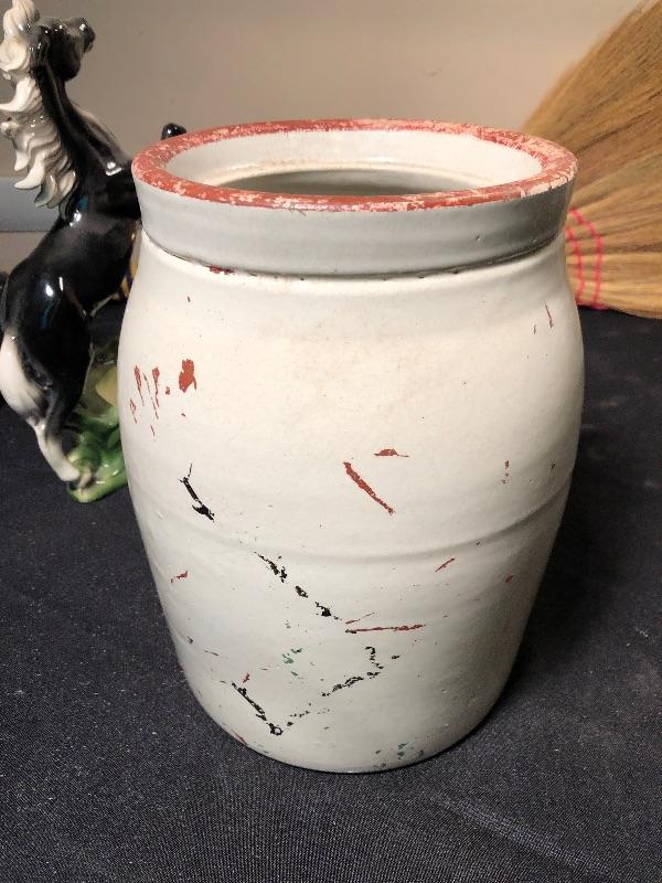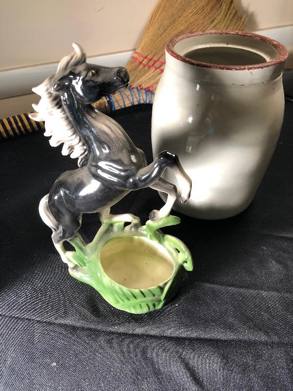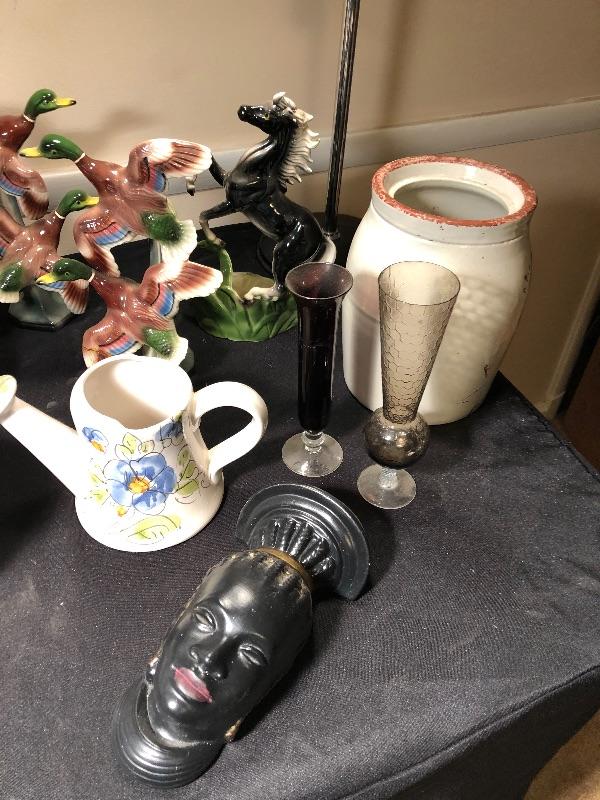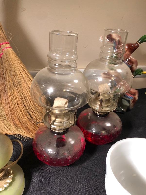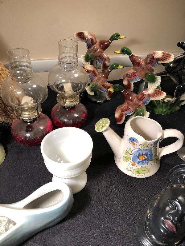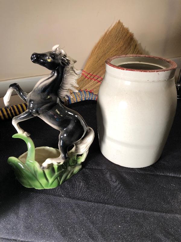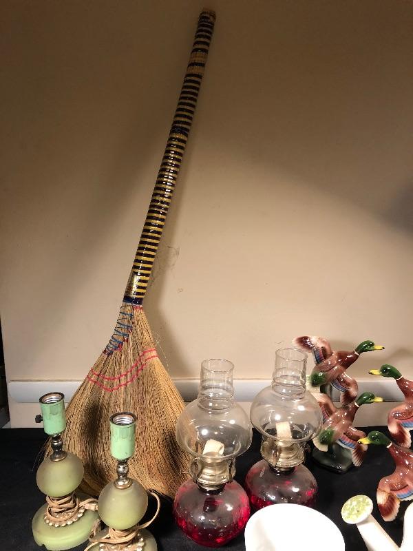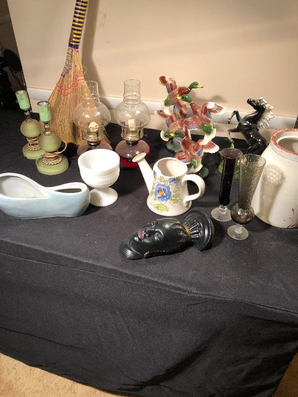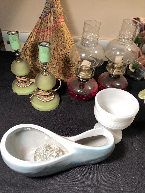 Lot 101- Oil Lanters, Home Decor, Vases, Milk Glass, Crock, Holy Ghost Broom, Italy Pottery