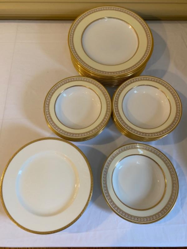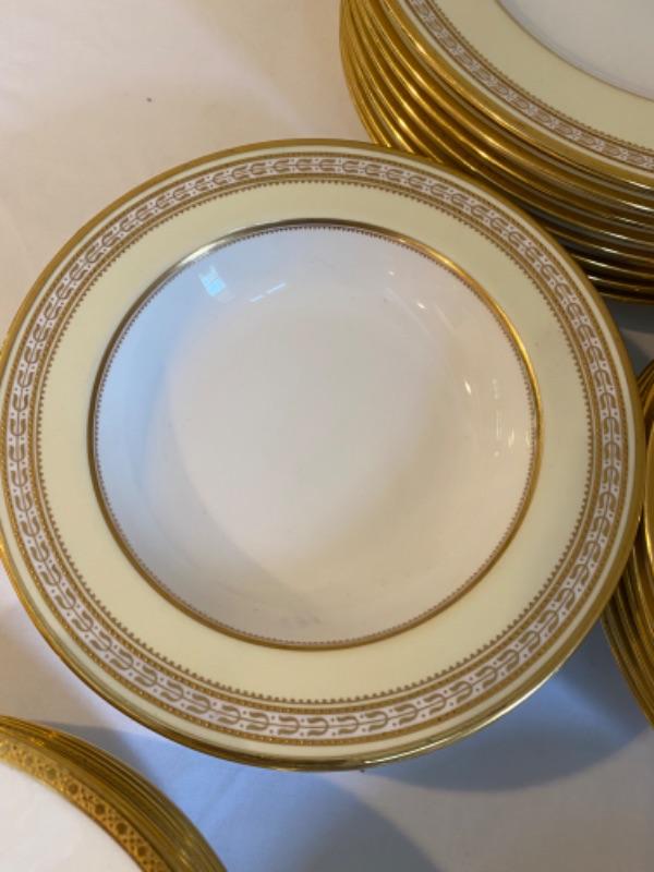 Beautiful 20 piece set of Spode Copeland yellow rim beaded gold laurel rim china set.