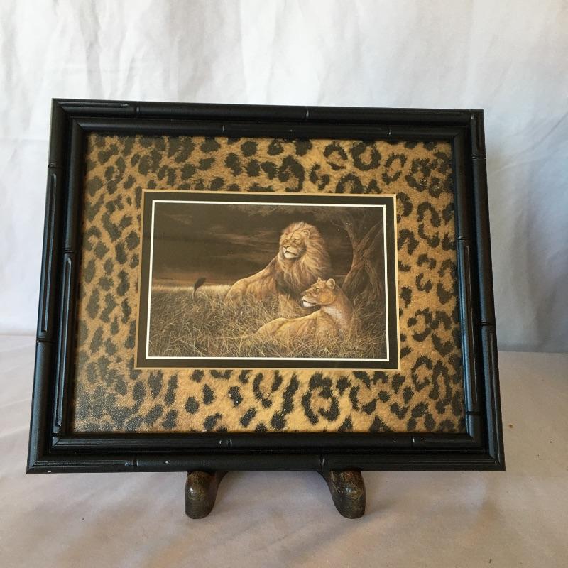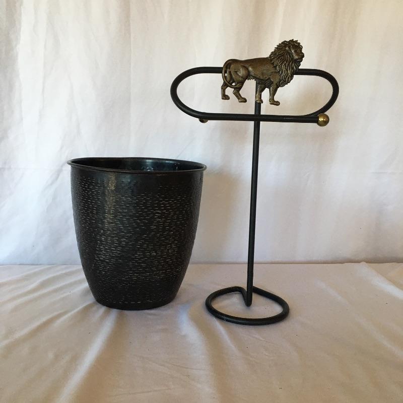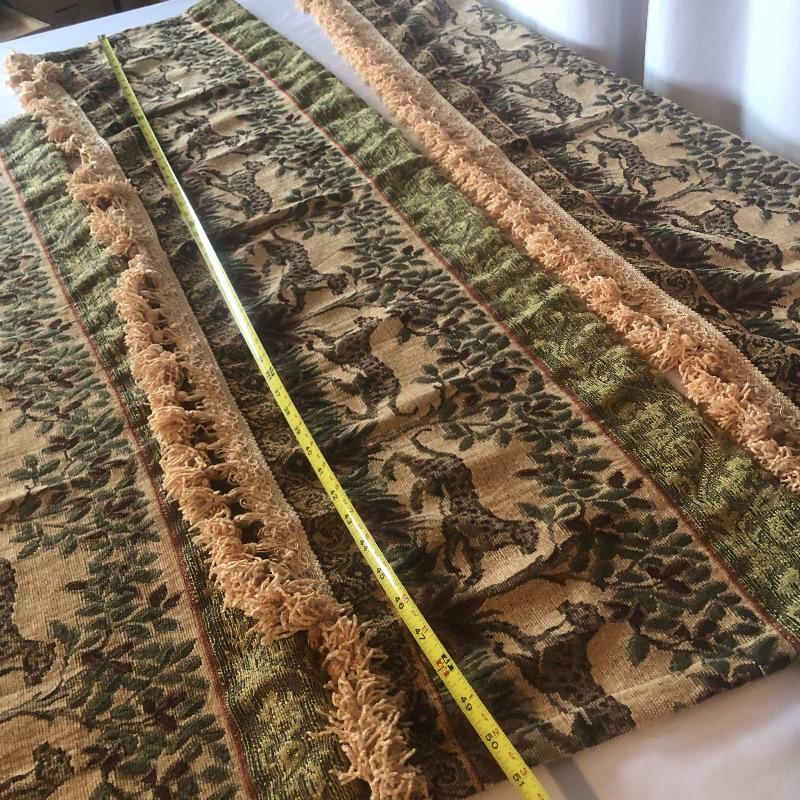 Add a little spice to your bathroom with this leopard themed bathroom set that includes two soap dishes, lotion dispenser, shower curtain, hand towel holder, two framed pieces of art, metal wastebasket, and hand towel holder. Hand towel holder measures 6” x 10.5” x 16”. Valances measure approximately 50”X 13” (not including tassels). One or two tassels are missing from one valance. Local pick up only.