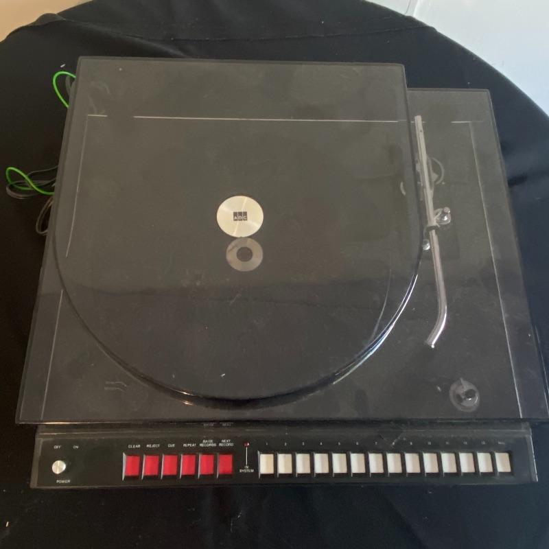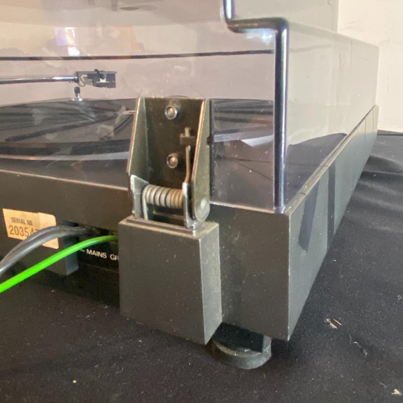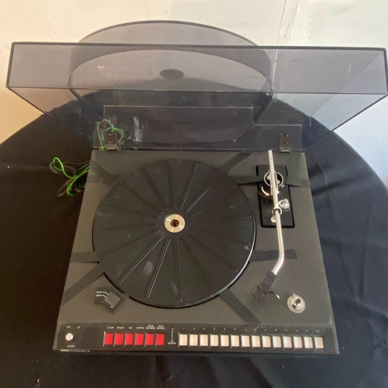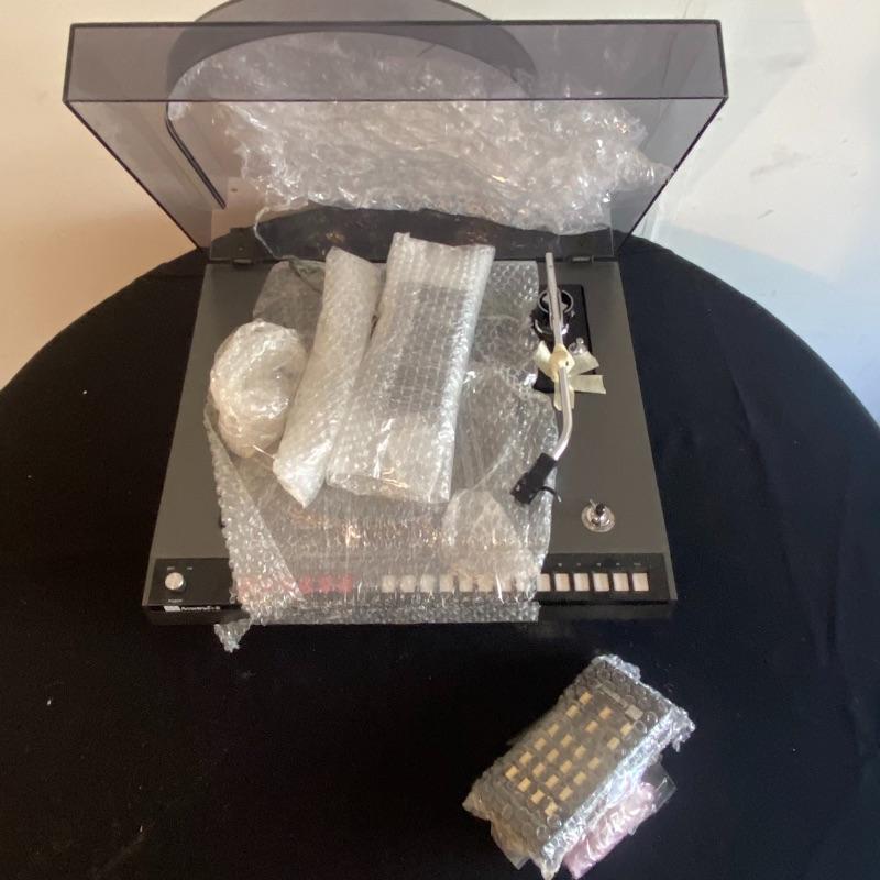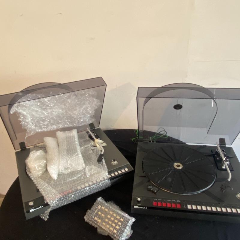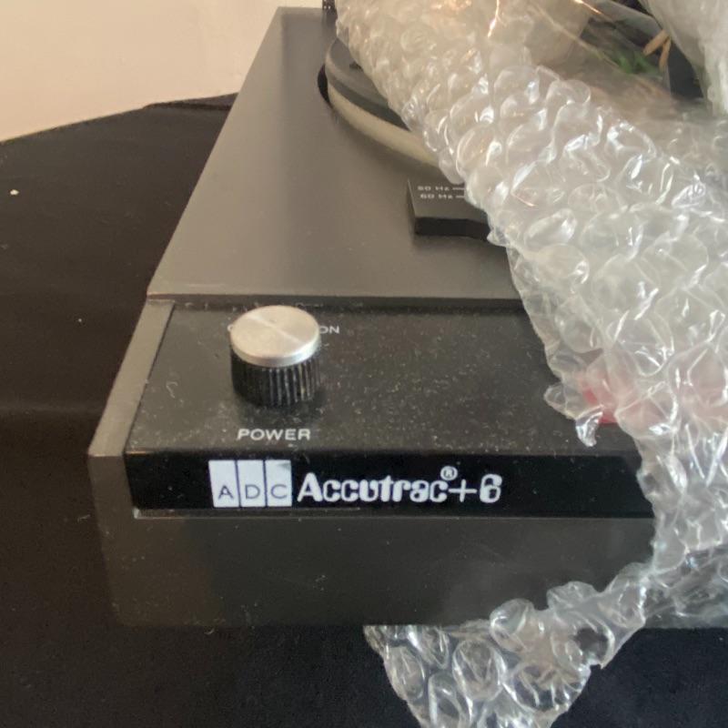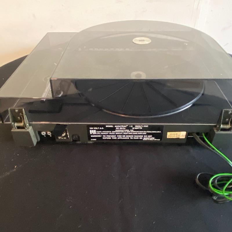 This lot includes a pair of ADC Accutrac +6 turn tables with remotes. They are both complete sets with controls, a charcoal base, and lid. Made in Great Britain . First turntable appears to have all cords and remote. Both units Powered on when tested. See photos.