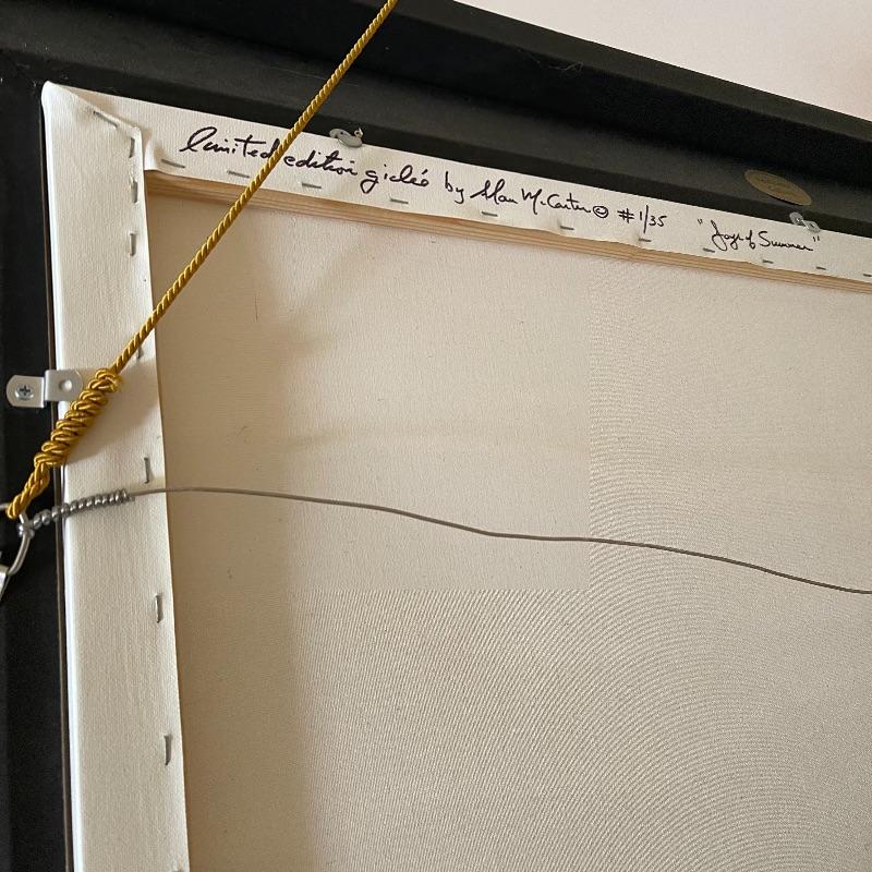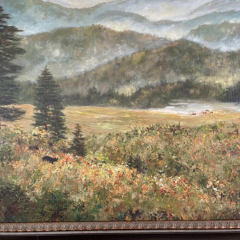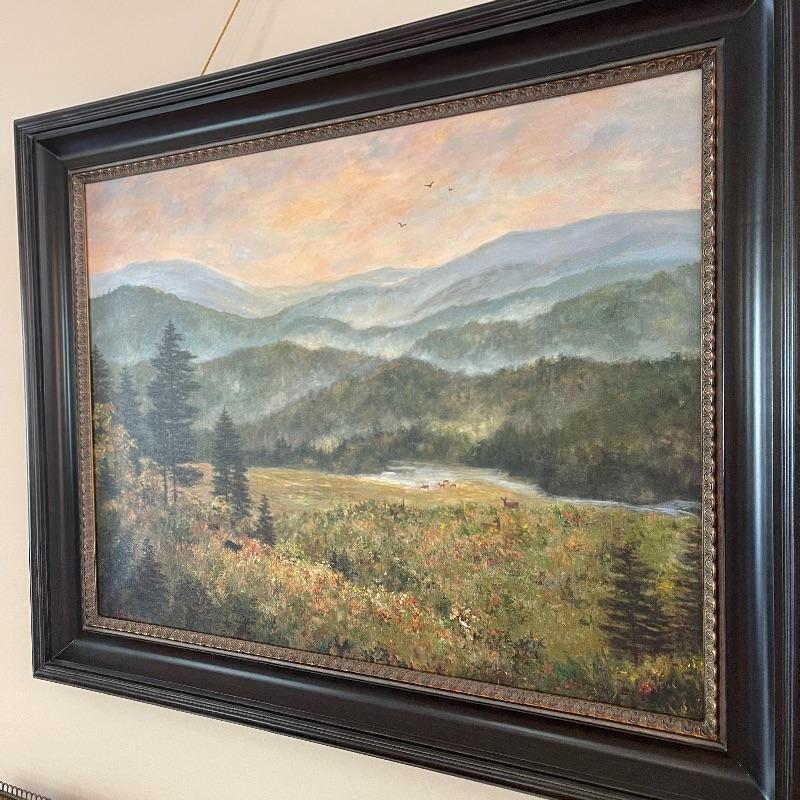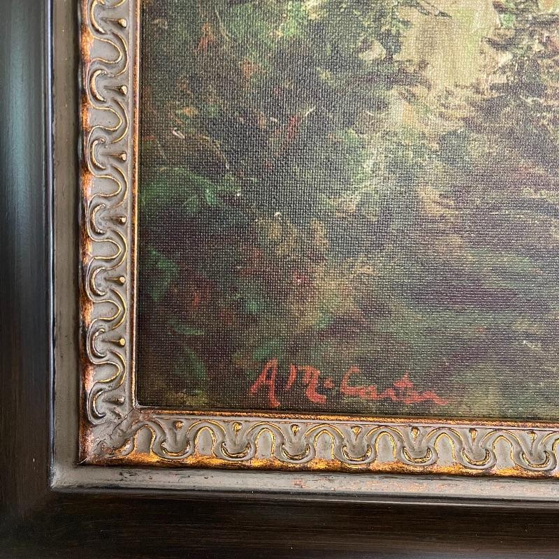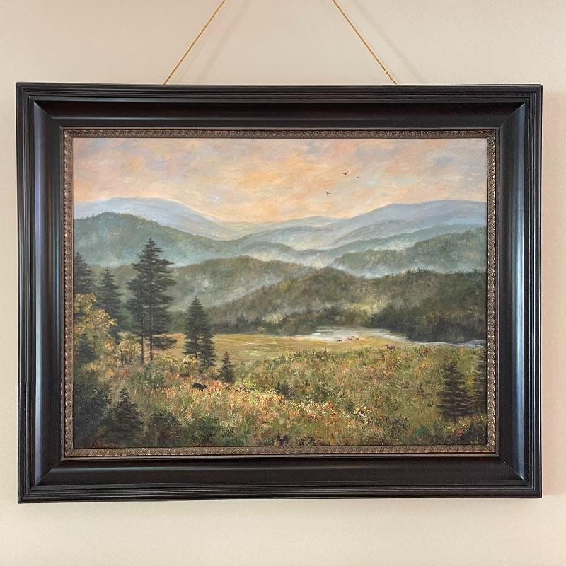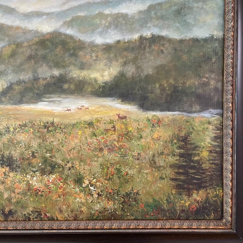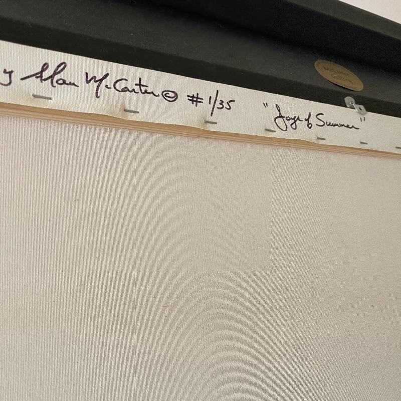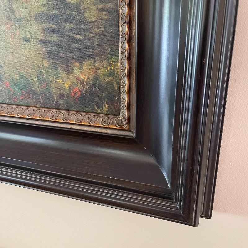 Large framed landscape artwork. Limited edition by Alan McCarter, “Joys of Spring,” giclee 1 of 35. It is framed in a 2.5 inch deep dark wood frame. The giclee is on a pre-stretched canvas and set into the frame from the back. It is 50 inches long by 39.5 inches high.