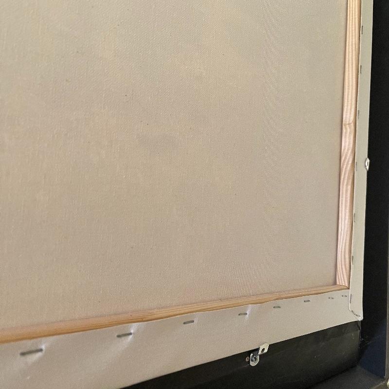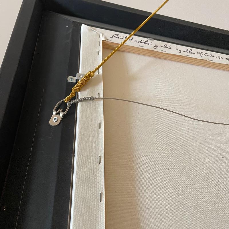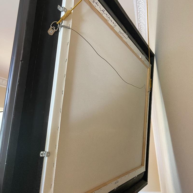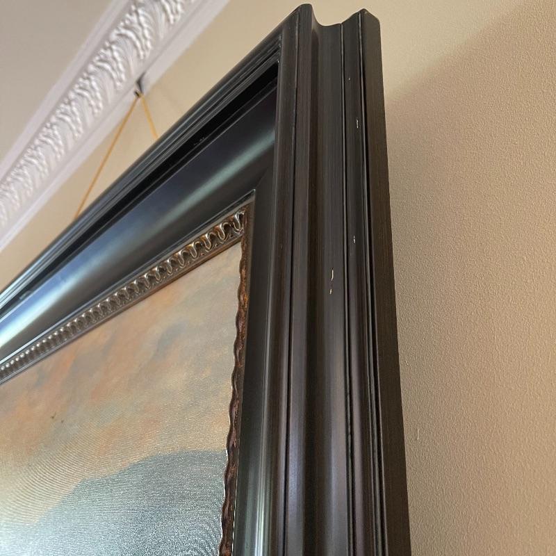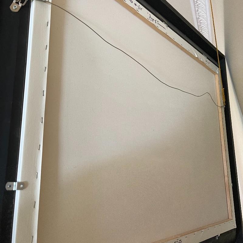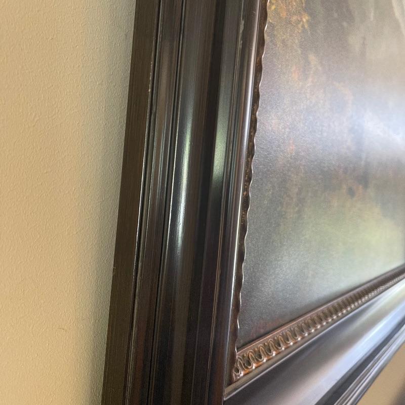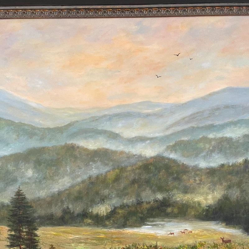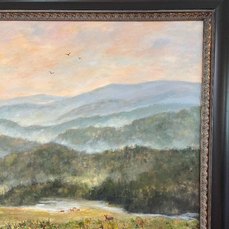 Large framed landscape artwork. Limited edition by Alan McCarter, “Joys of Spring,” giclee 1 of 35. It is framed in a 2.5 inch deep dark wood frame. The giclee is on a pre-stretched canvas and set into the frame from the back. It is 50 inches long by 39.5 inches high.