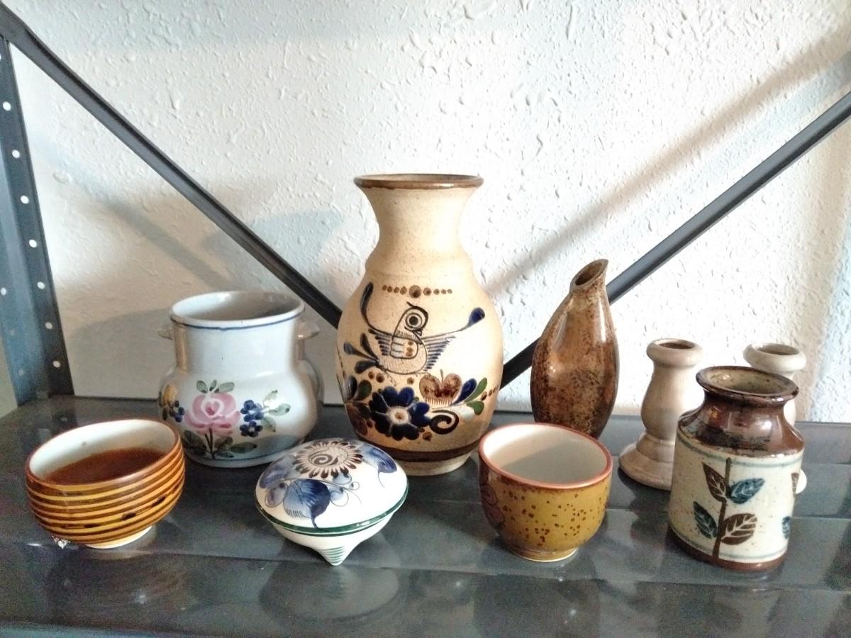 DECORATIVE DISH WARE, VASES, BOWLS, AND CANDLE STICK HOLDERS. POTTERY PIECES AS WELL AS A FEW PORCELAIN / CERAMIC ITEMS. SOME SIGNED AS SHOWN.