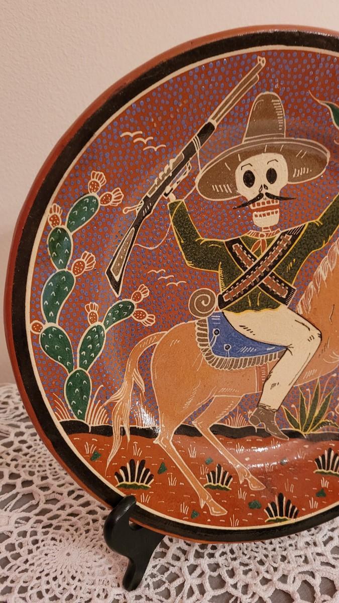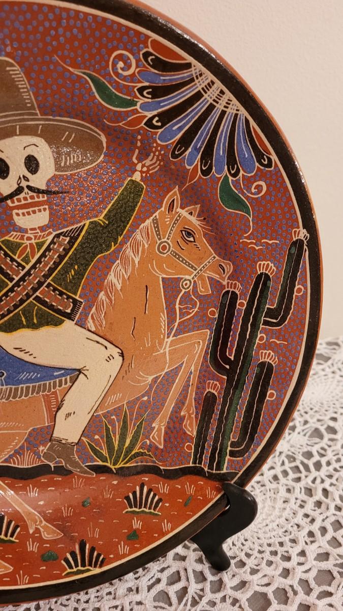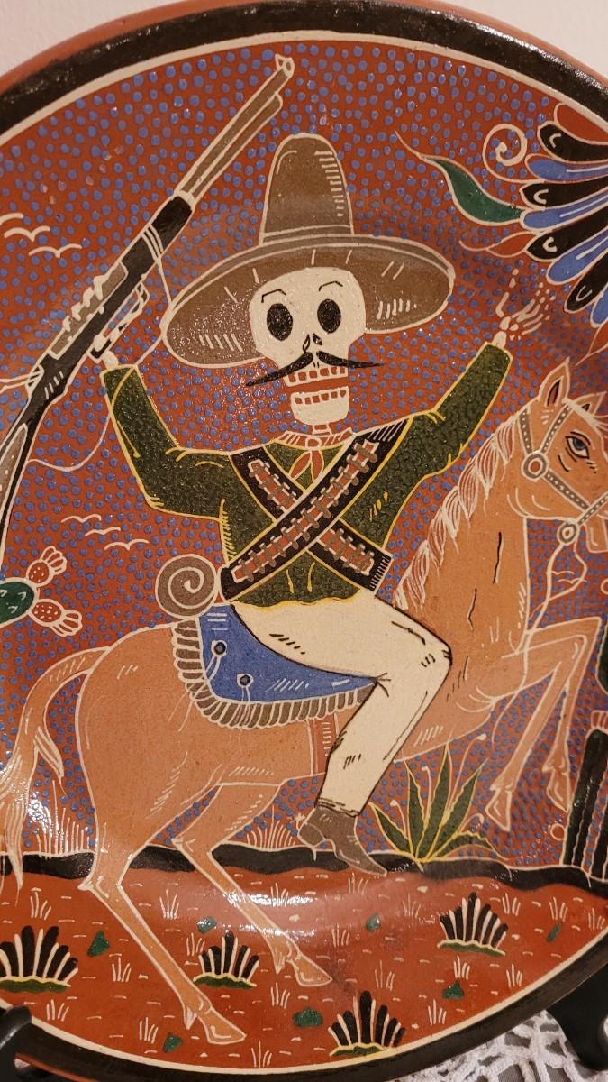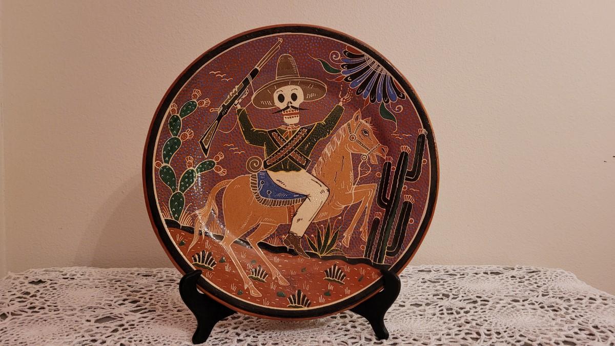 Owner of a masterful and agile brushstroke, he decorates his creations with catrinas, skeletons in traditional scenes, eagles, flowers, historical figures and scenes from Tonaltec traditions.