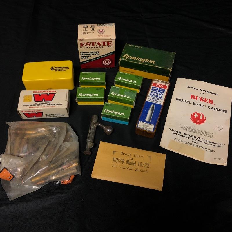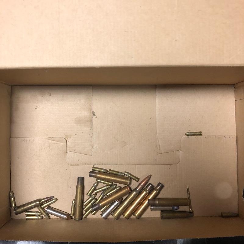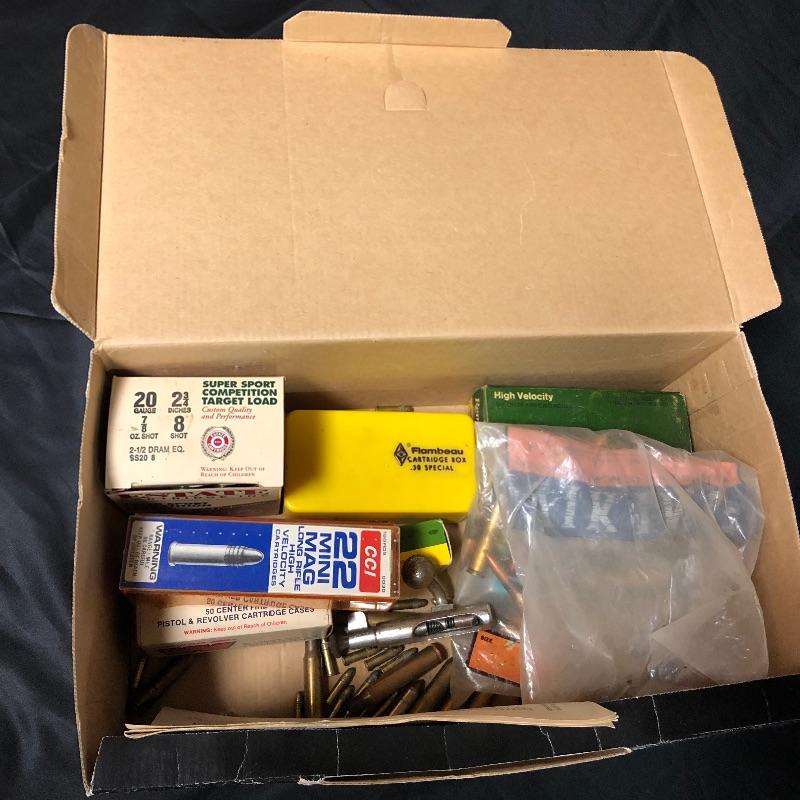 This lot includes an array of ammunition and more. There appears to be many different sizes and types of ammunition. Some boxes seem to be partially used. Shoe box with all contents measures 14”W x 8.5”D x 5”H. Local pick up only.