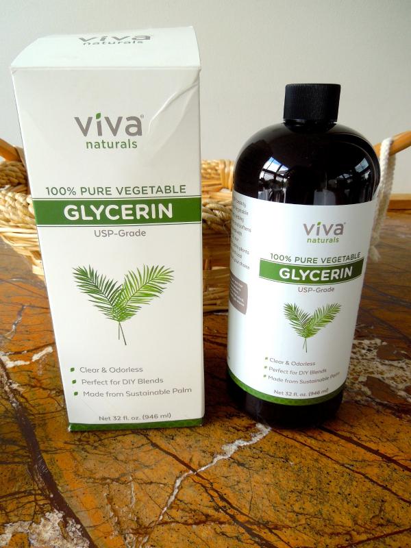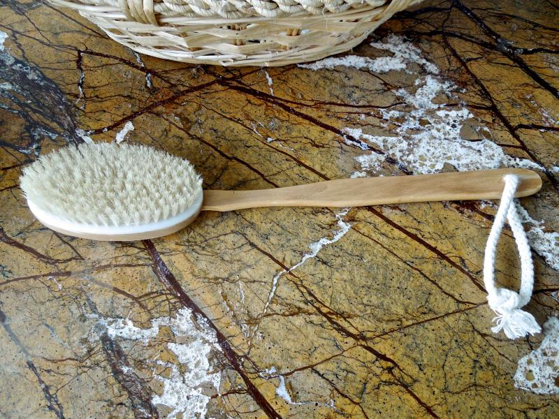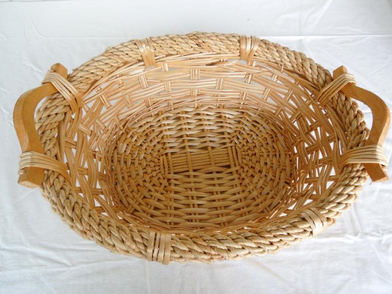 Wicket basket with rope edge and wood handles contains new unopened netti pot, opened bottle of natural glycerin, a back shower brush and a satin glass used empty perfume bottle.