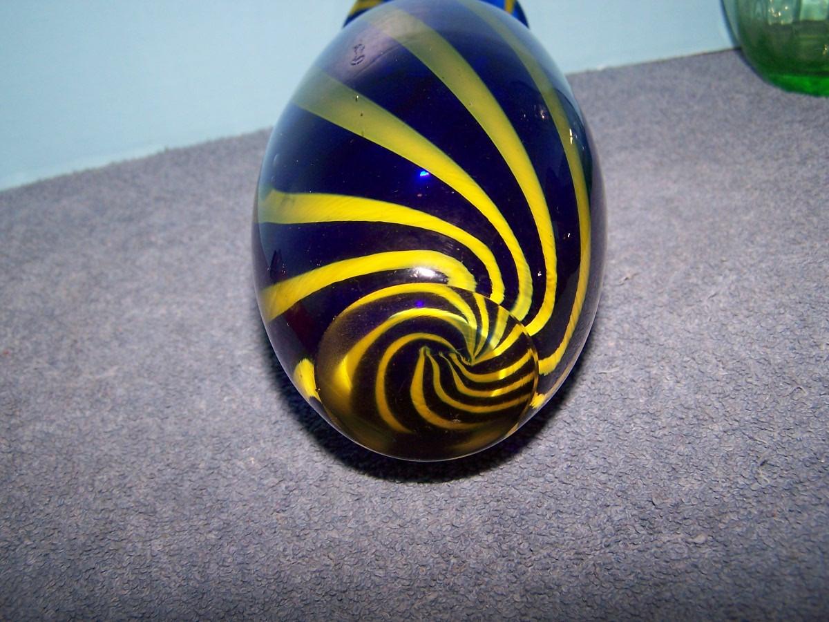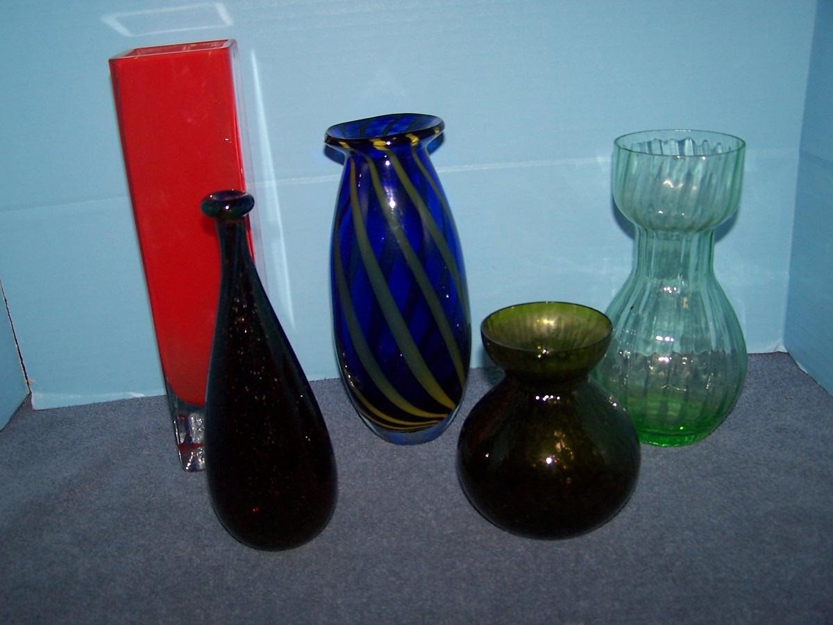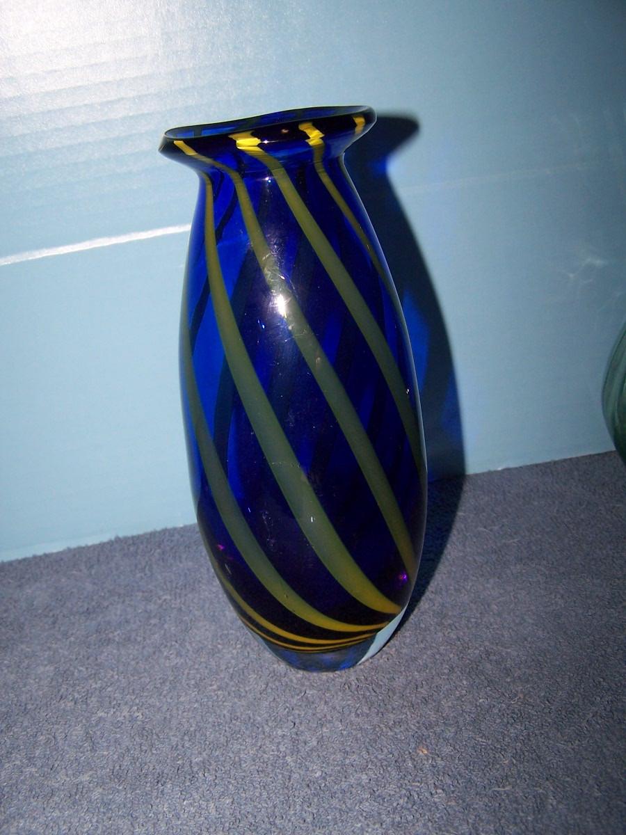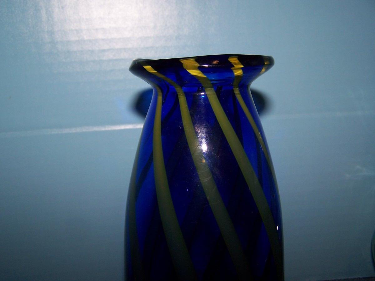 SOME BEAUTIFUL VINTAGE MCM ART GLASS, PLUS 2 TULIP VASES!!! UNMARKED.. BLUE/YELLOW SWIRL-8'' TALL.. LIGHT WEAR.