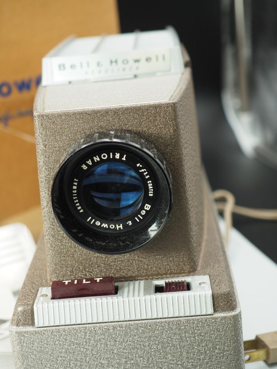 Lot 102, 1950s Bell and Howell Slide projector in original box, with original manual . Has a manual changer, or can be used with a slide tray. which is not included. It does not have the selector changer arm attachment either, or the compact carrying case.