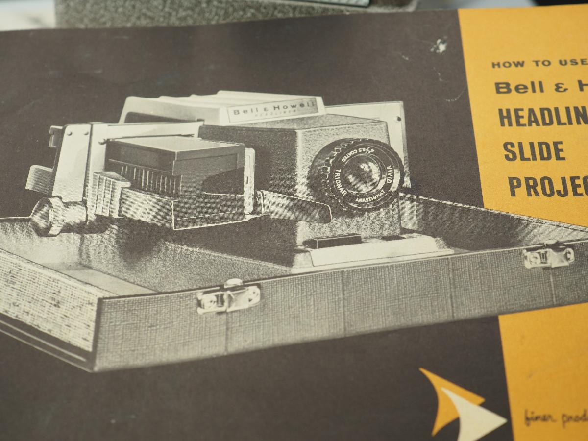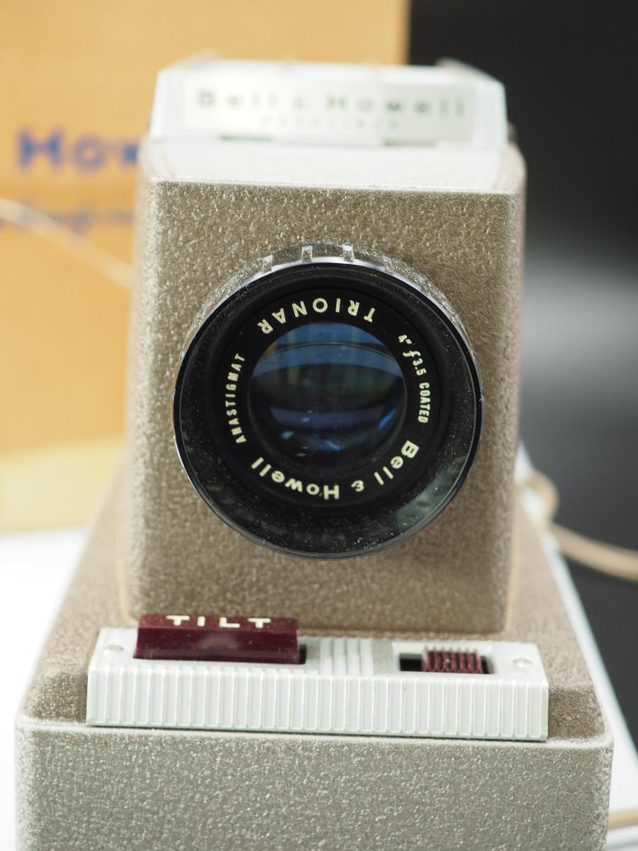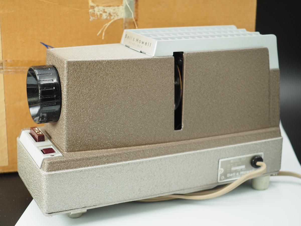 Lot 102, 1950s Bell and Howell Slide projector in original box, with original manual . Has a manual changer, or can be used with a slide tray. which is not included. It does not have the selector changer arm attachment either, or the compact carrying case.