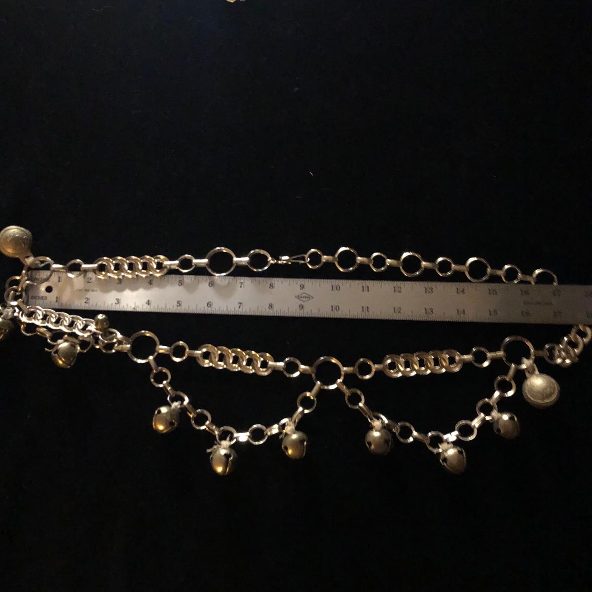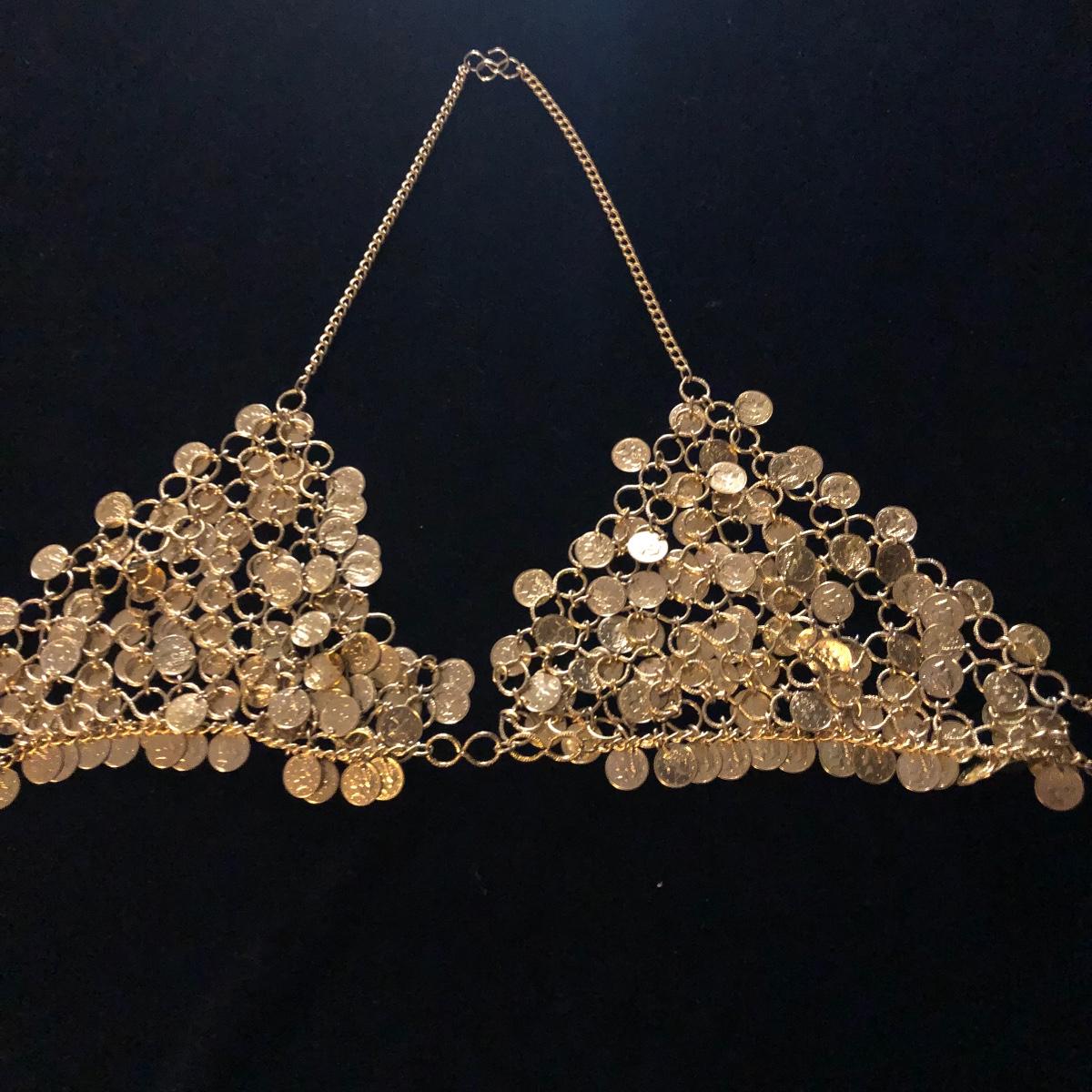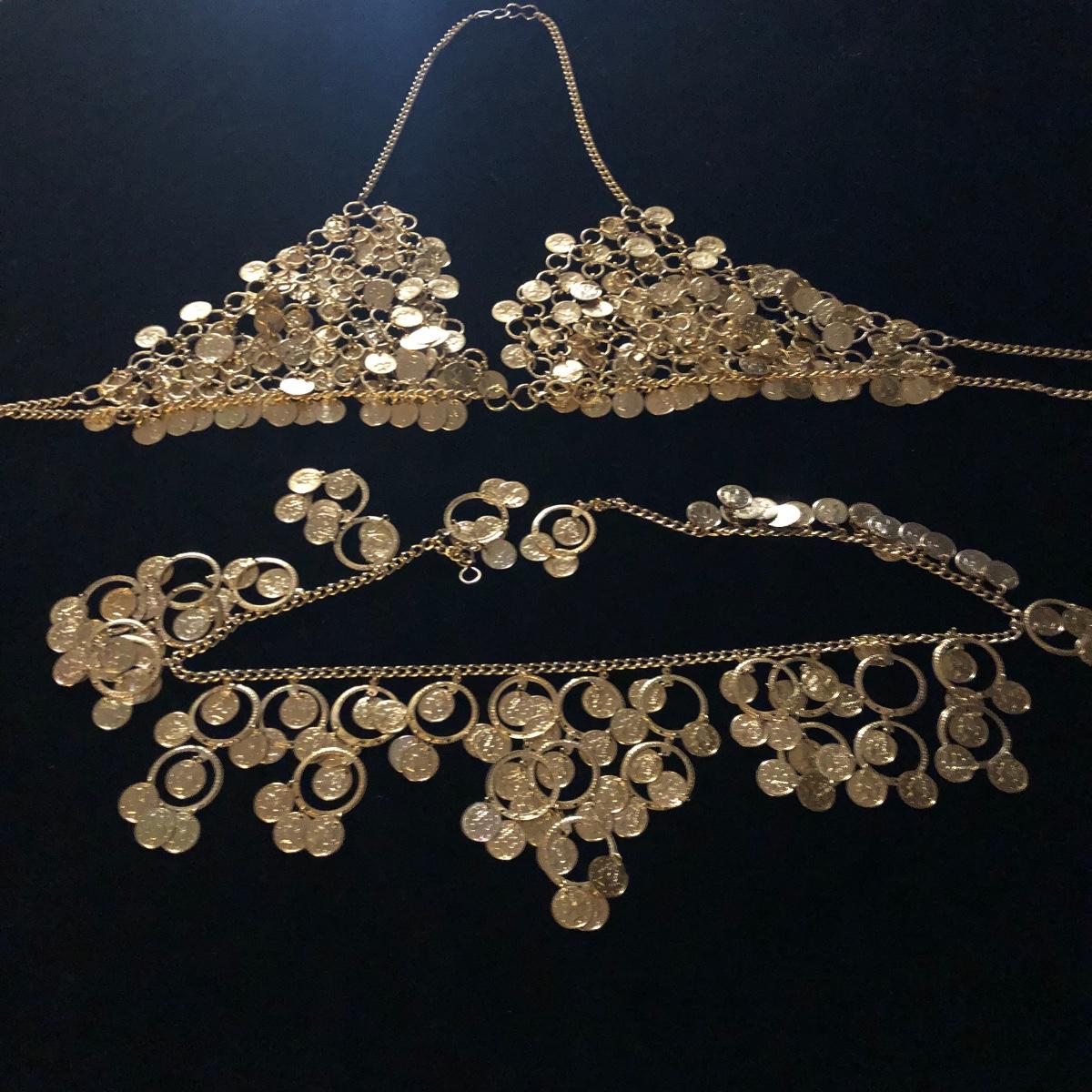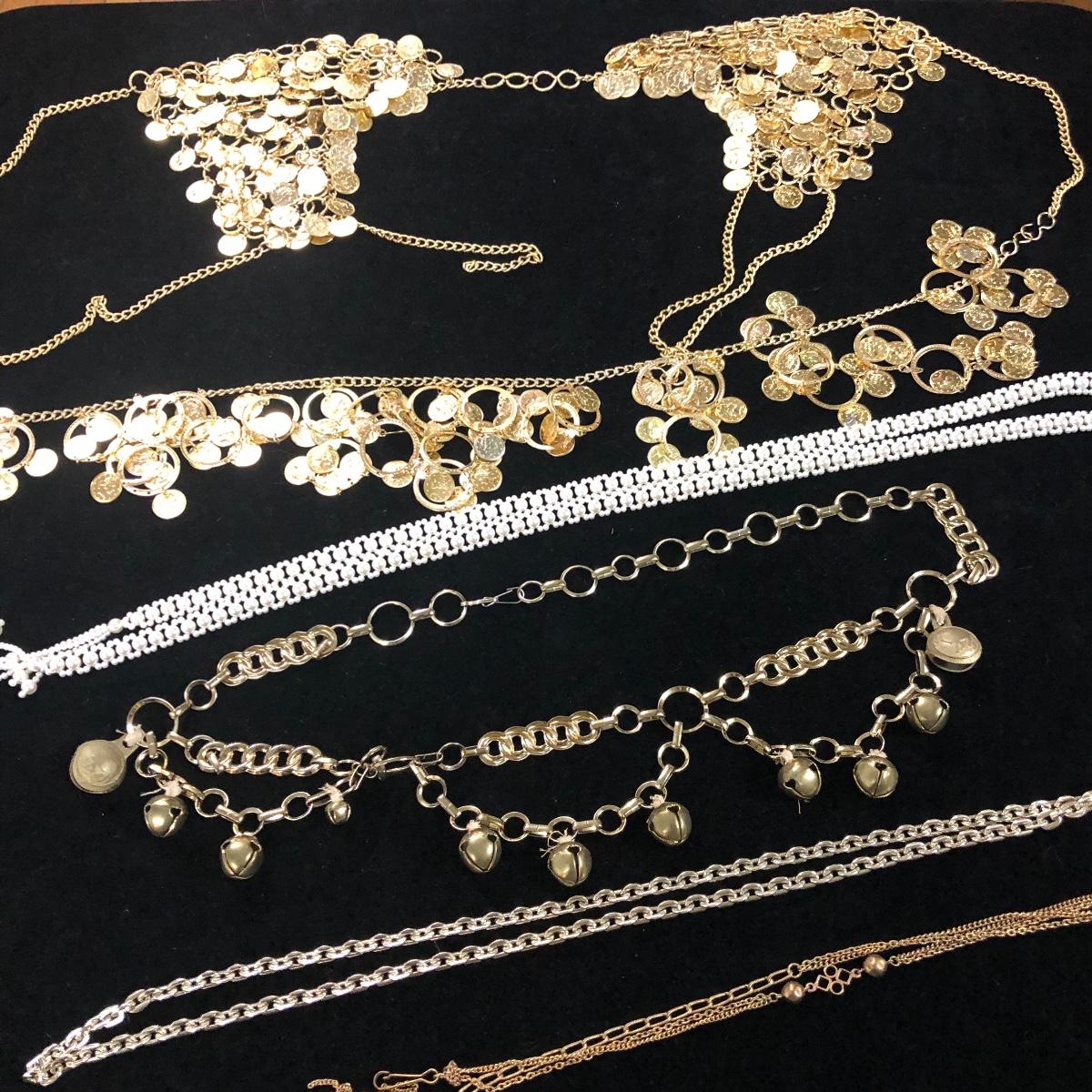 Have fun with this lot! It includes fibe waist belts, five bracelets, one ring and four necklaces. All waist belts are metal except one that is more pearl-like. One set of jangles consists of a bikini like top with matching bottoms. Shipping Available.