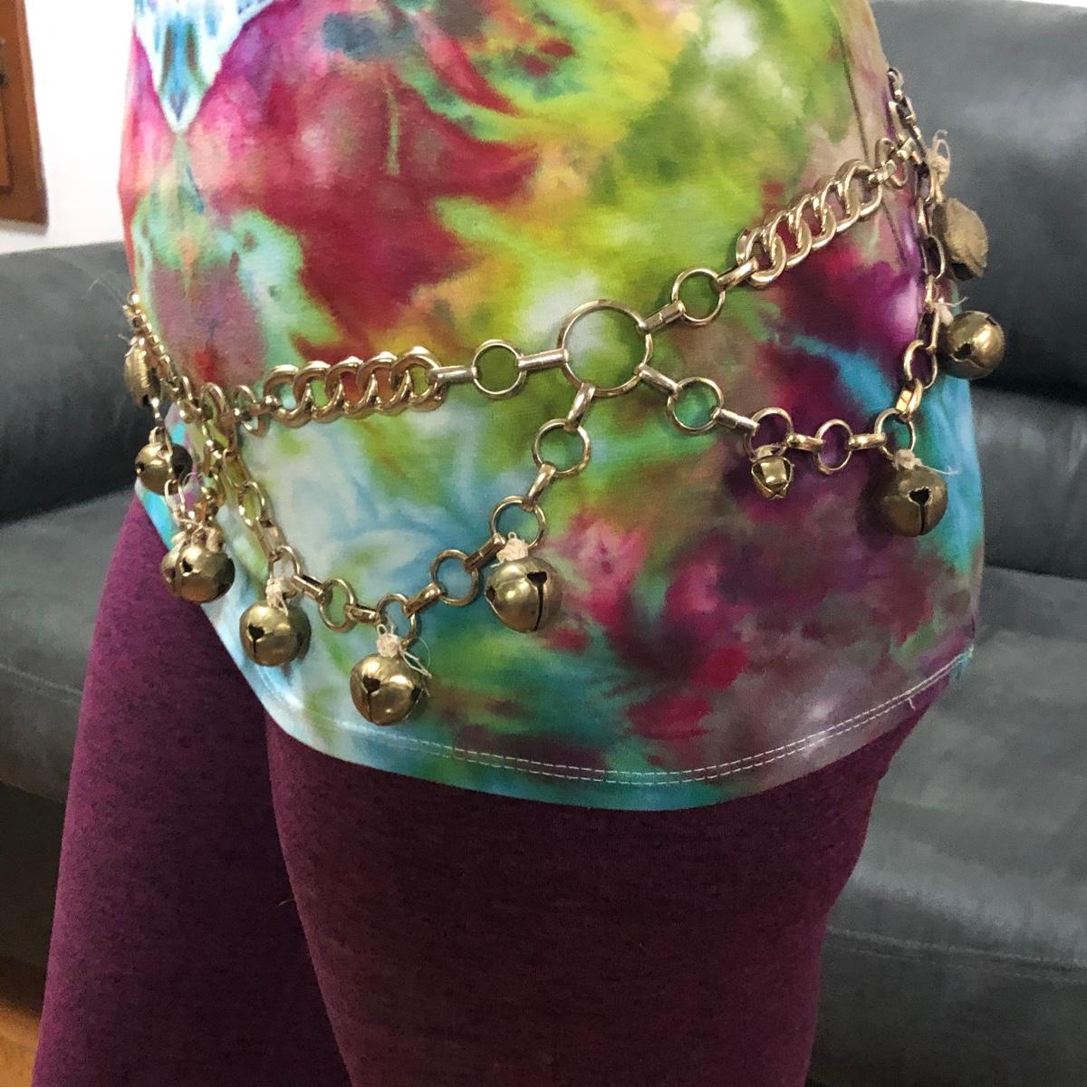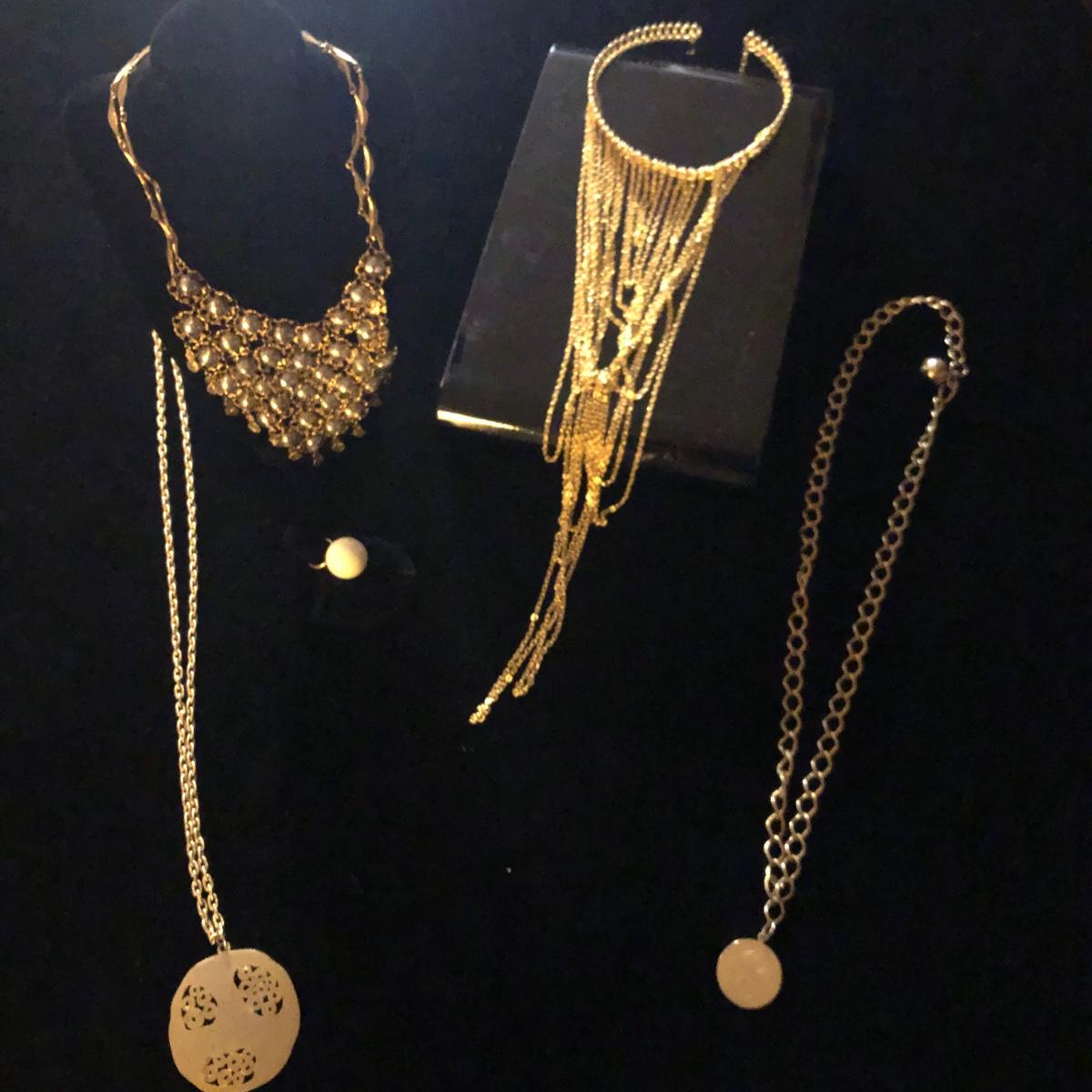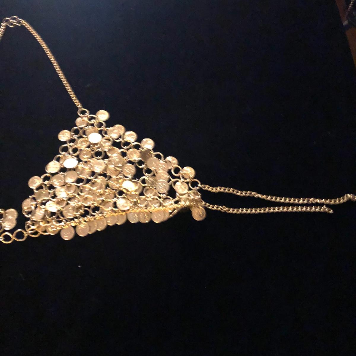 Have fun with this lot! It includes fibe waist belts, five bracelets, one ring and four necklaces. All waist belts are metal except one that is more pearl-like. One set of jangles consists of a bikini like top with matching bottoms. Shipping Available.