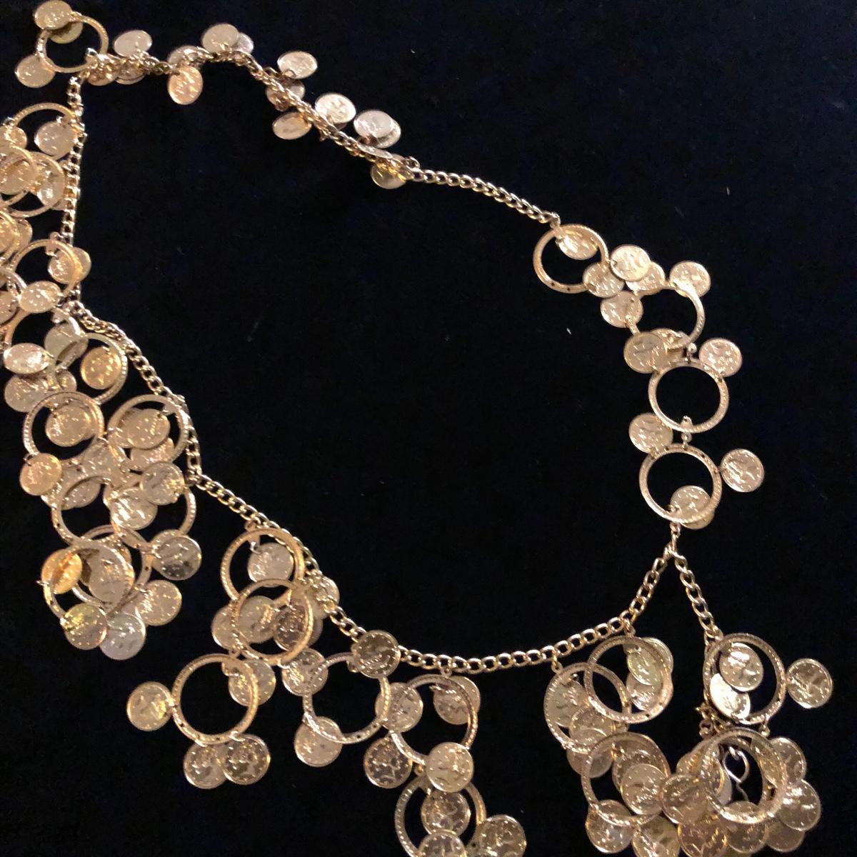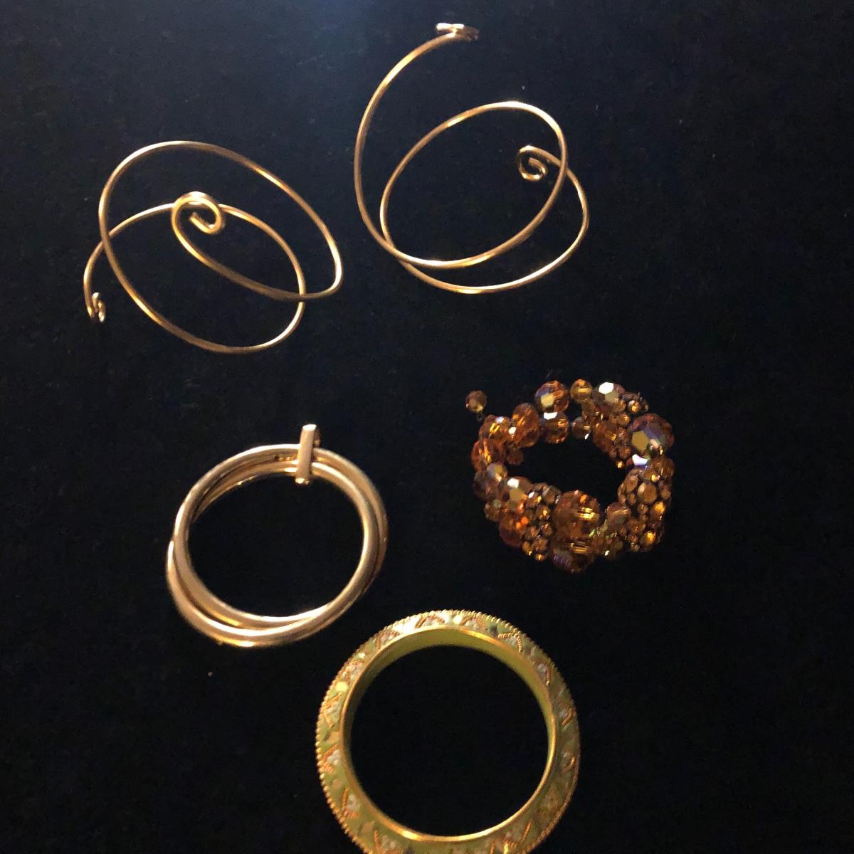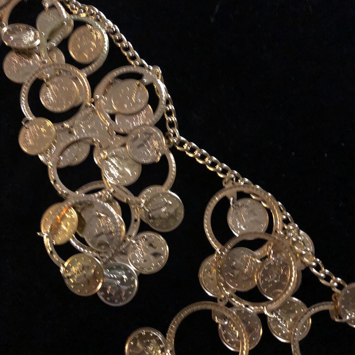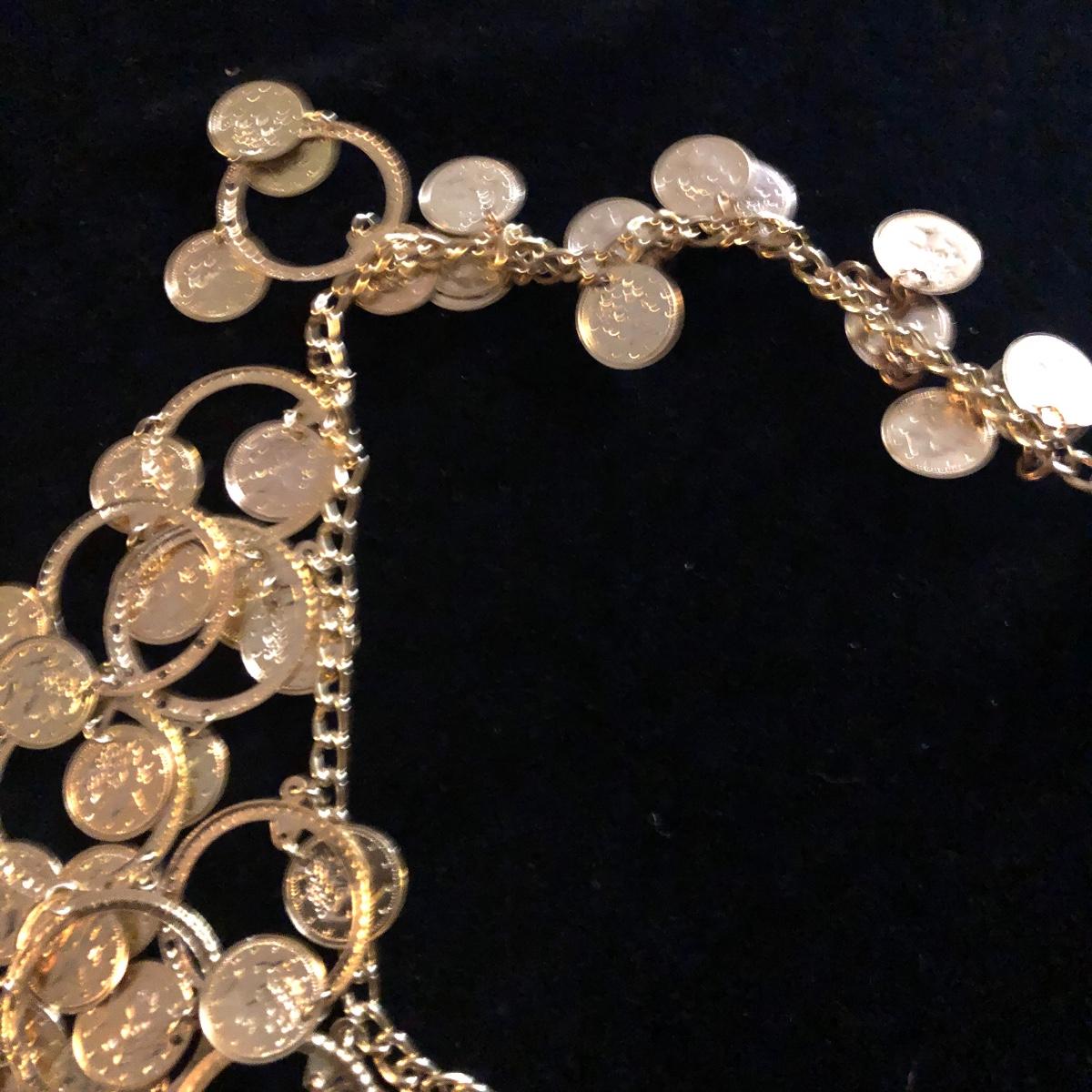 Have fun with this lot! It includes fibe waist belts, five bracelets, one ring and four necklaces. All waist belts are metal except one that is more pearl-like. One set of jangles consists of a bikini like top with matching bottoms. Shipping Available.
