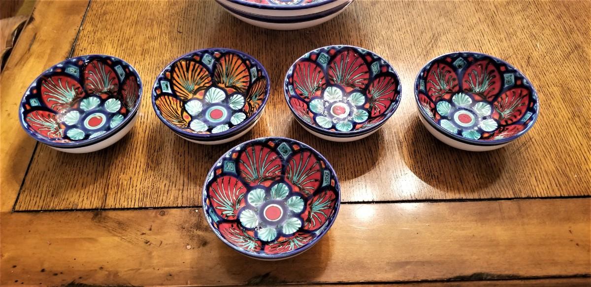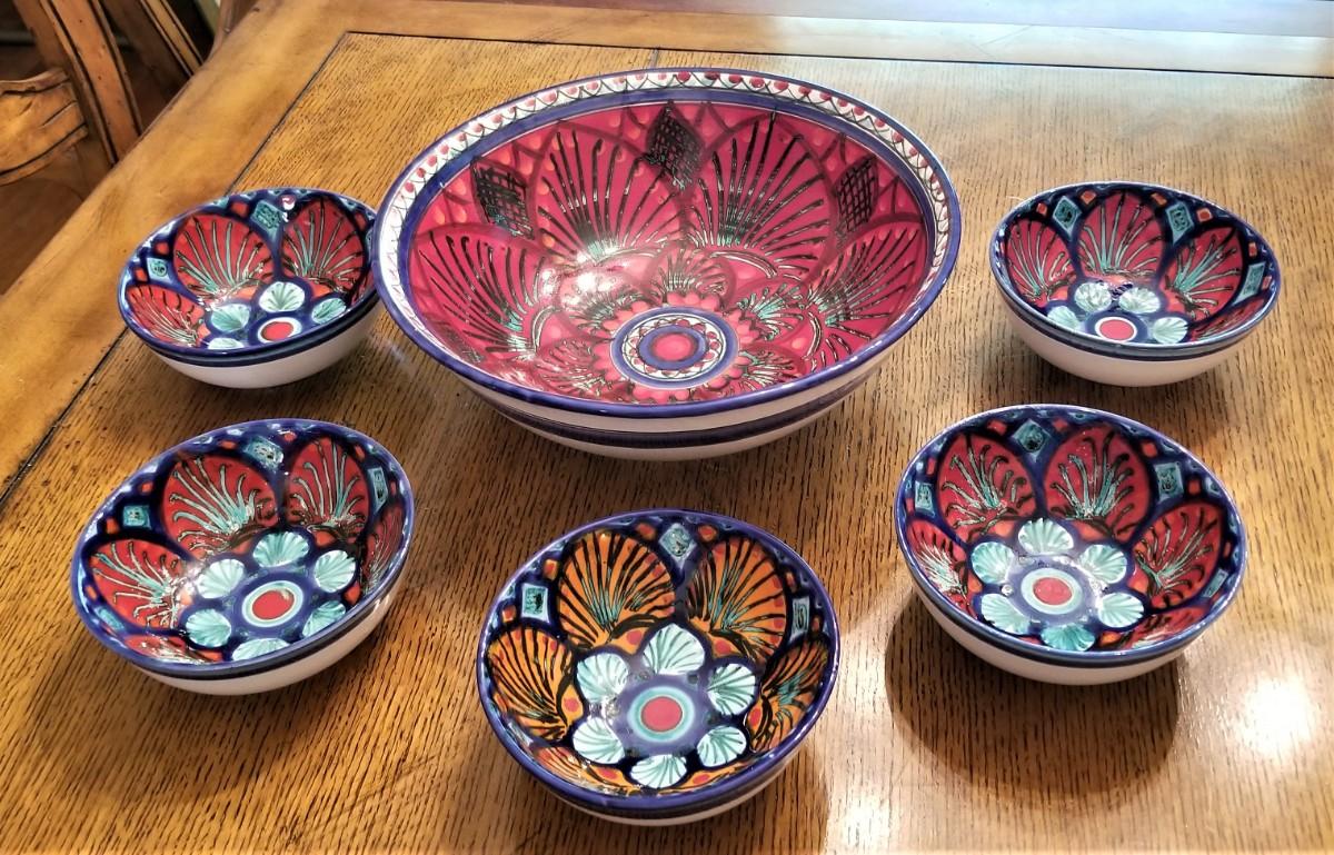 Cerarmica La Maga handpainted center bowl (11.25" across, 4" tall) with 5 matching smaller bowls (5.5" across, 2.25" tall). All in good condition.