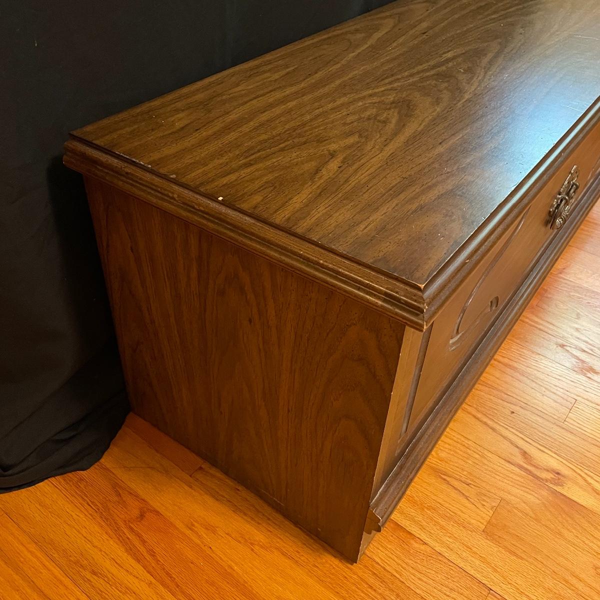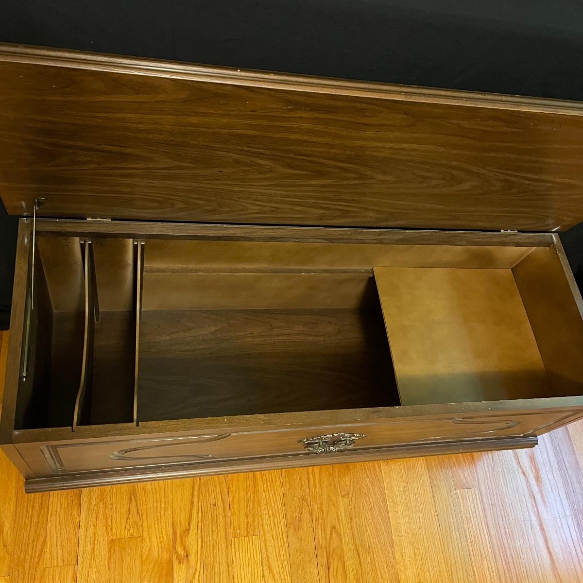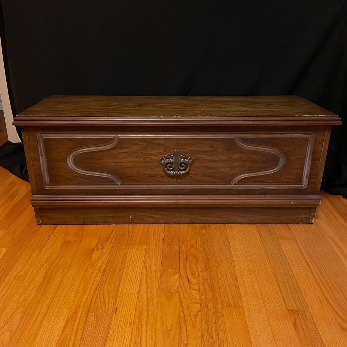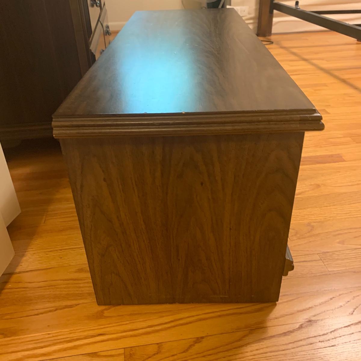 If you need a handy storage chest, this is it! This piece features dividers, a decorative metal handle, and elegantly routed trim. It’s sturdy wood construction will ensure that this chest is in service for years to come. Measurements are 41” wide X 16” tall X 15” deep. Other then a few minor scratches this piece is in good condition. Local pickup only