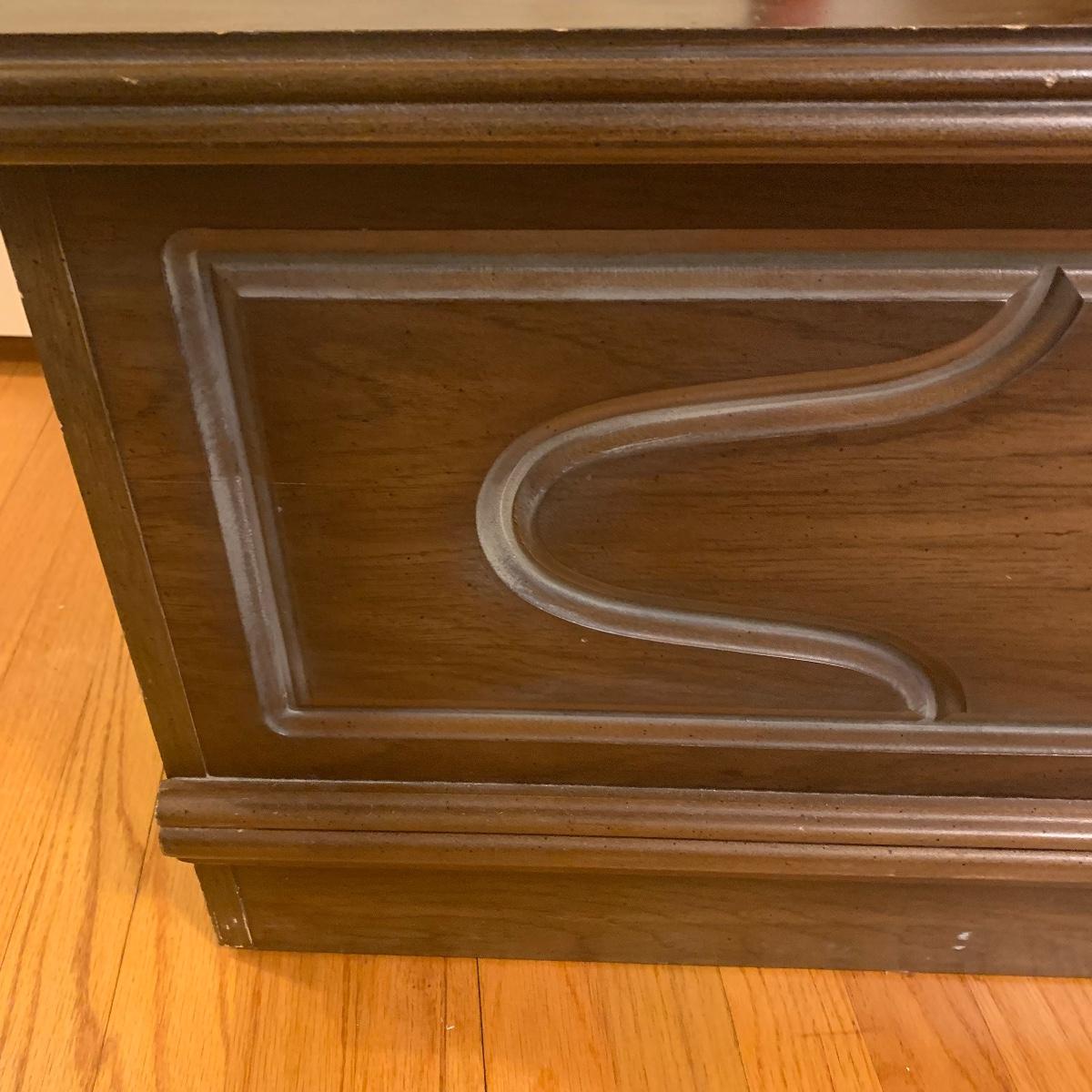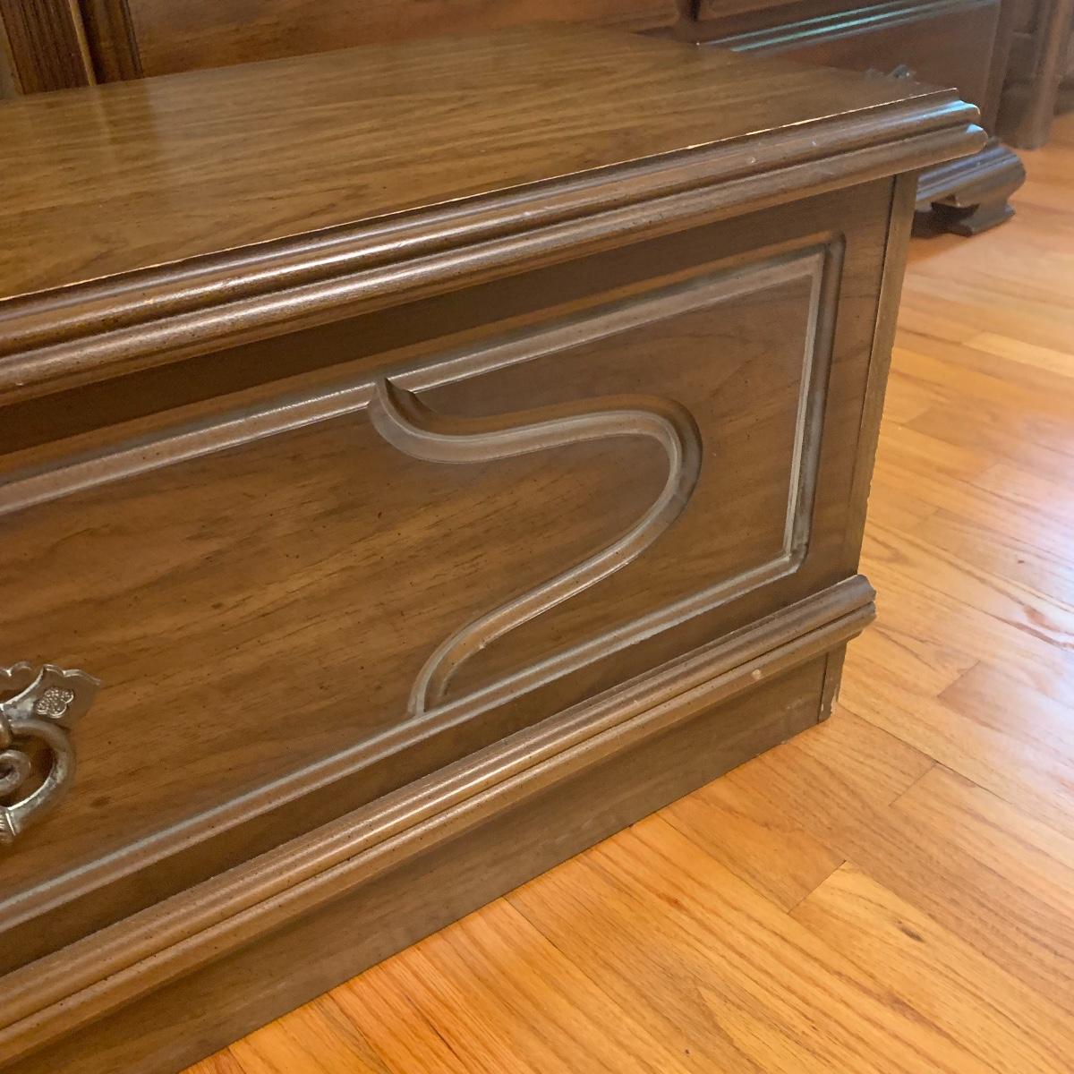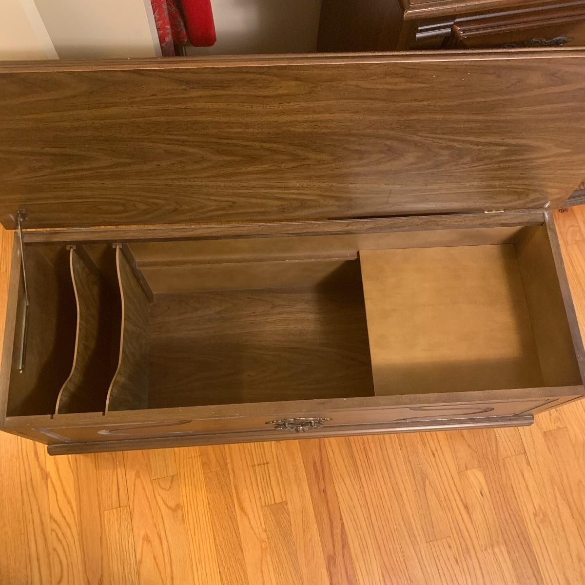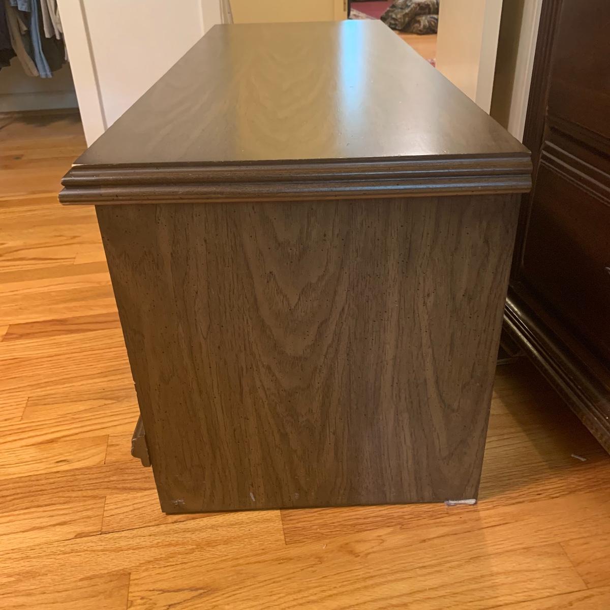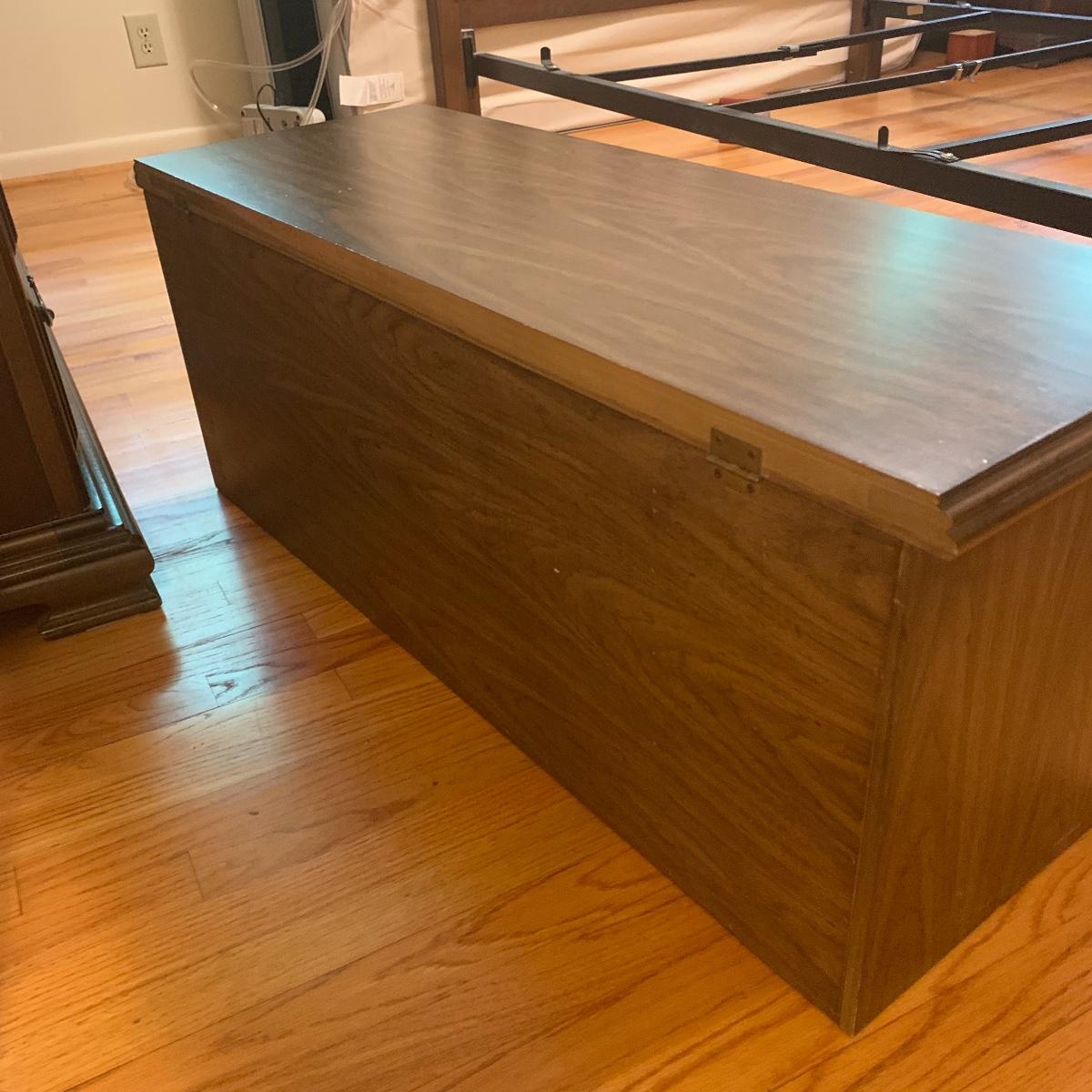 If you need a handy storage chest, this is it! This piece features dividers, a decorative metal handle, and elegantly routed trim. It’s sturdy wood construction will ensure that this chest is in service for years to come. Measurements are 41” wide X 16” tall X 15” deep. Other then a few minor scratches this piece is in good condition. Local pickup only