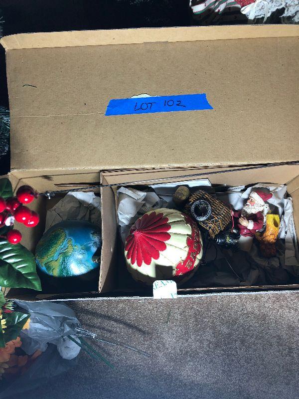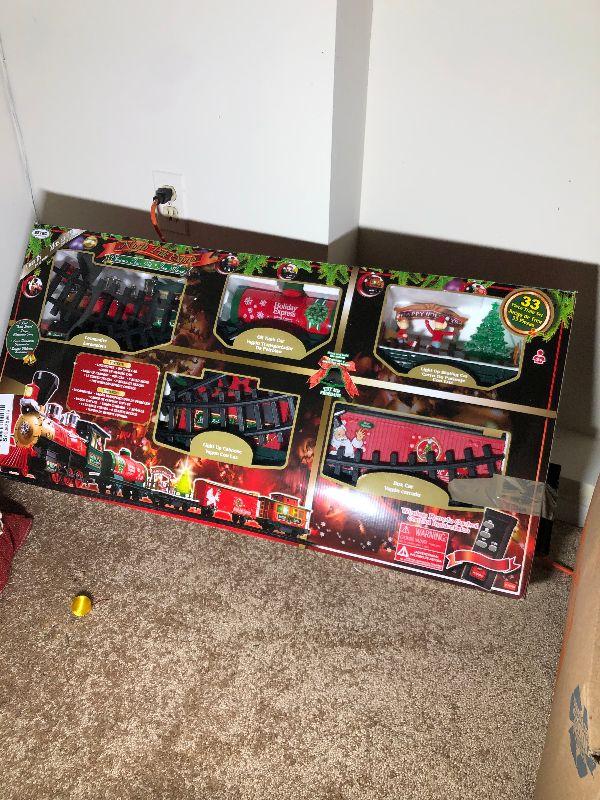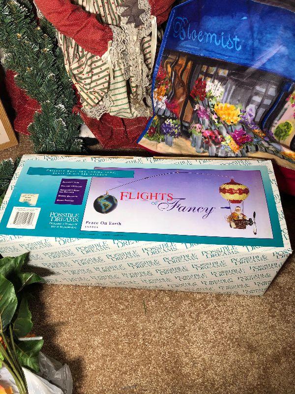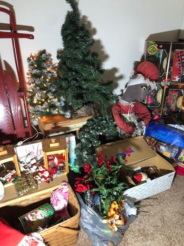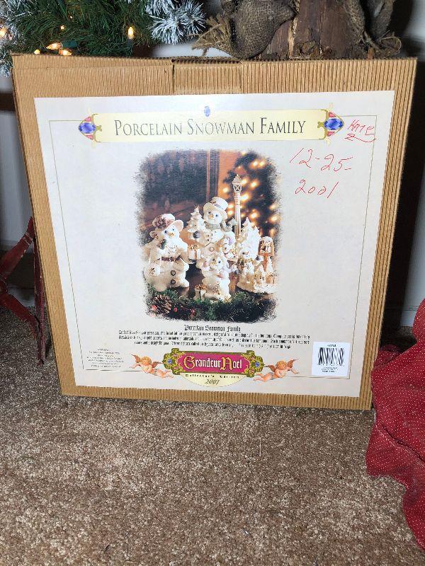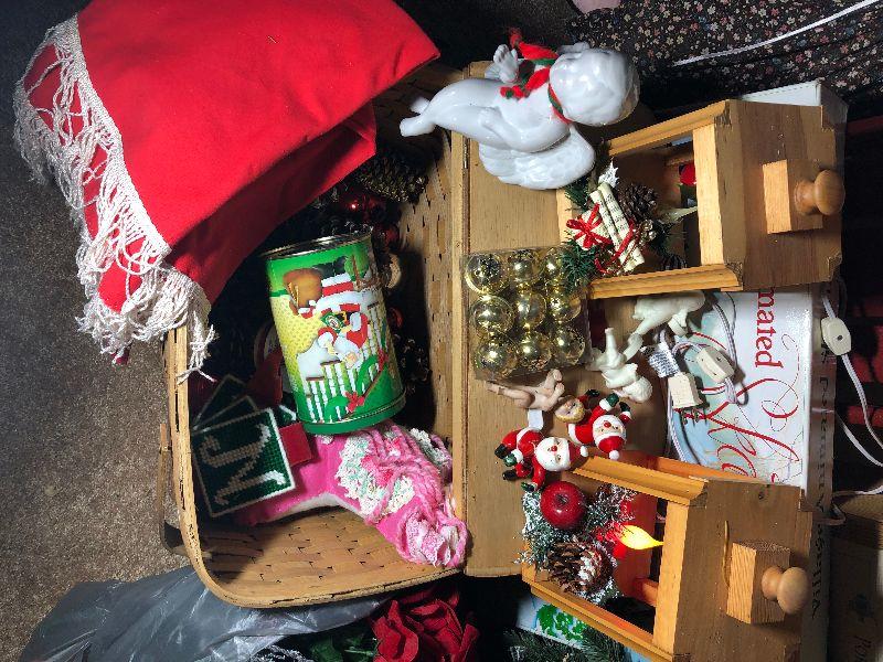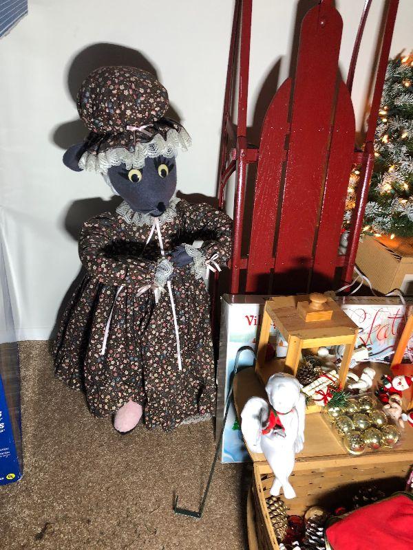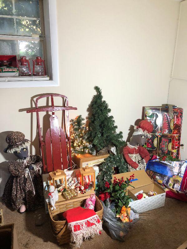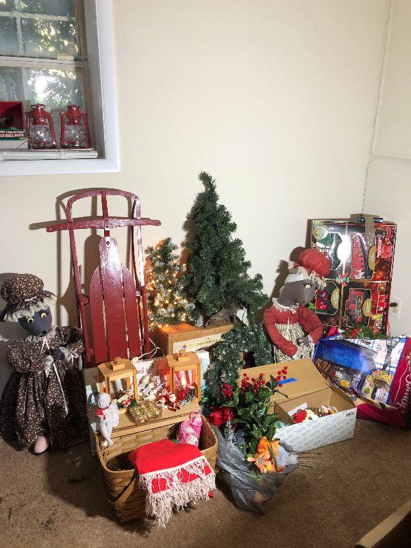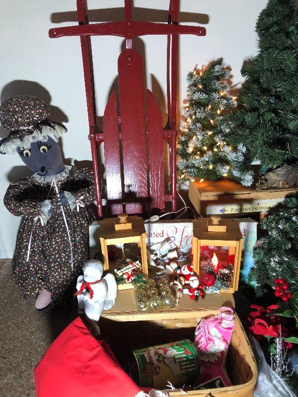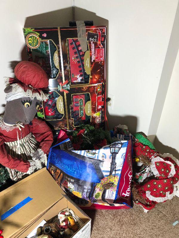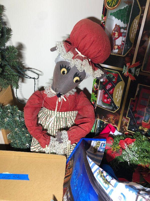 Wreaths, 2 Christmas mother mice, North Pole express train set, animated village skating pond, collectible porcelain snowman family, sled and other miscellaneous items