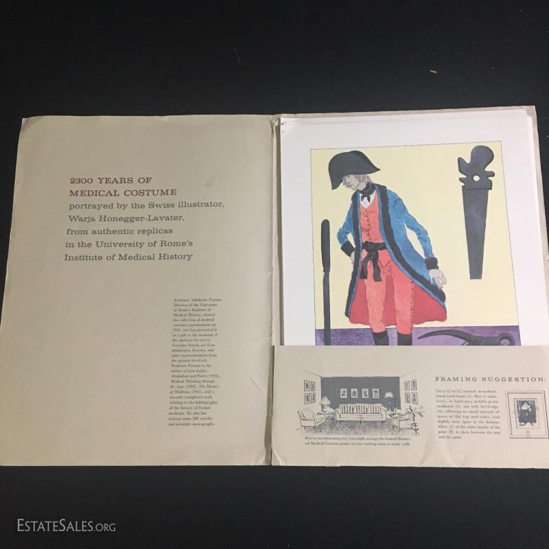 Booklet of "2300 Years of Medical Costumes". These are portrayed by Swiss Illustrator Warja Honegger-Lavater. Includes 12 prints suitable for framing.