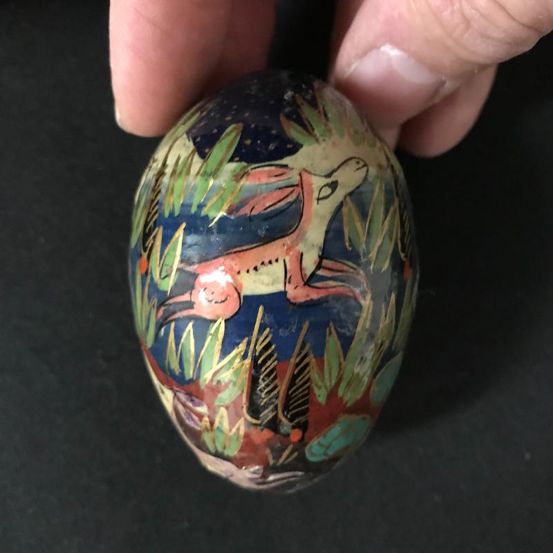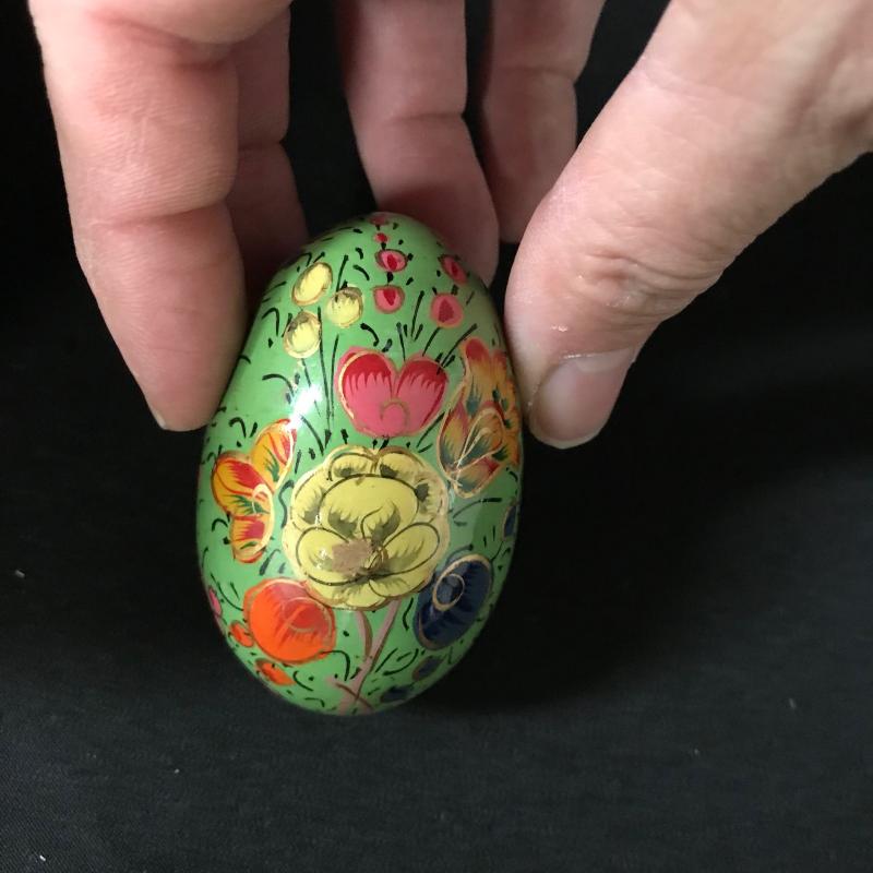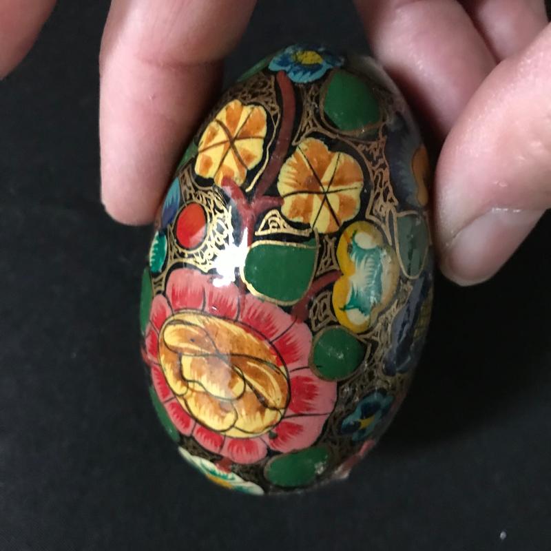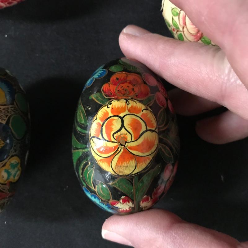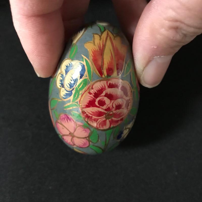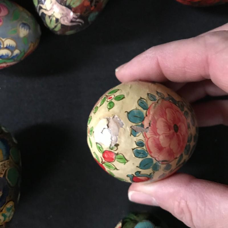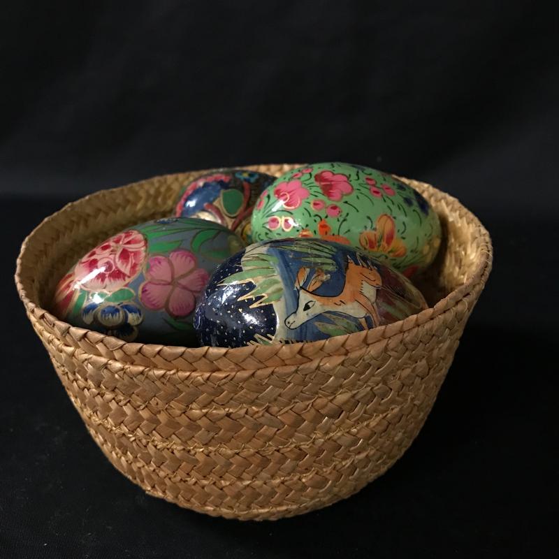 Painted or decoupaged wooden eggs in colorful designs, floral and animal themes. Only one has slight damage. Includes Cute basket to hold them all. This lot is available for shipping or local pick up in Asheville, NC.