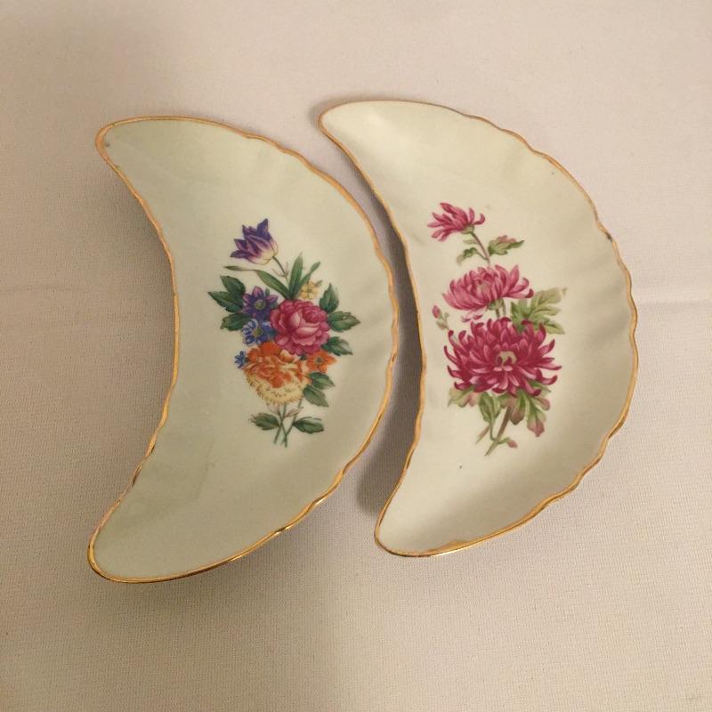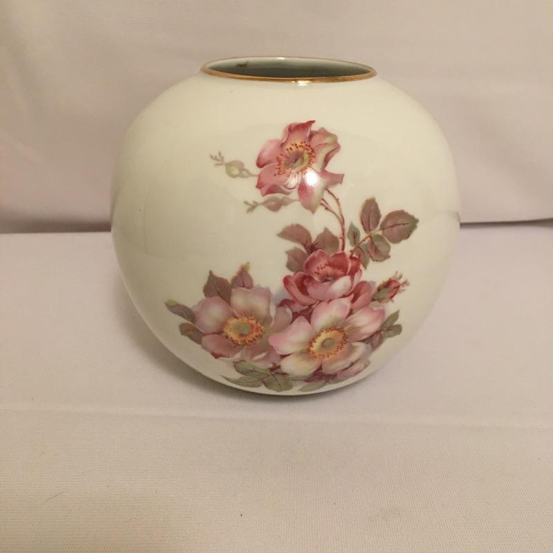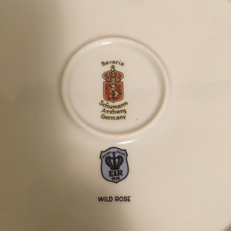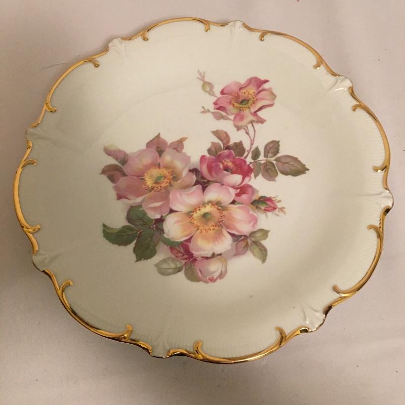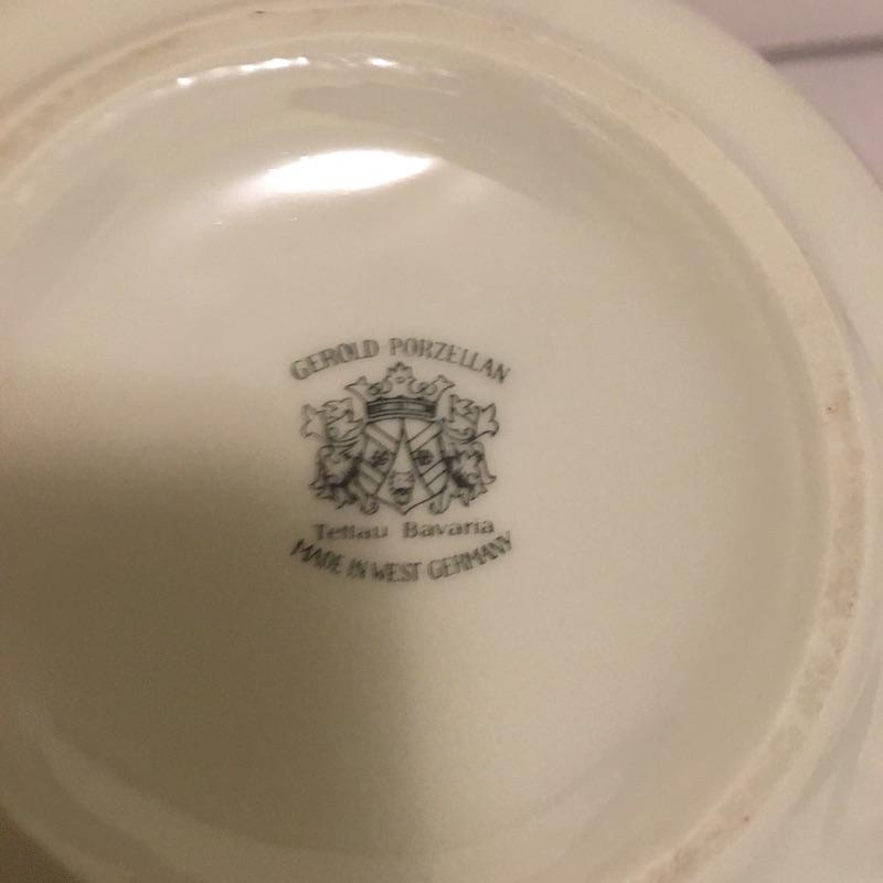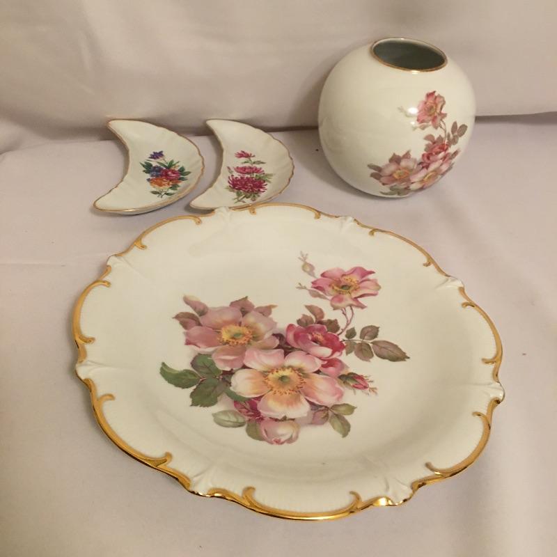 Four piece collection of gold rimmed China includes Gerold Porzellan vase, Schuman Arzberg plate and two quarter moon dishes with no markings. Plate measures 11.5”D.