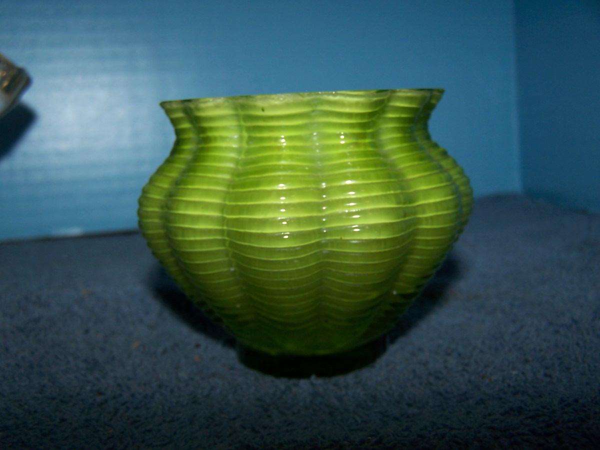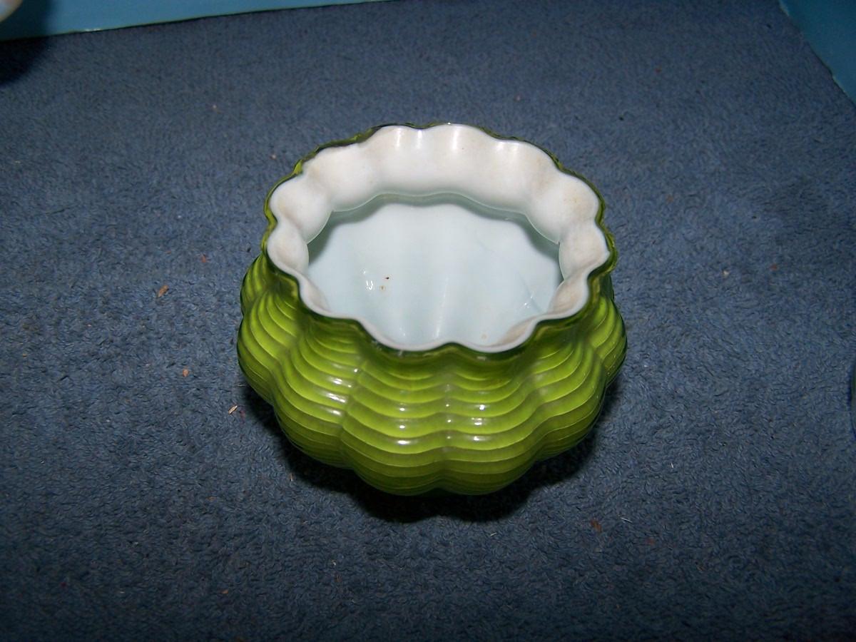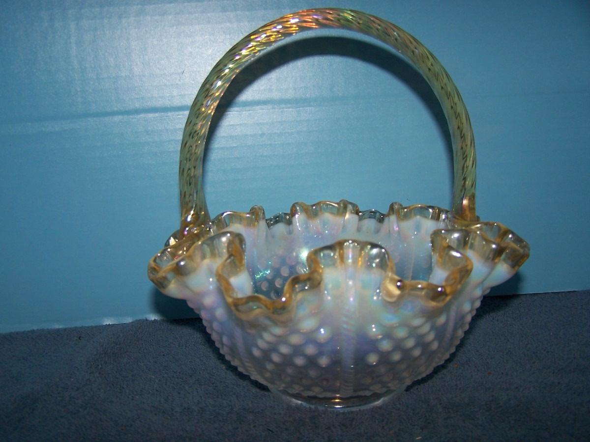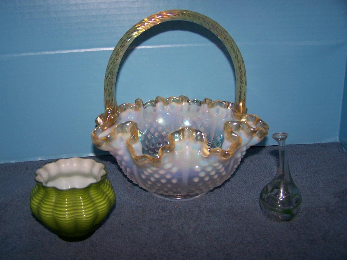 THIS IS GORGEOUS VINTAGE ART GLASS!!! FENTON BASKET IS MARKED, SLIGHT WEAR.. ... SMALL GREEN CASED GLASS VASE/BOWL IS 2 3/4'' TALL, HAS SEVERAL TINY RIM FLAKES..