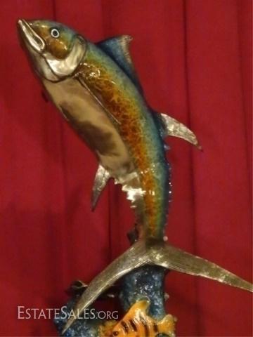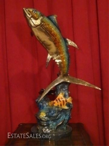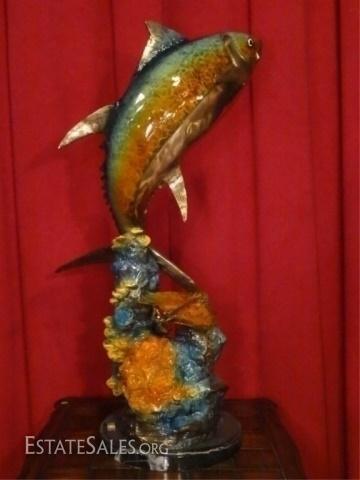 LOT 102: HUGE PATINATED BRONZE TUNA SCULPTURE ON MARBLE BASE, EXCELLENT CONDITION, 40"H X 24"W, SKU146.12