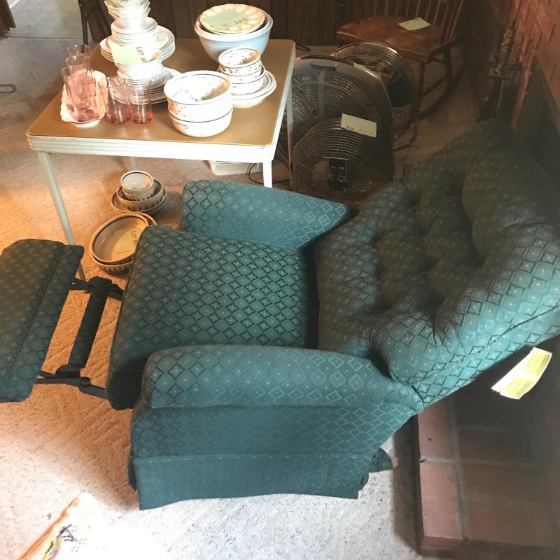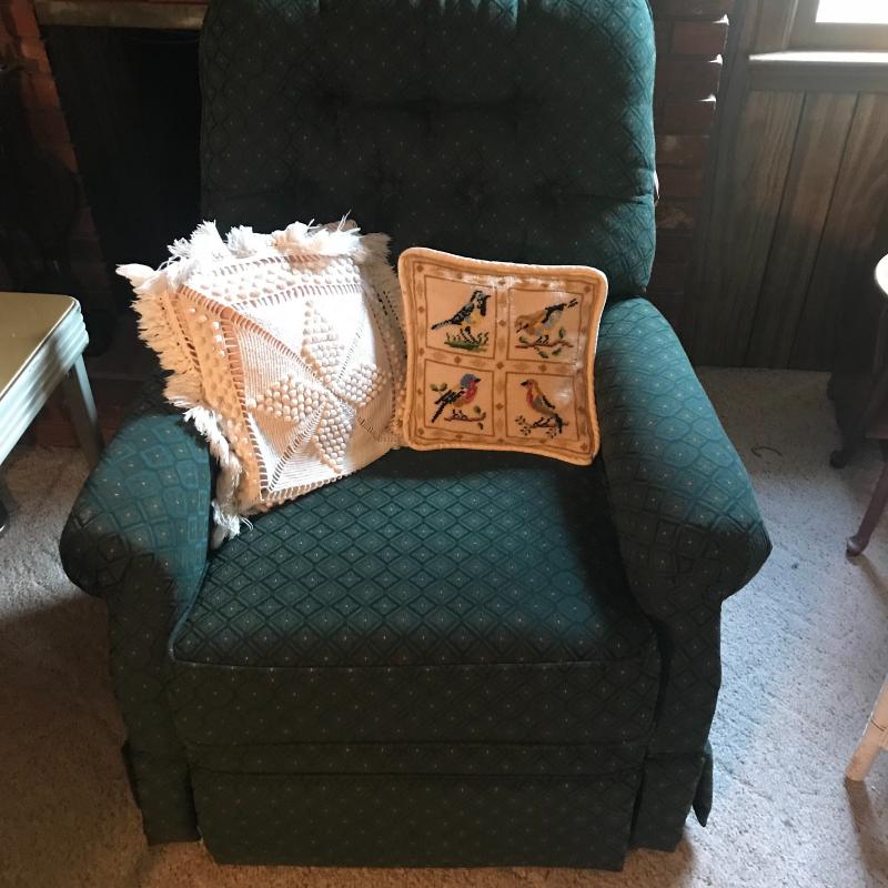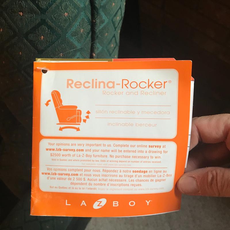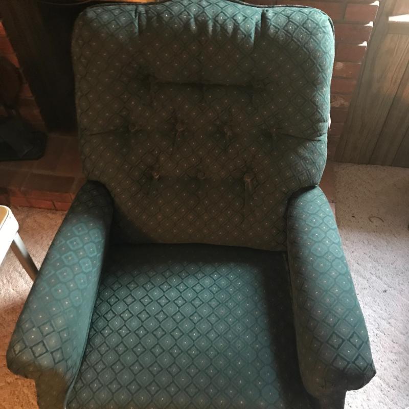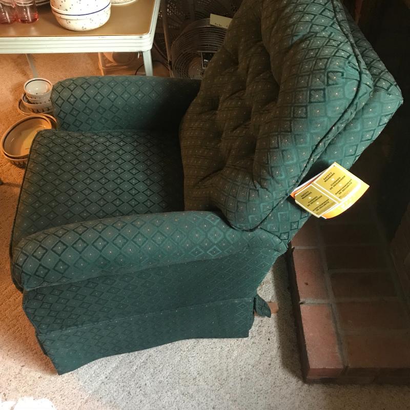 Brand new dark green rocker recliner by Lazy-Boy. This piece is in perfect new condition and measures 29” x26” x38”. Two small decorative throw pillows included. Local pick up only.