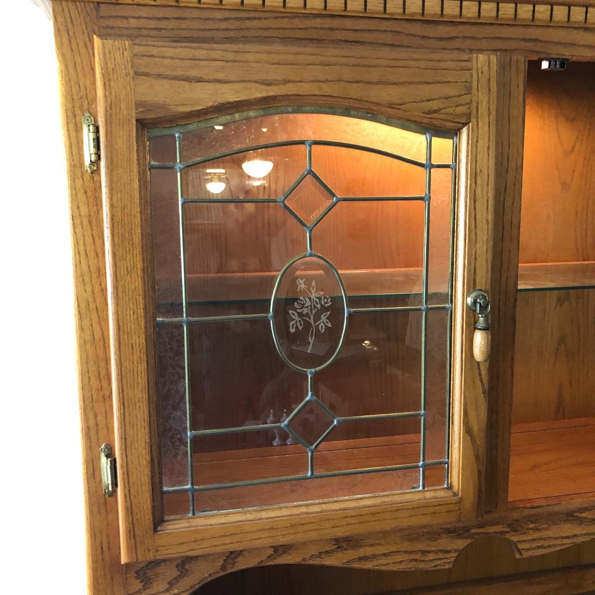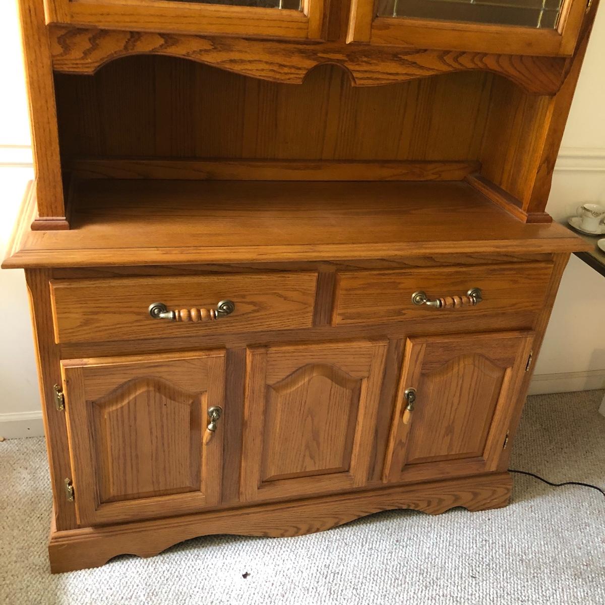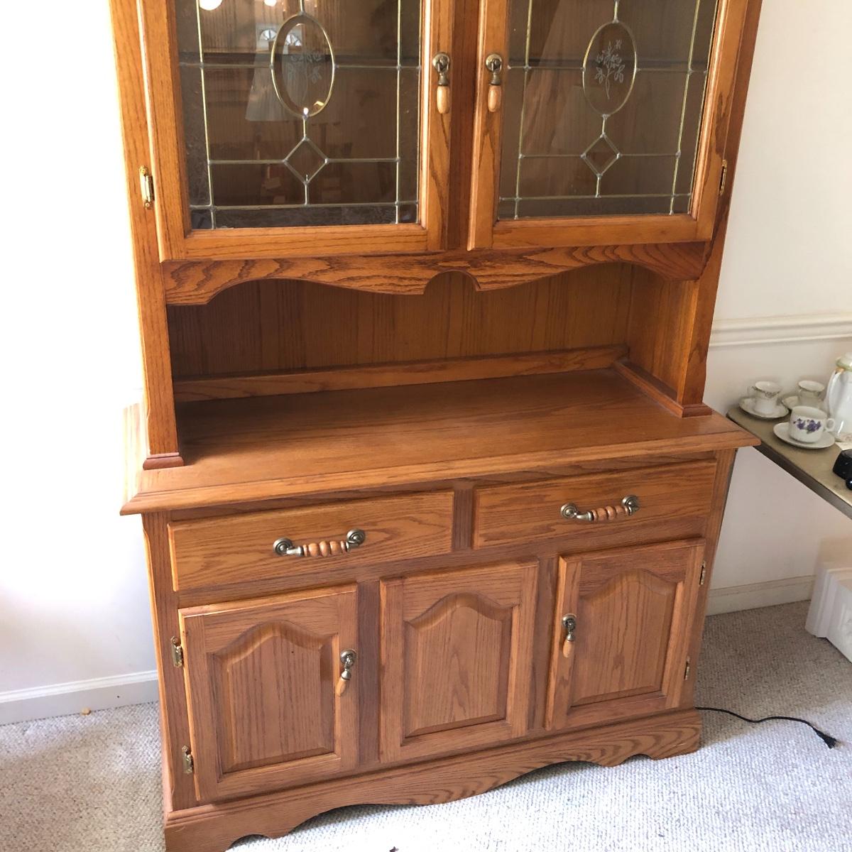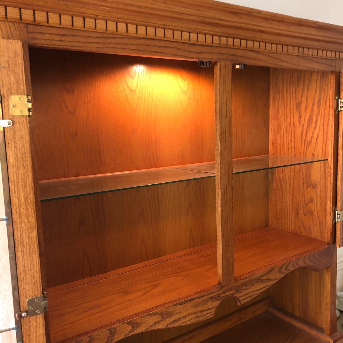 Display your China in style with this lighted China hutch. Hutch has two wood and glass doors on top with light. Also has two drawers and two door cabinet underneath. Hutch appears to come apart with the removal of two braces for easy loading or so you can use just the bottom of you don’t need all the storage. Hutch measures 18.5” x 48.5” x 77.5”. Bring help item is substantial.