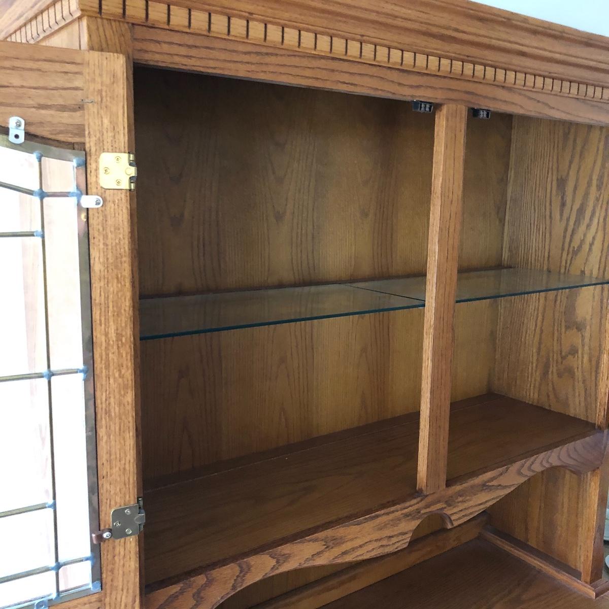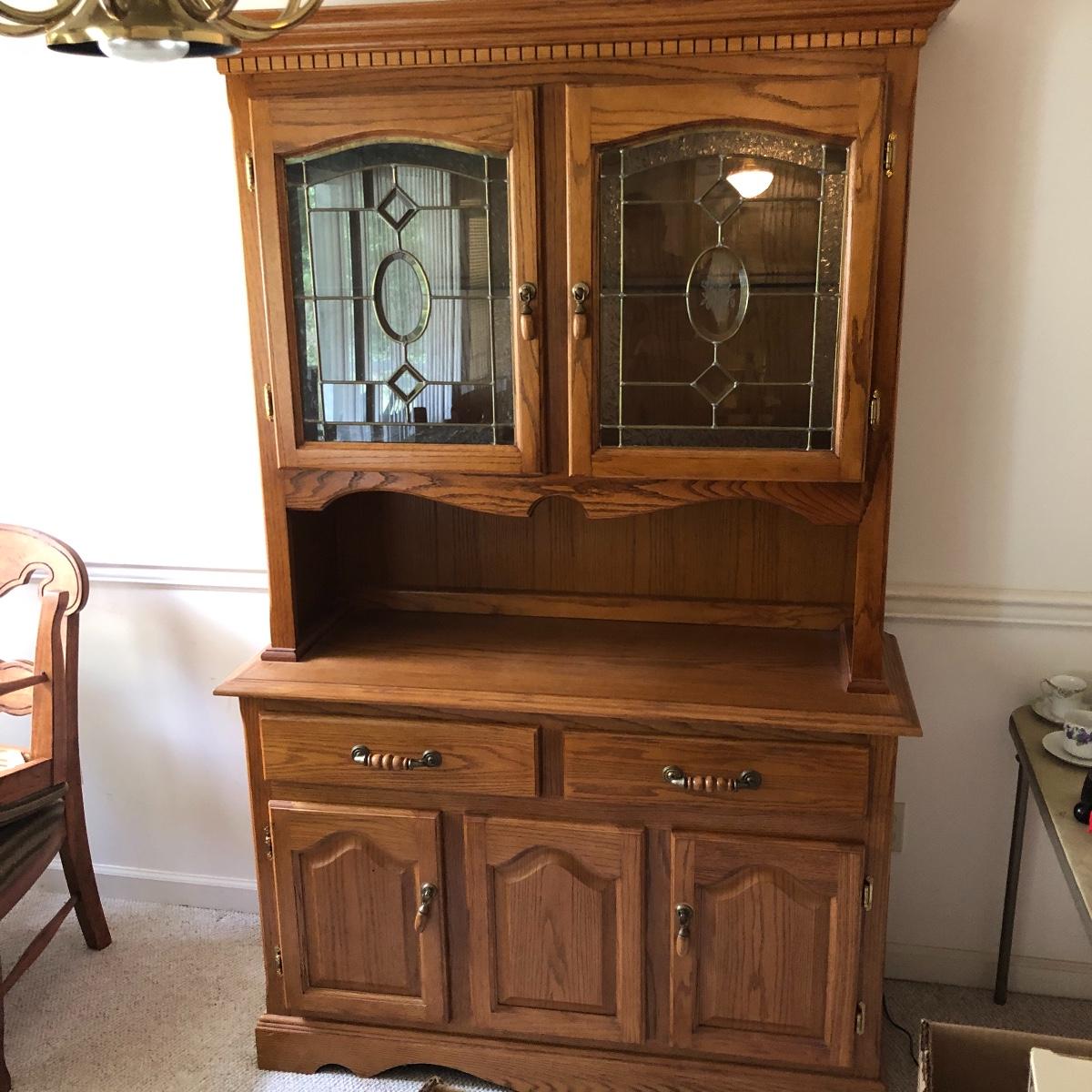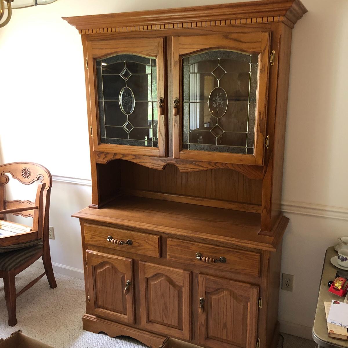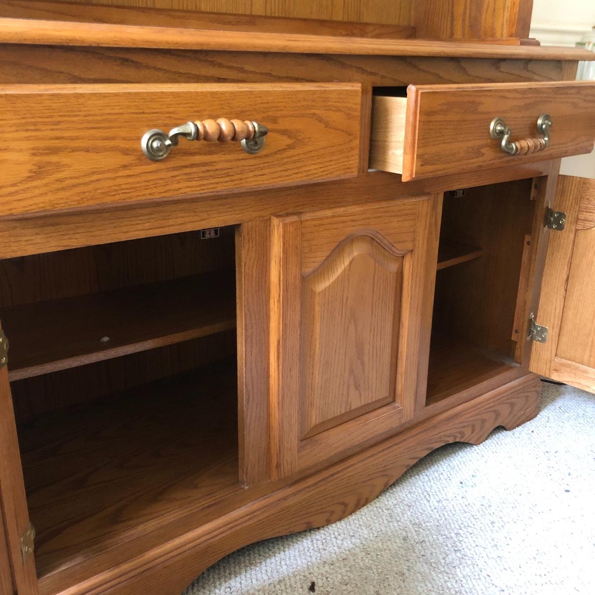 Display your China in style with this lighted China hutch. Hutch has two wood and glass doors on top with light. Also has two drawers and two door cabinet underneath. Hutch appears to come apart with the removal of two braces for easy loading or so you can use just the bottom of you don’t need all the storage. Hutch measures 18.5” x 48.5” x 77.5”. Bring help item is substantial.