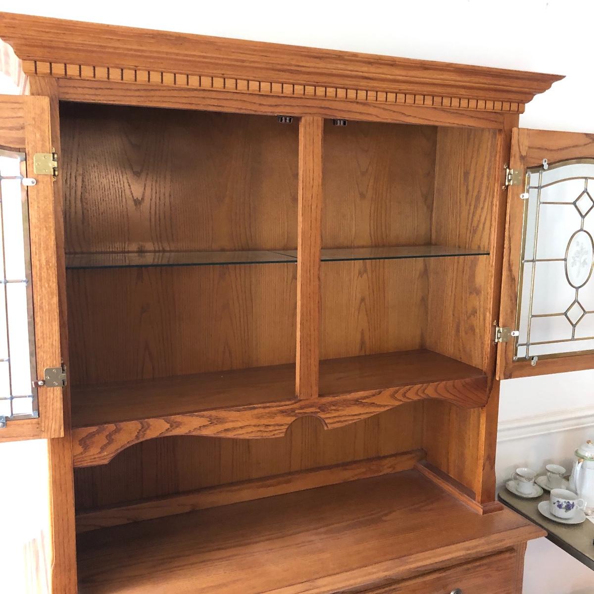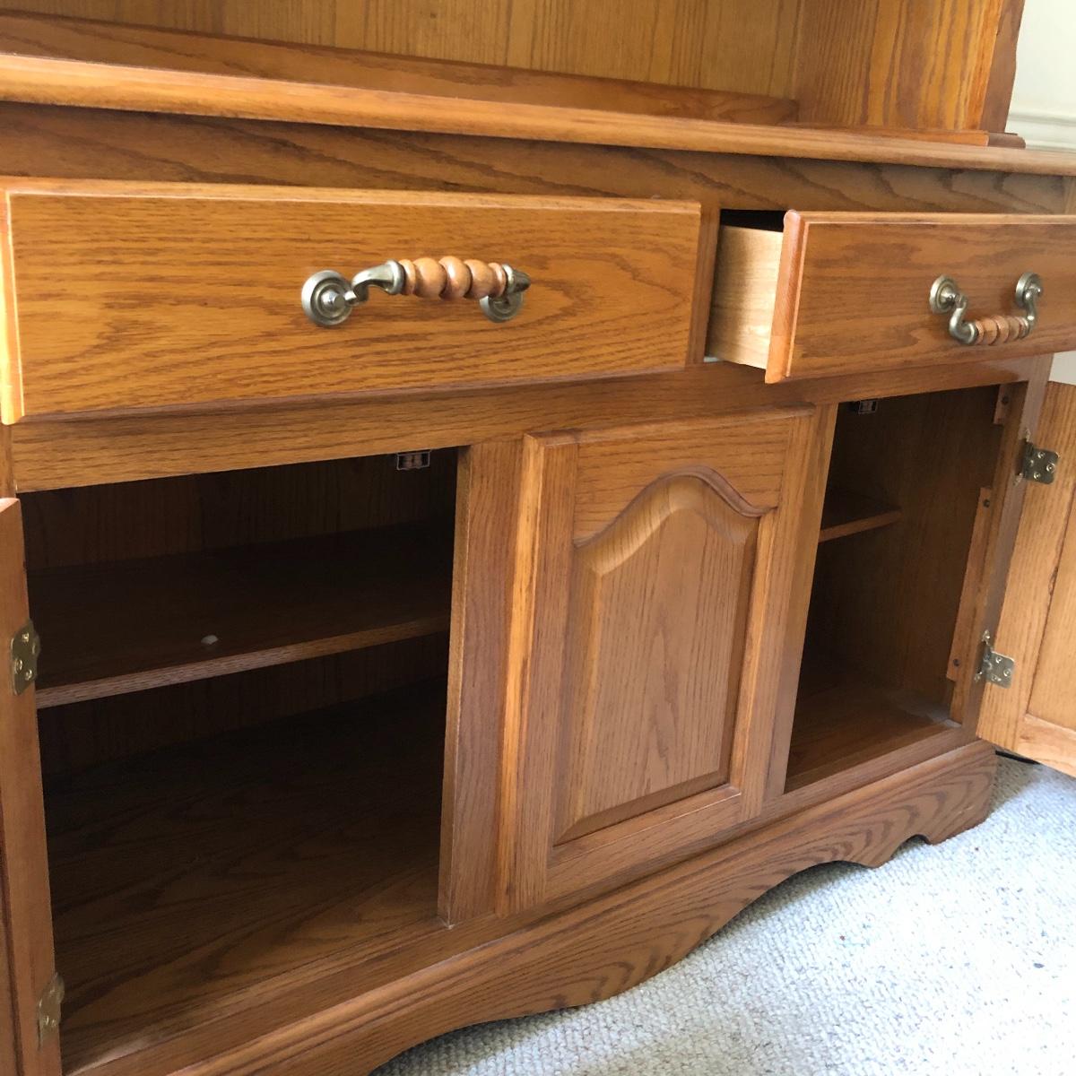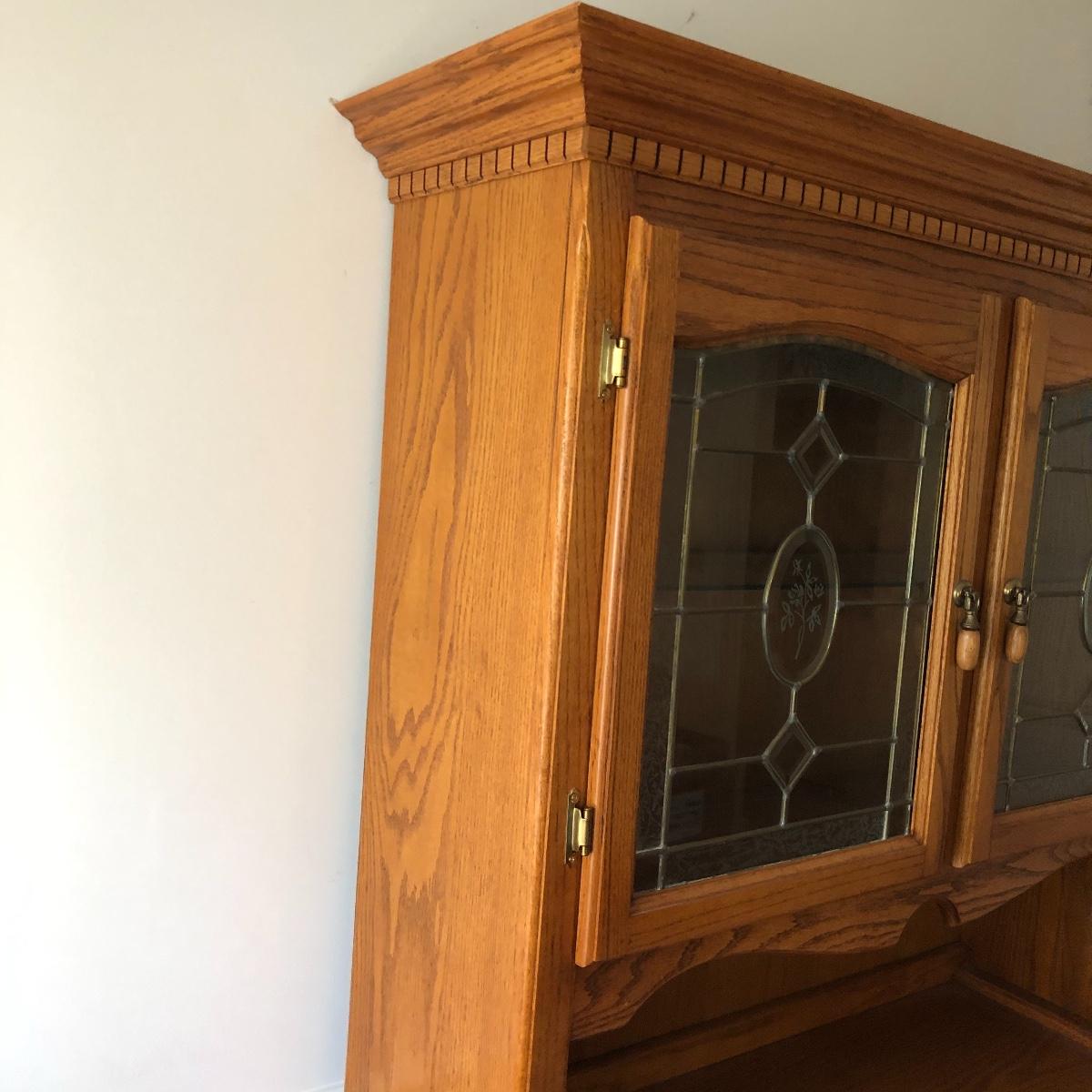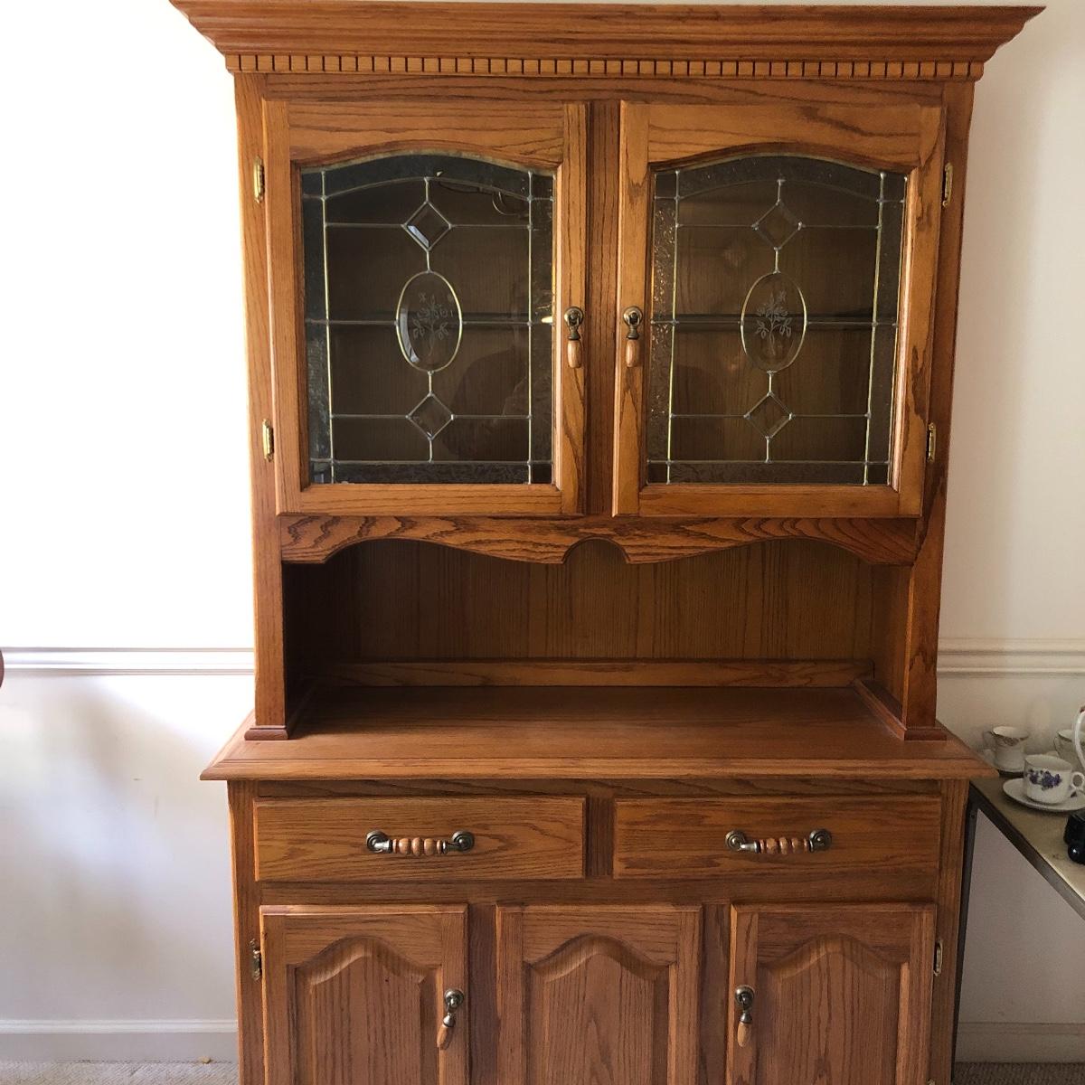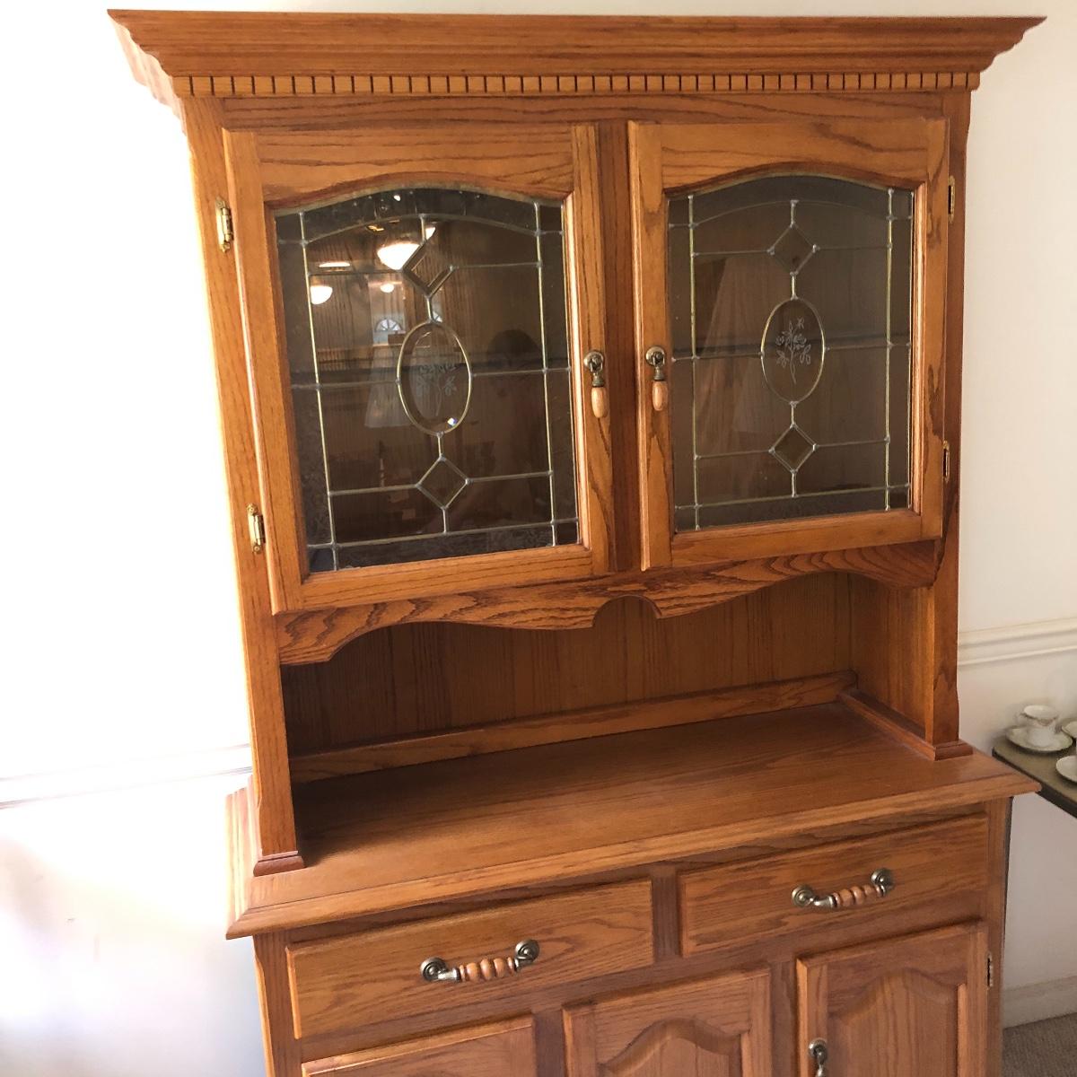 Display your China in style with this lighted China hutch. Hutch has two wood and glass doors on top with light. Also has two drawers and two door cabinet underneath. Hutch appears to come apart with the removal of two braces for easy loading or so you can use just the bottom of you don’t need all the storage. Hutch measures 18.5” x 48.5” x 77.5”. Bring help item is substantial.