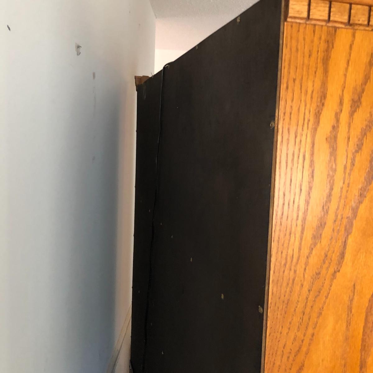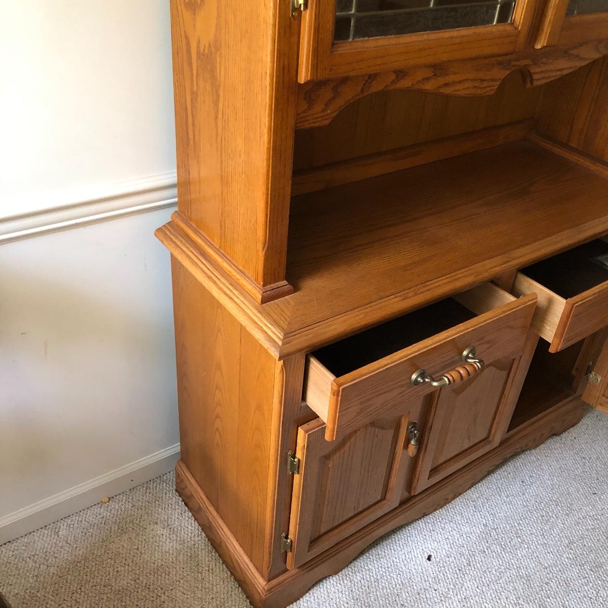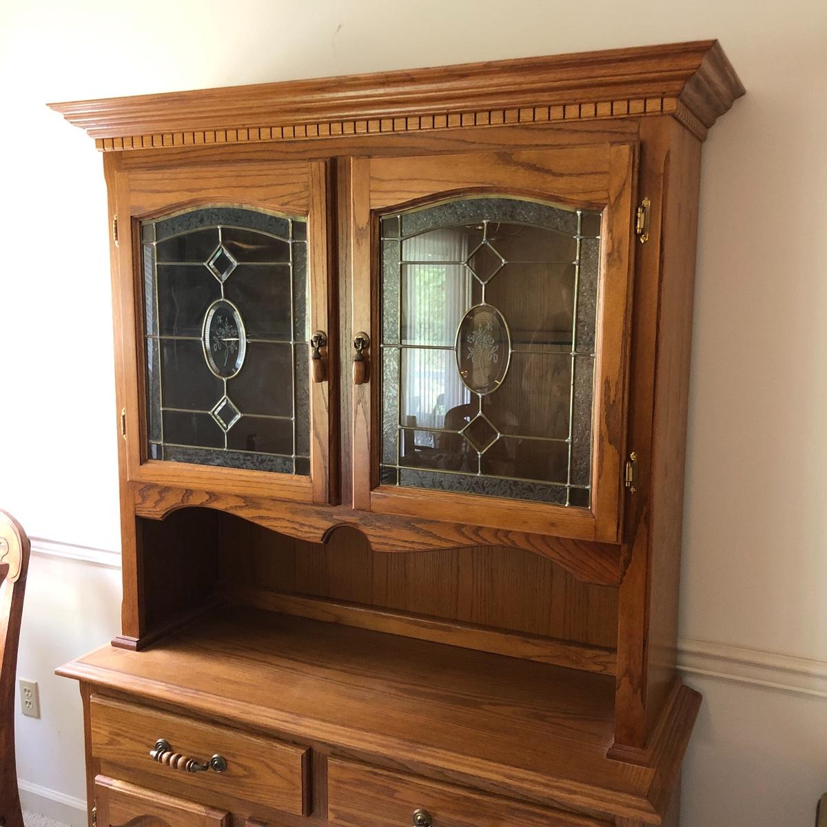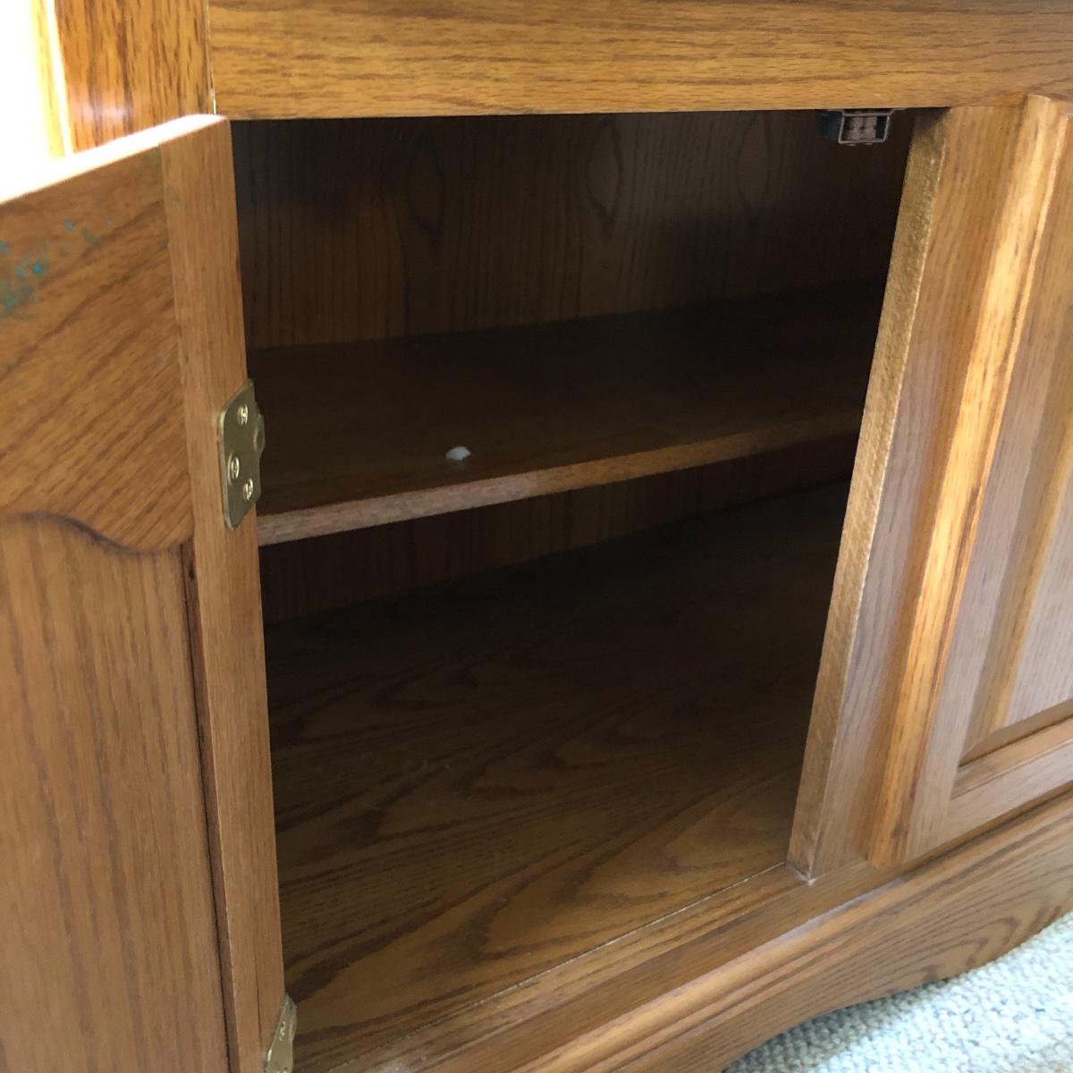 Display your China in style with this lighted China hutch. Hutch has two wood and glass doors on top with light. Also has two drawers and two door cabinet underneath. Hutch appears to come apart with the removal of two braces for easy loading or so you can use just the bottom of you don’t need all the storage. Hutch measures 18.5” x 48.5” x 77.5”. Bring help item is substantial.