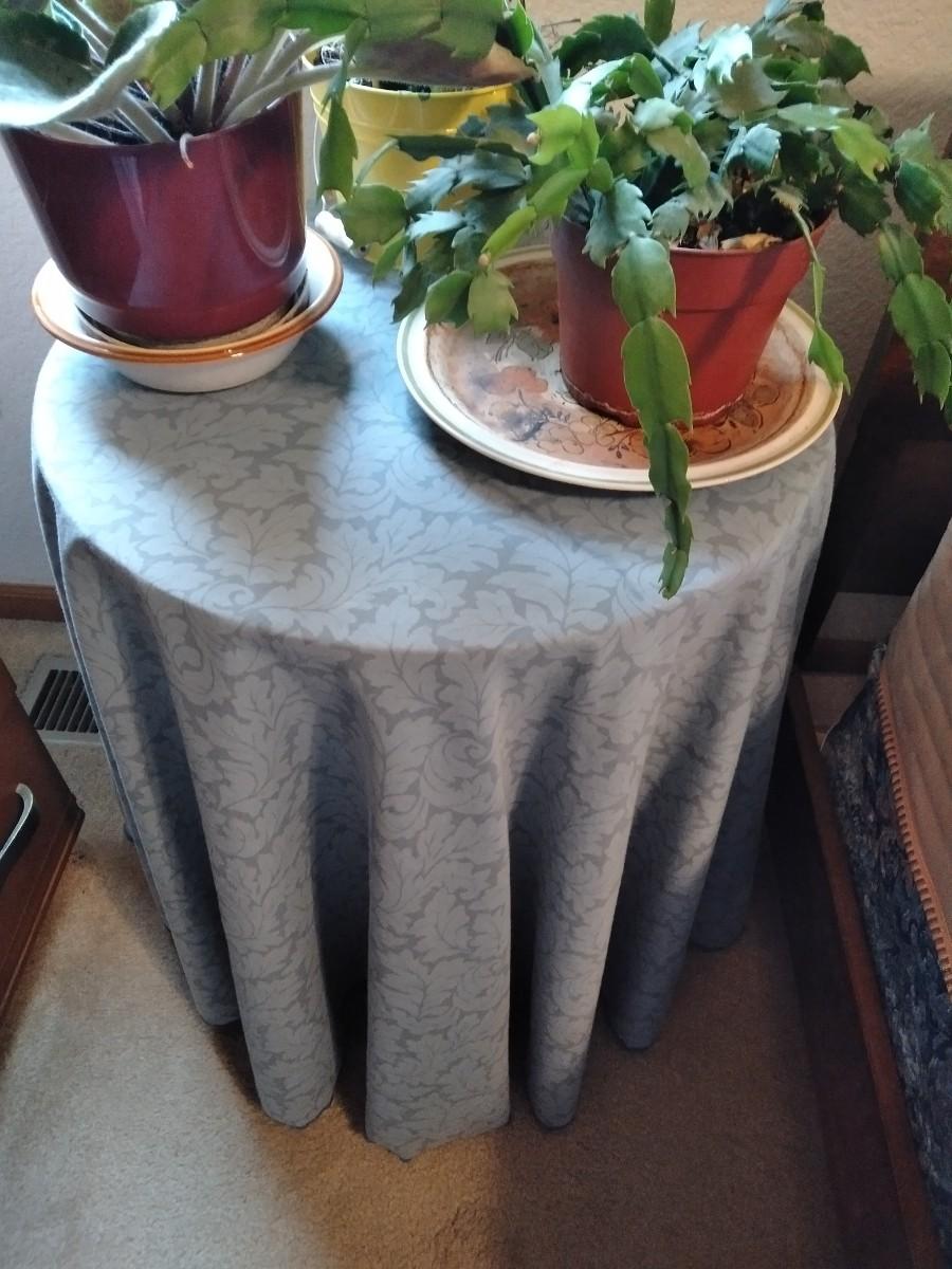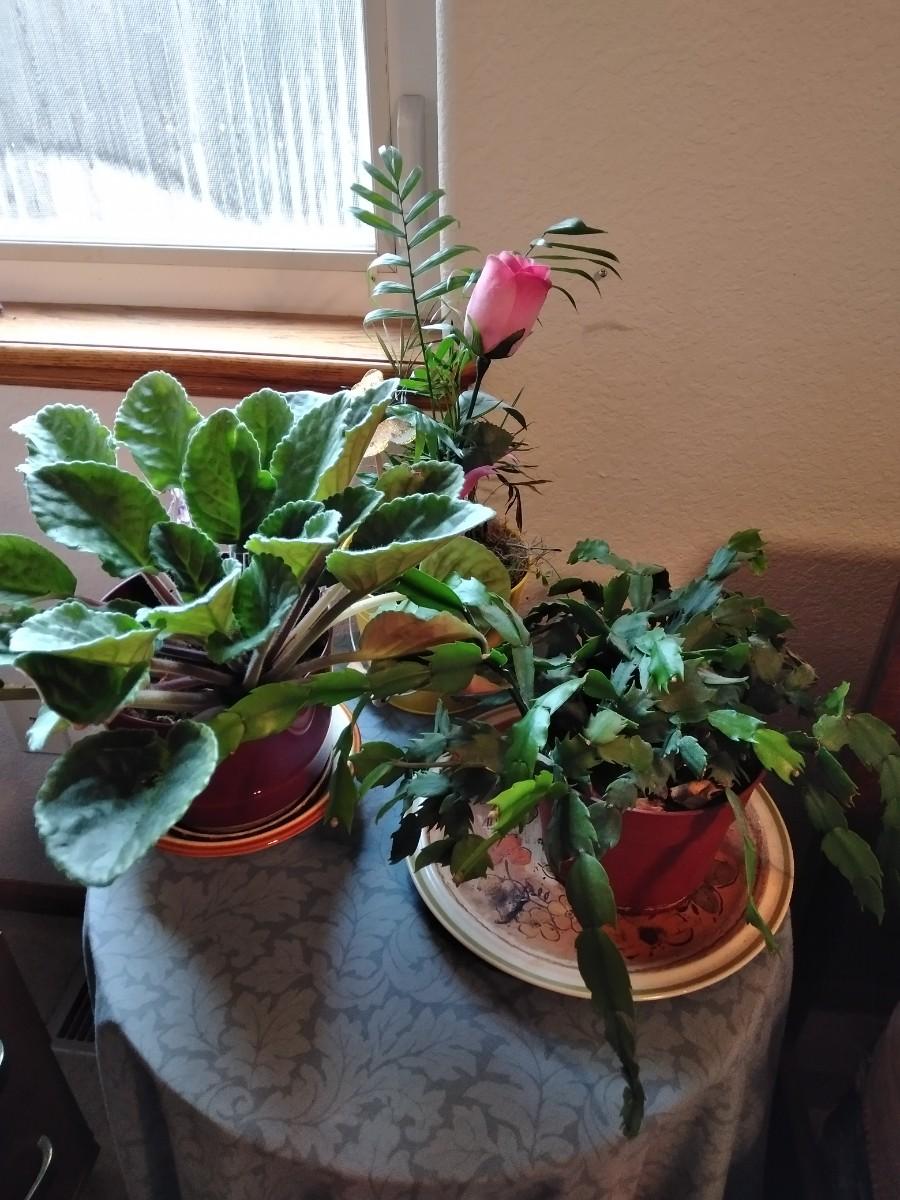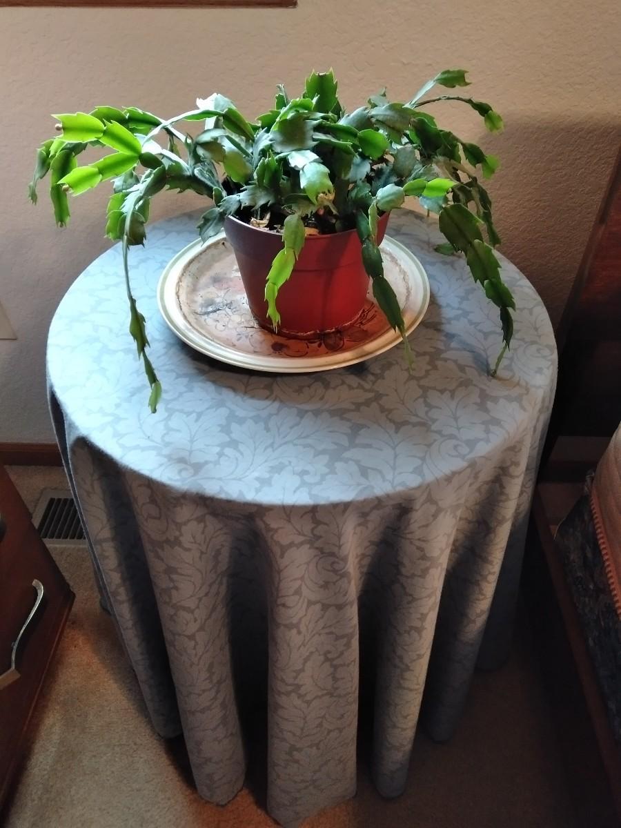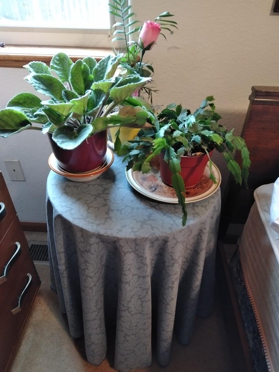 THREE LIVE PLANTS IN POTS ON COVERED SMALL DOWEL LEGGED TABLE.. CHRISTMAS CACTUS ABOUT READY TO BLOOM, LOOKS LIGHT PINK IN COLOR. AFRICAN VIOLET AND PALM LOOKING PLANT