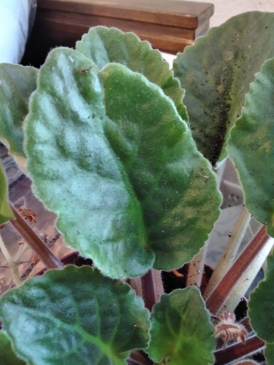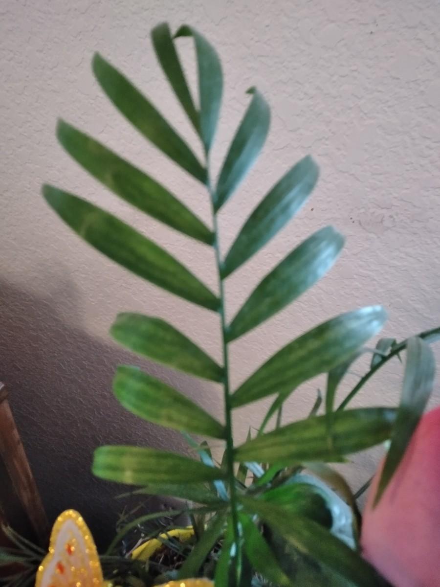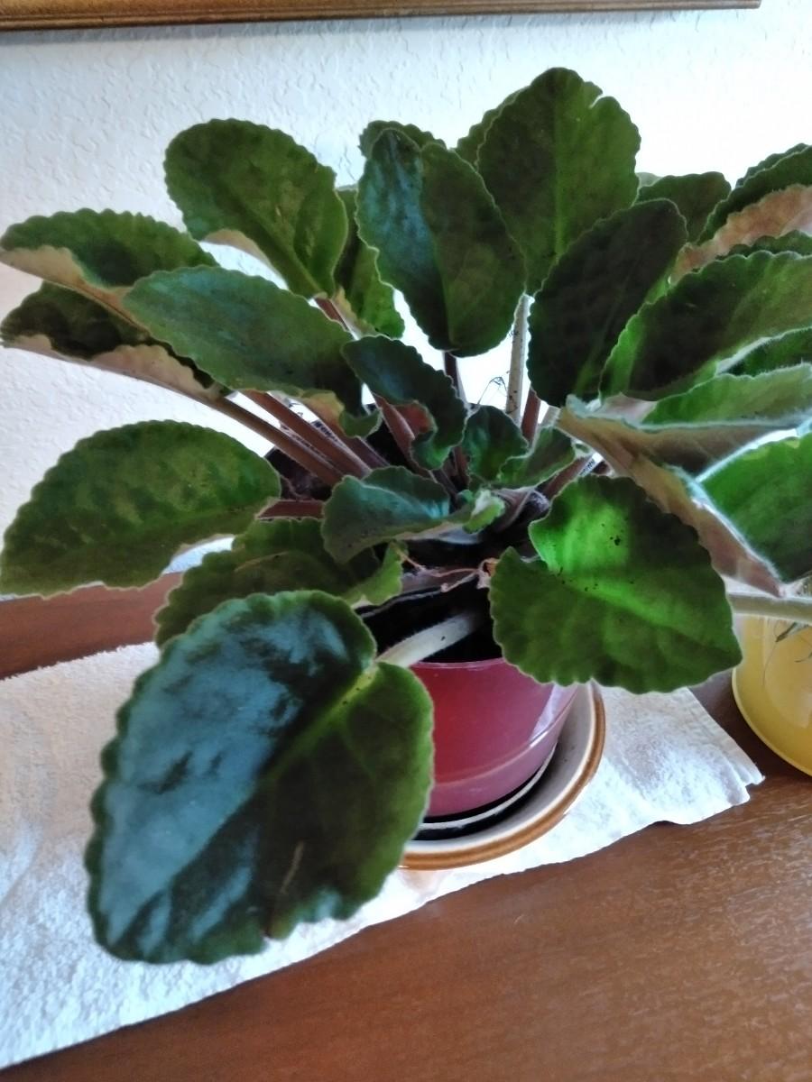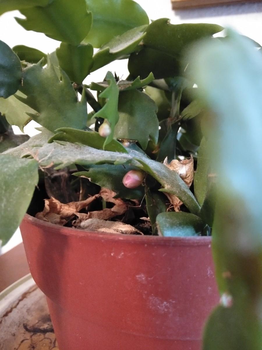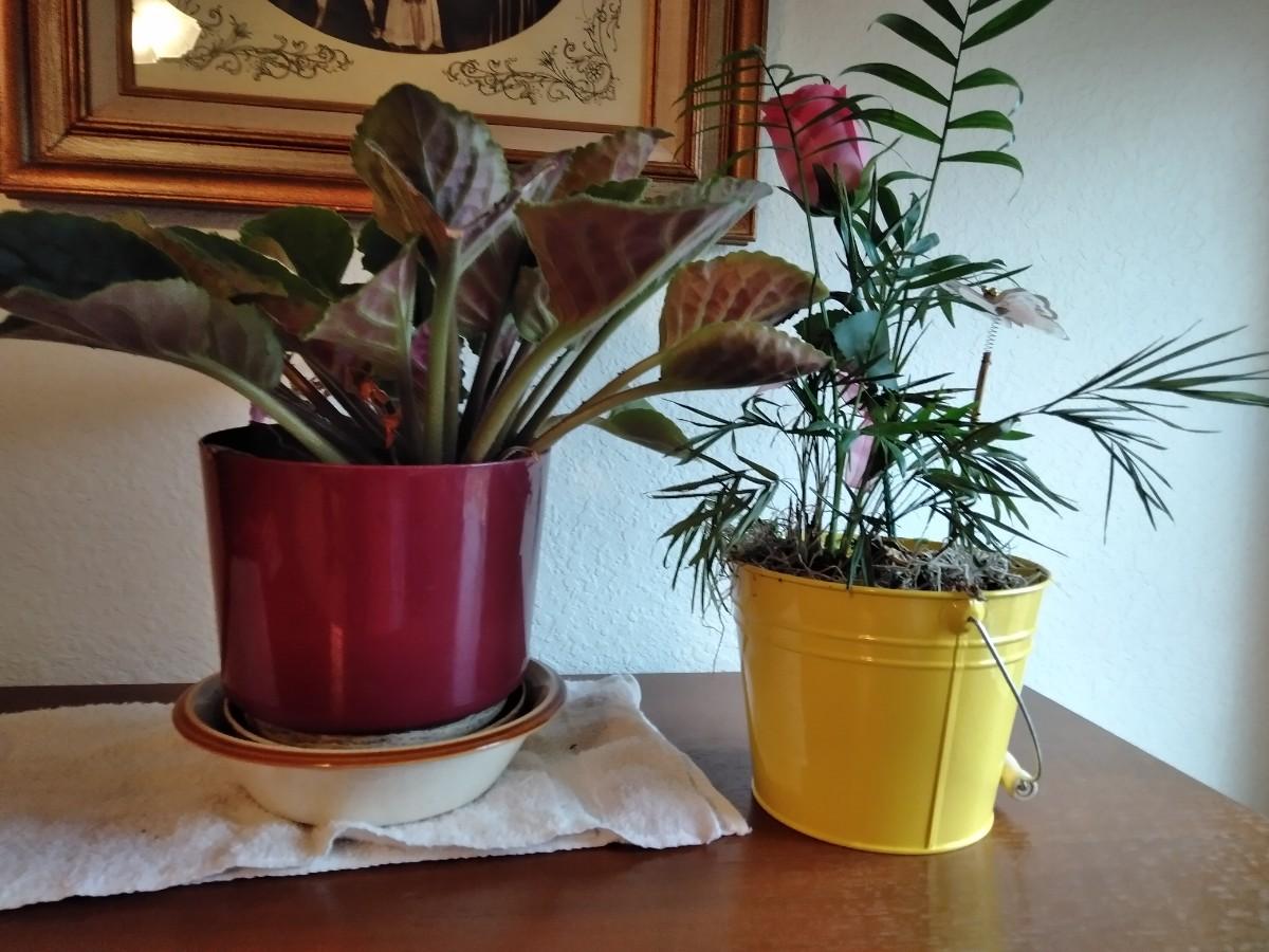 THREE LIVE PLANTS IN POTS ON COVERED SMALL DOWEL LEGGED TABLE.. CHRISTMAS CACTUS ABOUT READY TO BLOOM, LOOKS LIGHT PINK IN COLOR. AFRICAN VIOLET AND PALM LOOKING PLANT