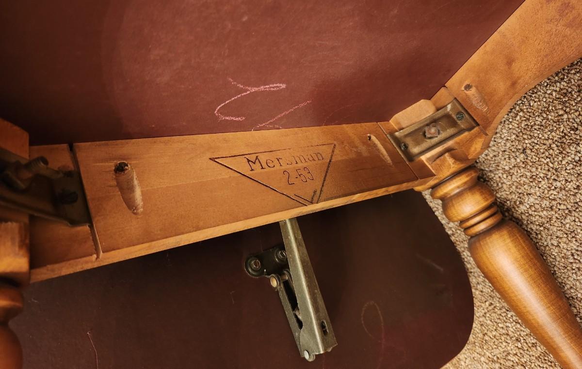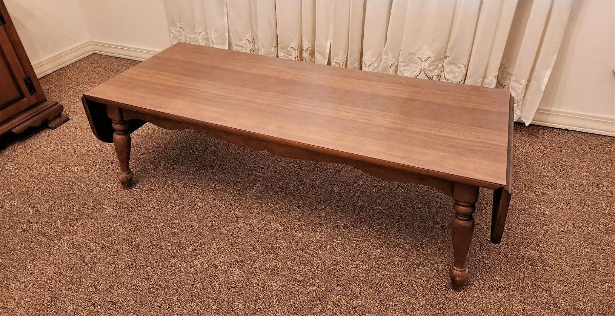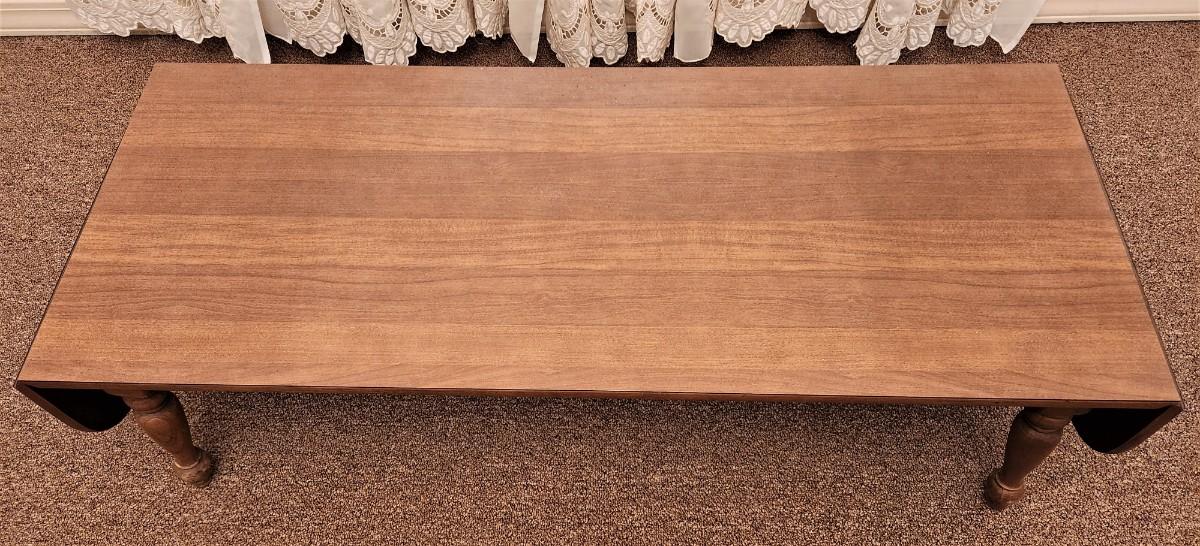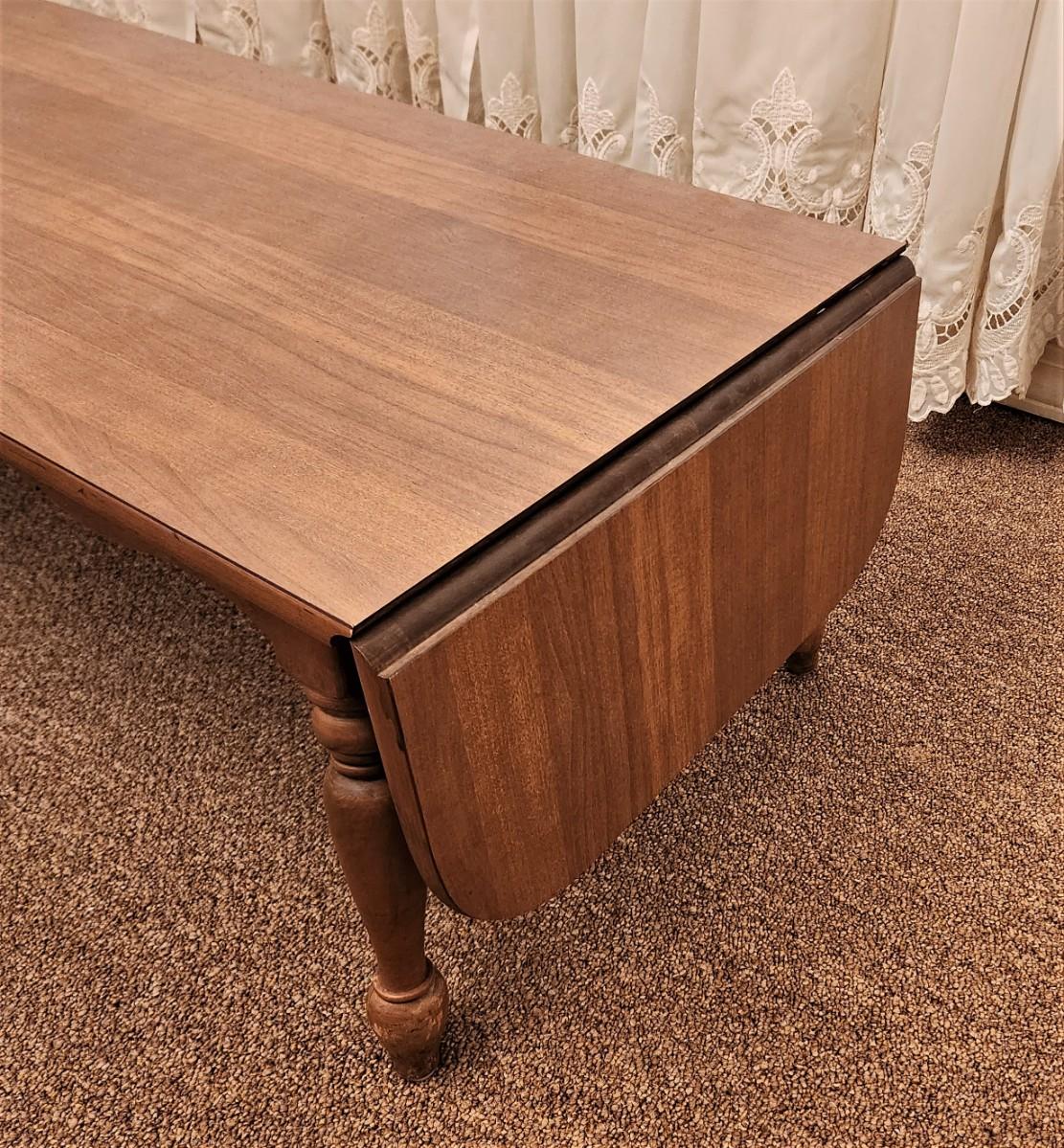 Midcentury colonial style coffee table by MERSMAN (signed on bottom). Unusual drop leaf on each end, 19" across, 49" long with ends down, 66" long fully extended. Note cosmetic damage to foot.