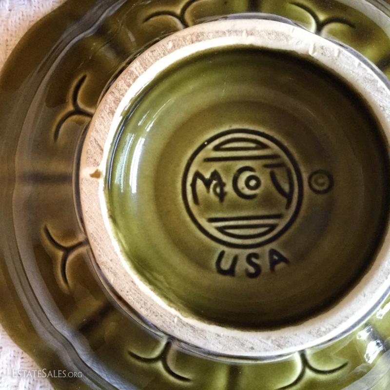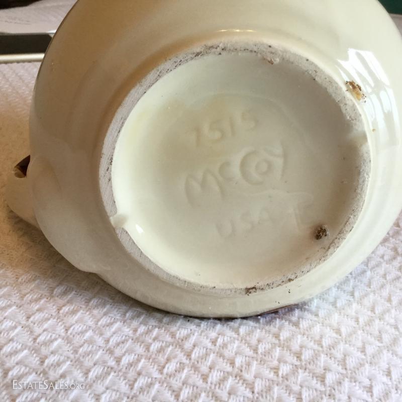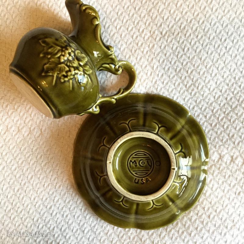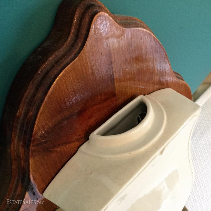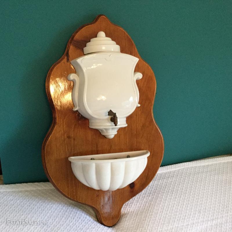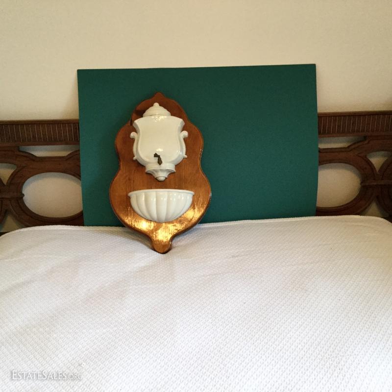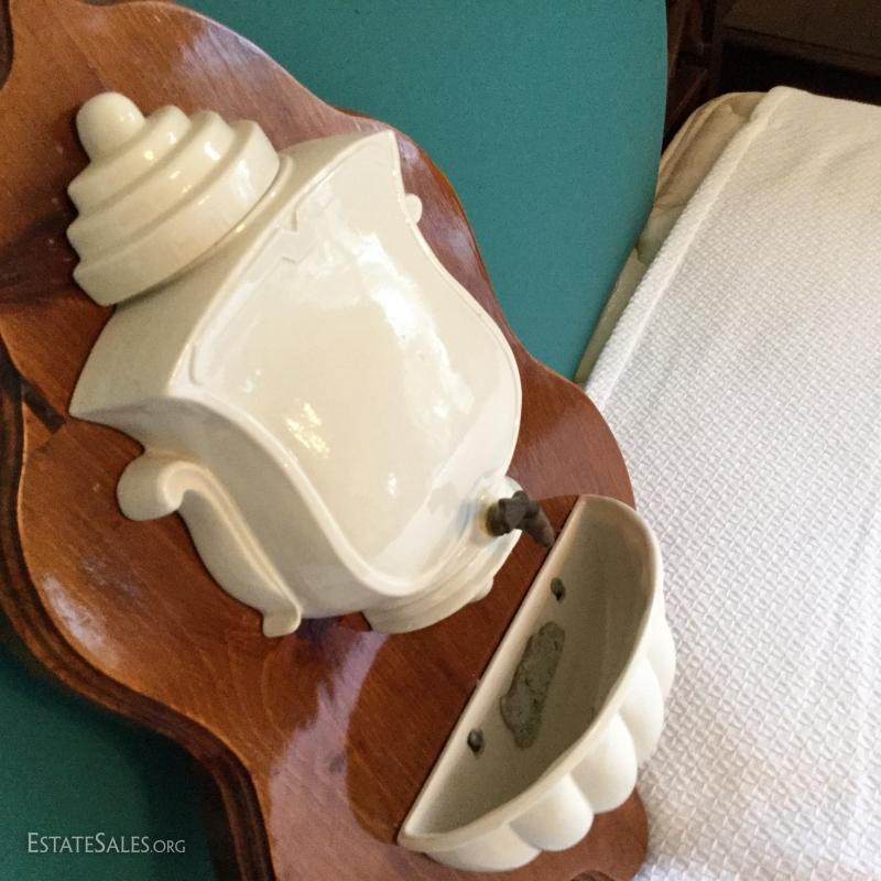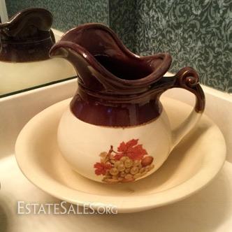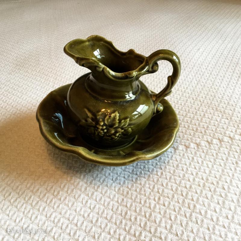 Wood Plaque with white Ceramic cistern and bowl attached measures 24" , cream & brown pitcher with grape leaves image with matching bowl marked McCoy and small olive green pitcher 5.5" tall and bowl (bowl marked McCoy).