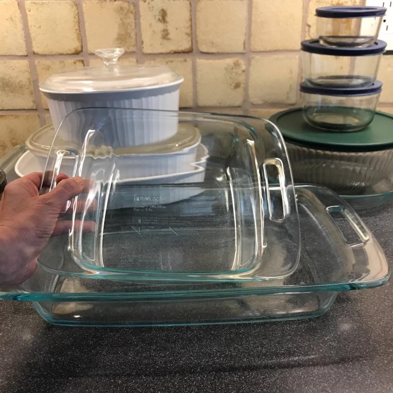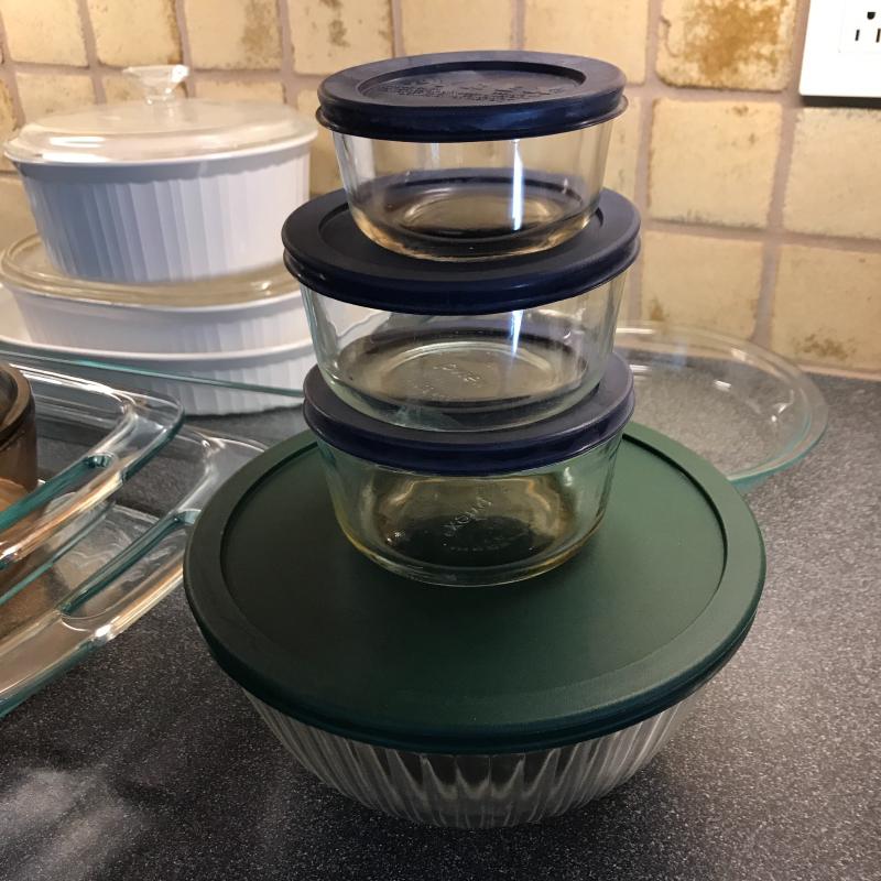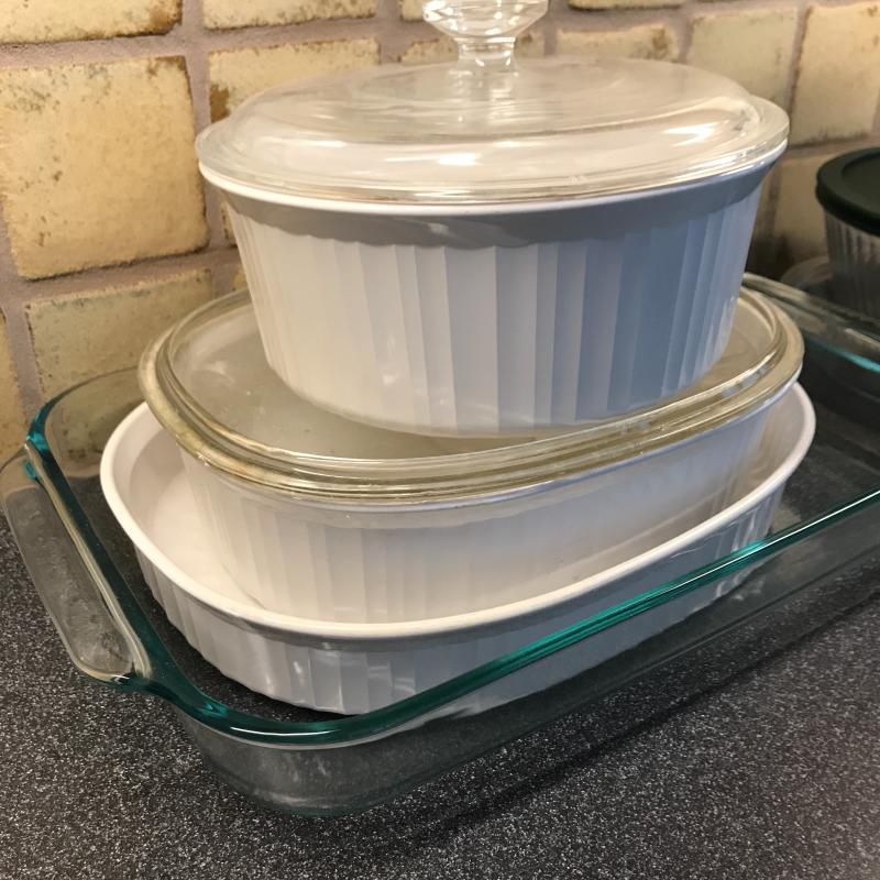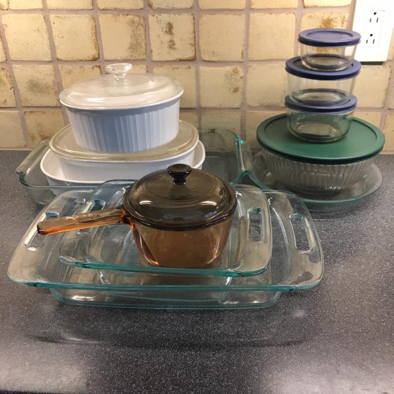 Several pieces of cookware and storage by Pyrex and others. Some have lids. Various sizes. See photos. No shipping. Local pick up only in Asheville, NC.