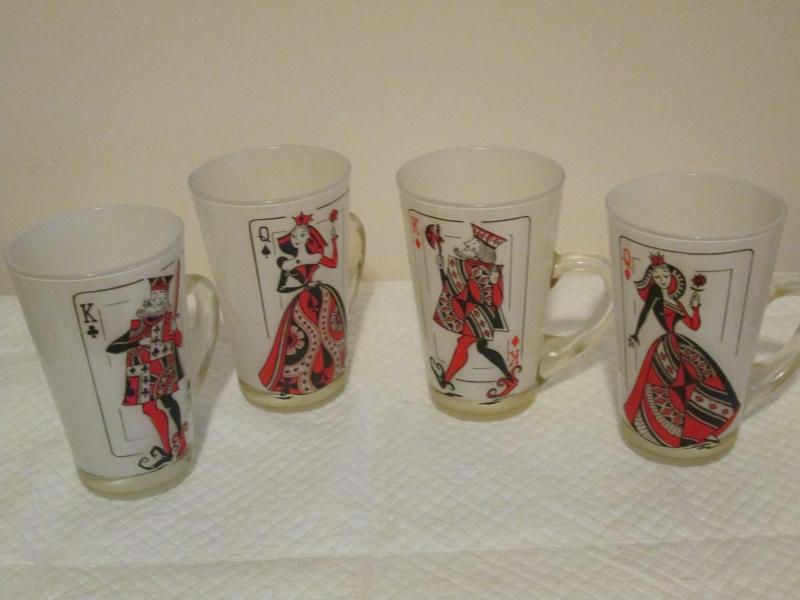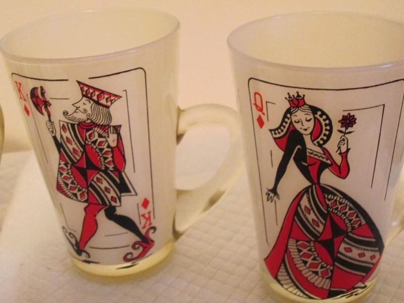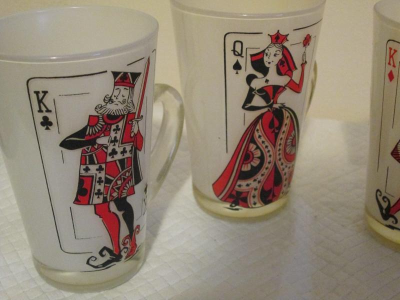 Set 4 Vintage Playing Cards Bar Tumblers - White Cased Glass w/ Kings & Queens Face Card Drinking Glasses