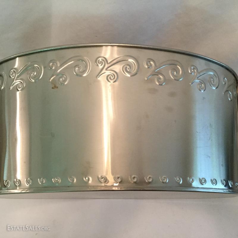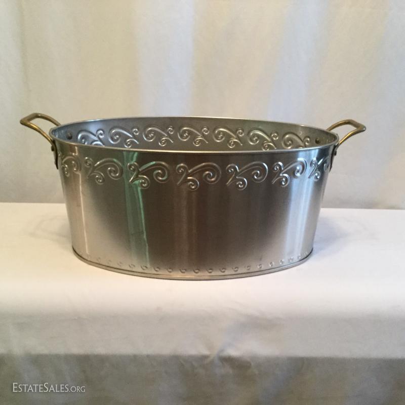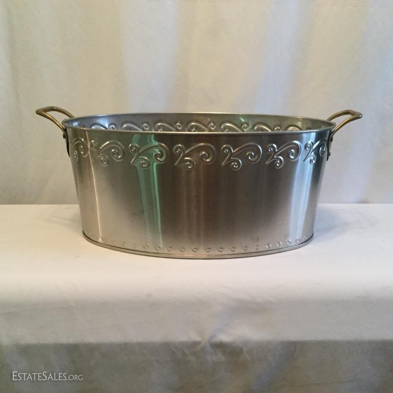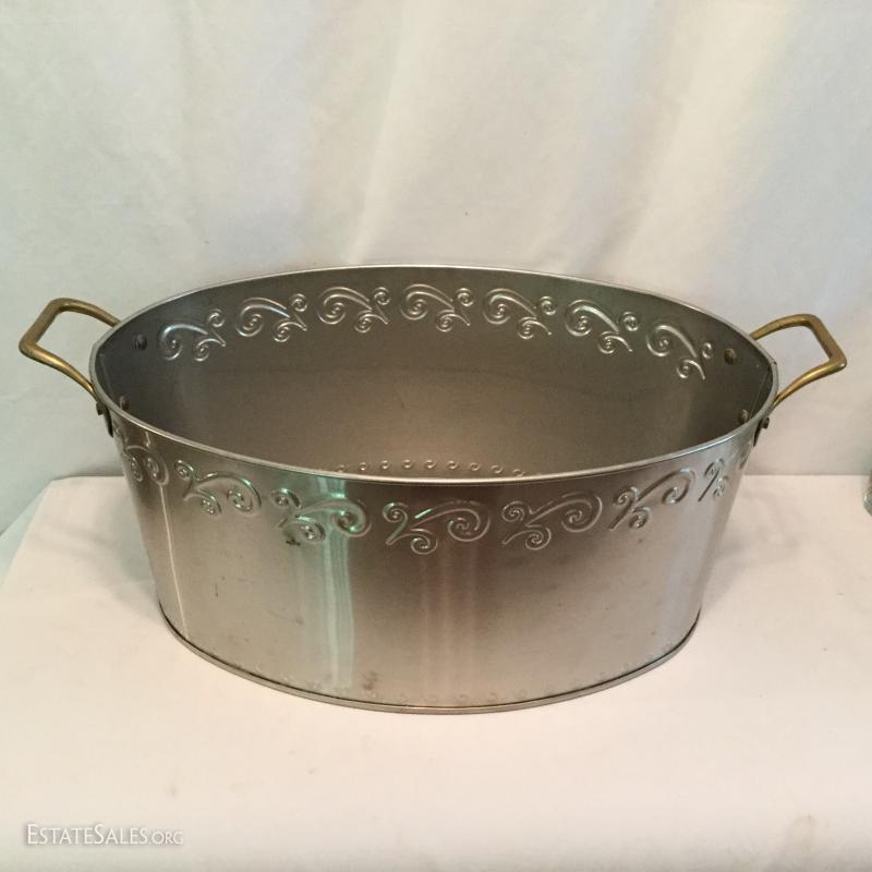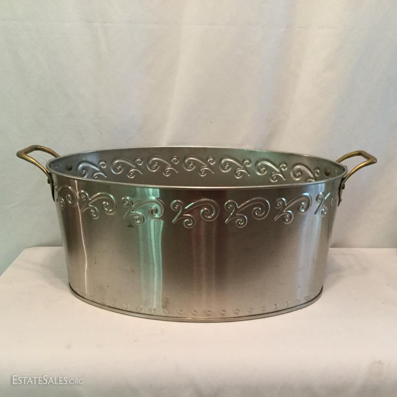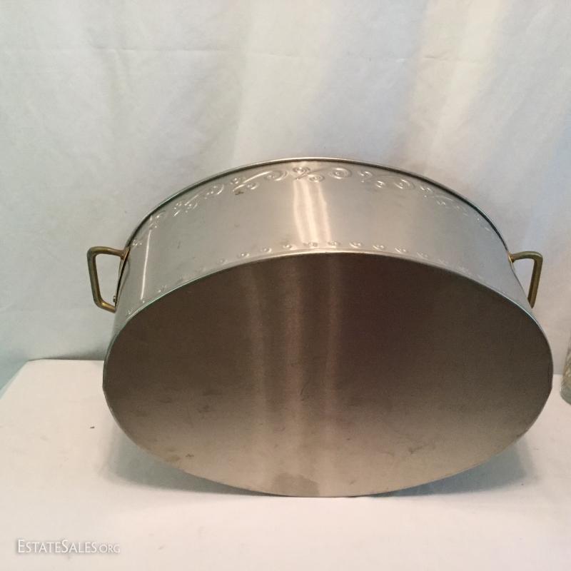 Silver-plated bucket with solid brass handles. Measures 25l x 14.5"w x 10"h. Lot avaialable for pick up in Saluda, NC.