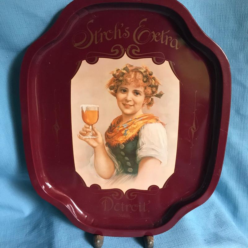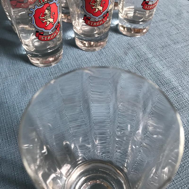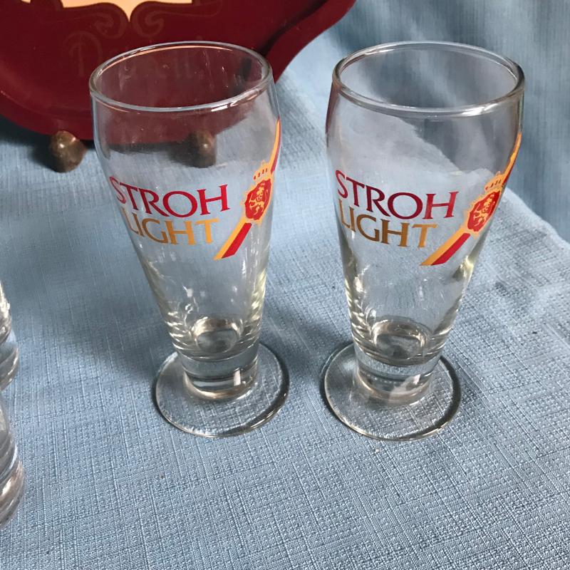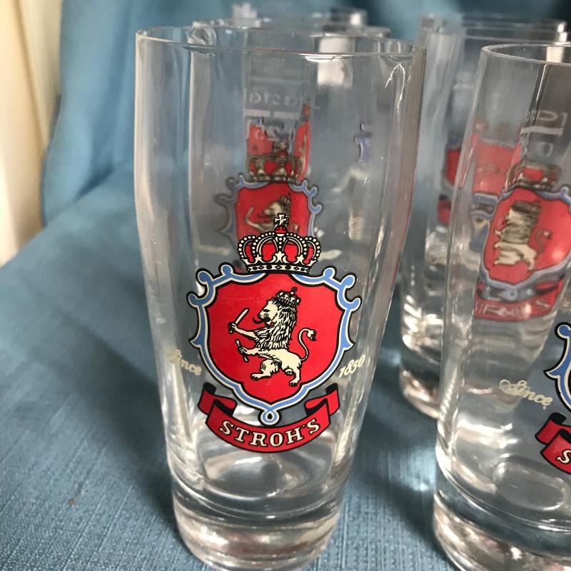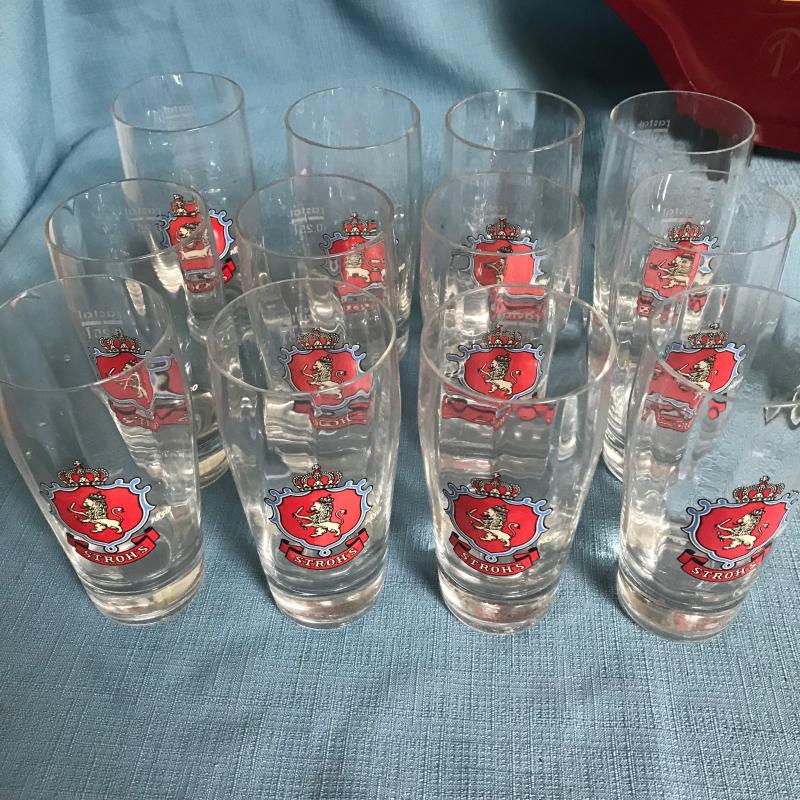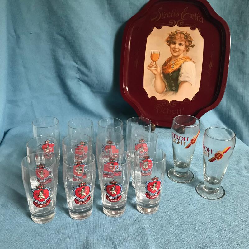 Set of 14 Stroh beer glasses. 12 of which have same design. One has small chip on top. Lot also includes vintage Stroh tray. Shipping or local pick up.