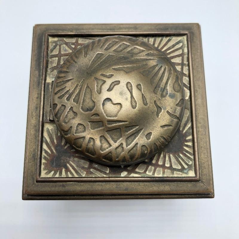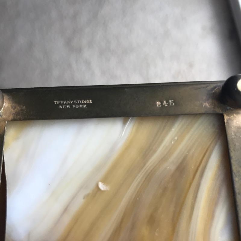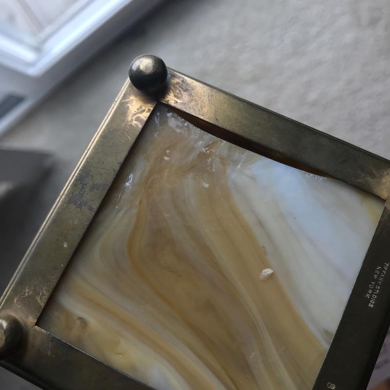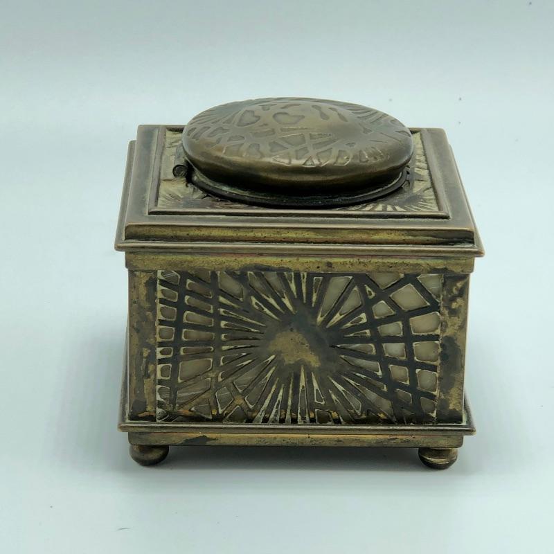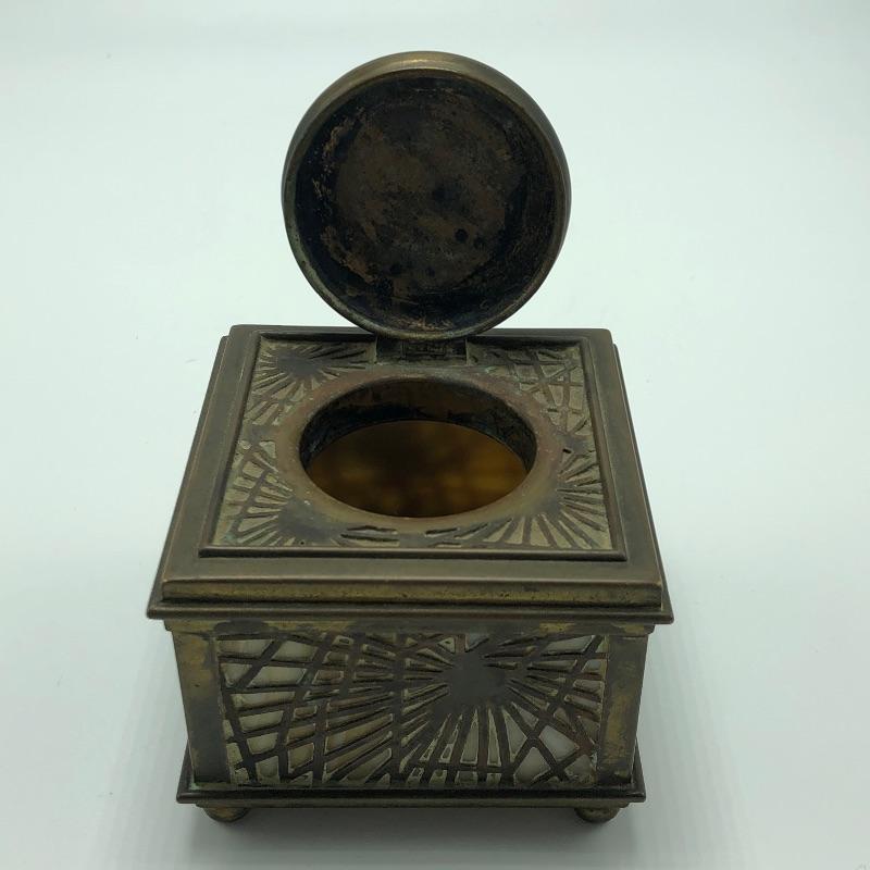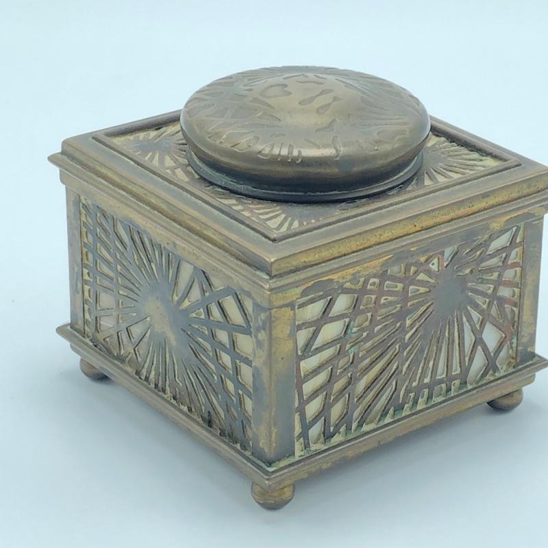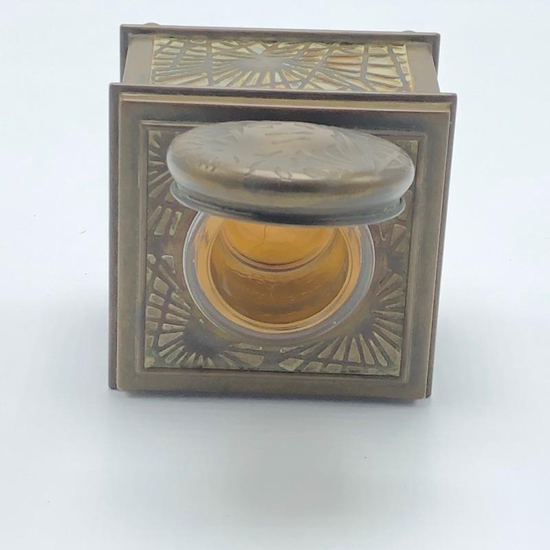 This beautifully detailed brass and glass Tiffany ink well is a must have for any collector or writer looking for a turn of the century muse. Stamped Tiffany Studios New York on bottom. Also bottom glass piece is removable and seems to have been chipped before as it is not a perfect square. See photos.