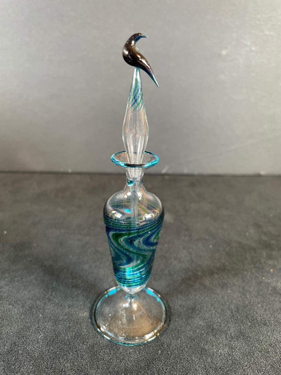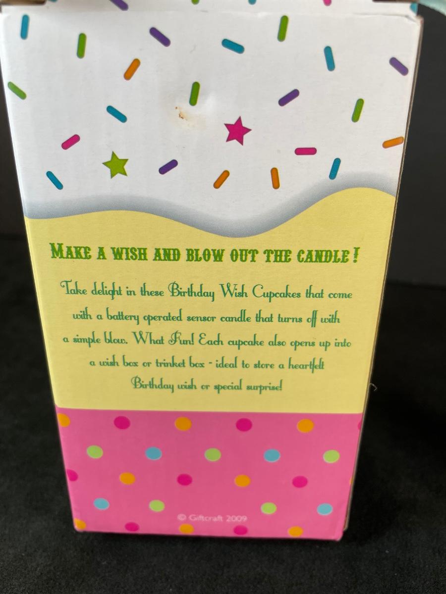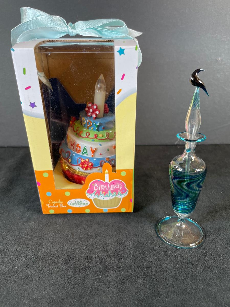 Blown glass perfume bottle 4" tall and new Hapy Birthday cupcake trinket box